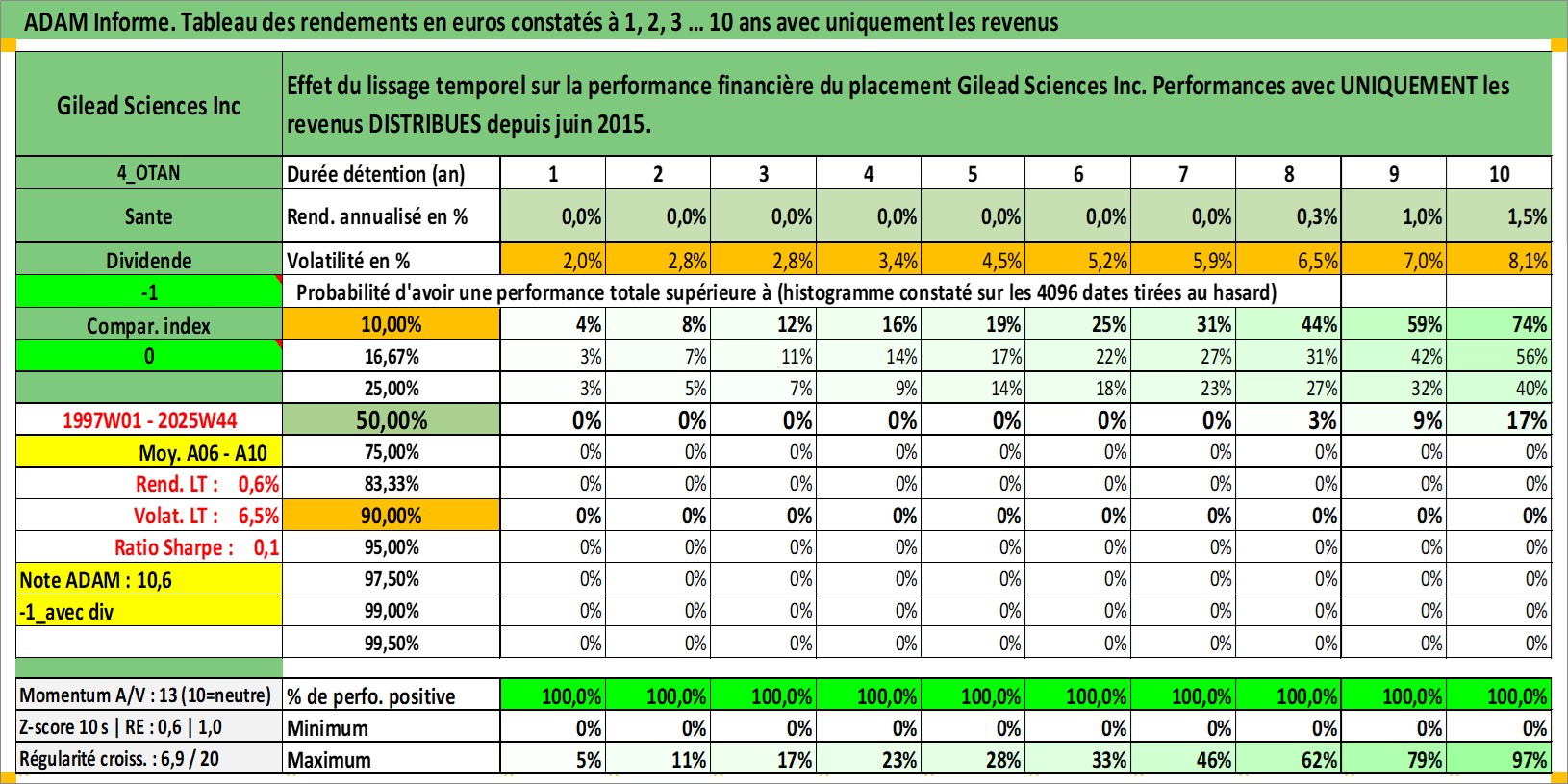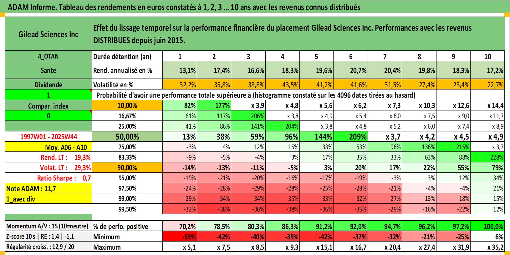 Site dédié aux investisseursPage dédiée sur site financeAnalyse des valorisations hebdomadaires de l'action Gilead Sciences Inc. Cet actif est cote en USD. Les valorisations sont en contrevaleur EURO et couvrent les semaines 1997W01 a 2025W44. Les revenus de cet actif financier sont pris en compte depuis la semaine 2015W24. La note globale ESG de cet actif est estimee a 9.0 (apres rebasage entre 0 et 20).