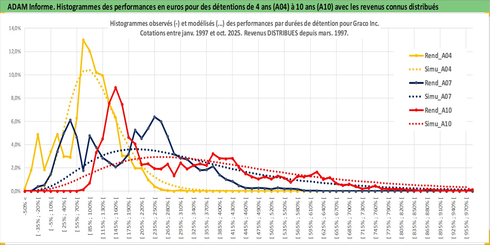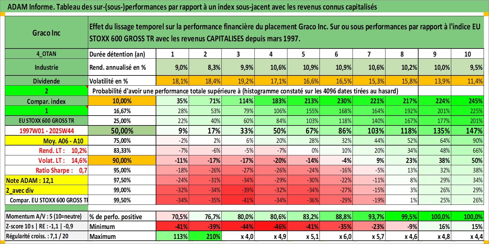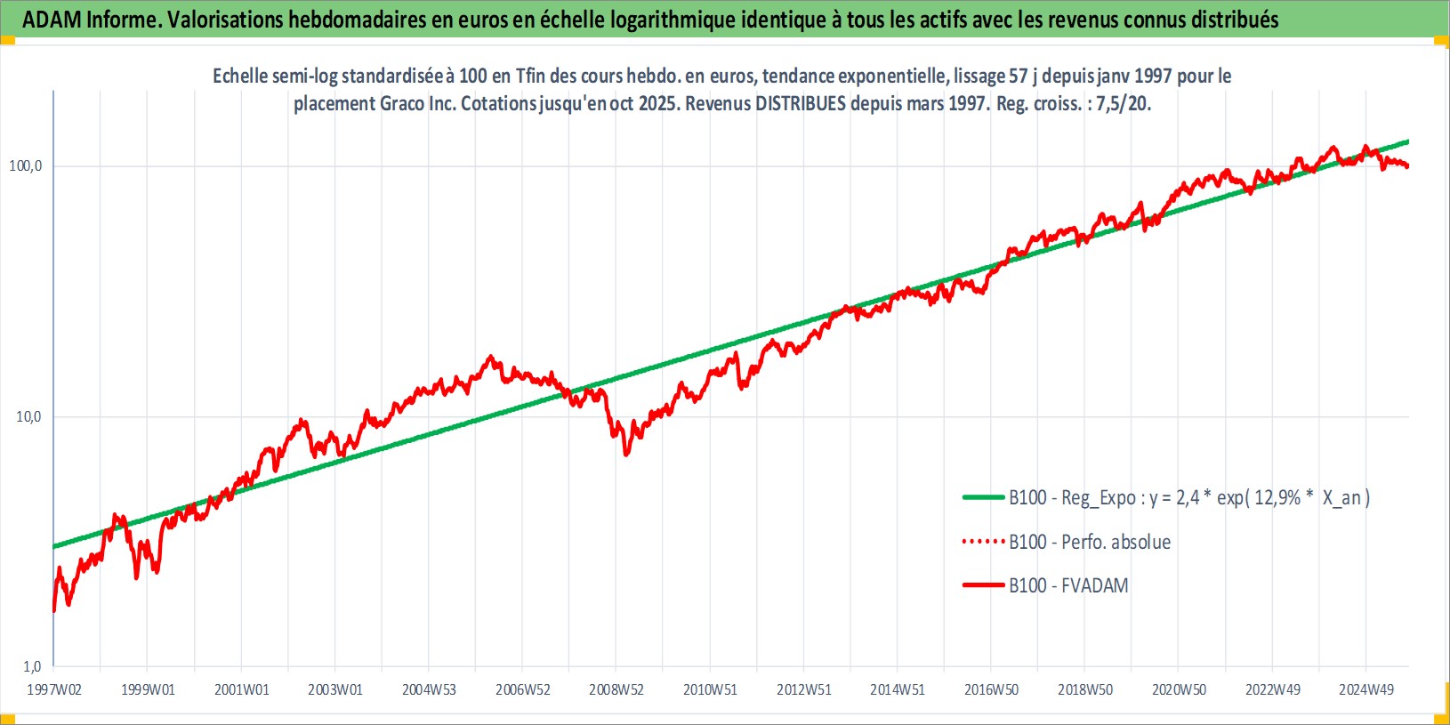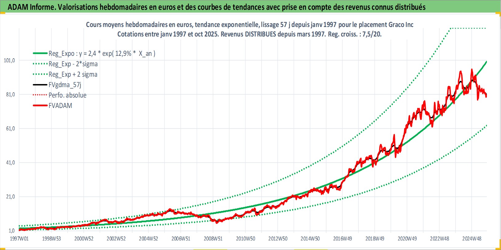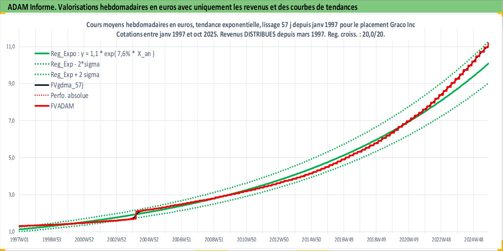 Site dédié aux investisseursPage dédiée sur site financeAnalyse des valorisations hebdomadaires de l'action Graco Inc. Cet actif est cote en USD. Les valorisations sont en contrevaleur EURO et couvrent les semaines 1997W01 a 2025W44. Les revenus de cet actif financier sont pris en compte depuis la semaine 1997W14. La note globale ESG de cet actif est estimee a 5.0 (apres rebasage entre 0 et 20).