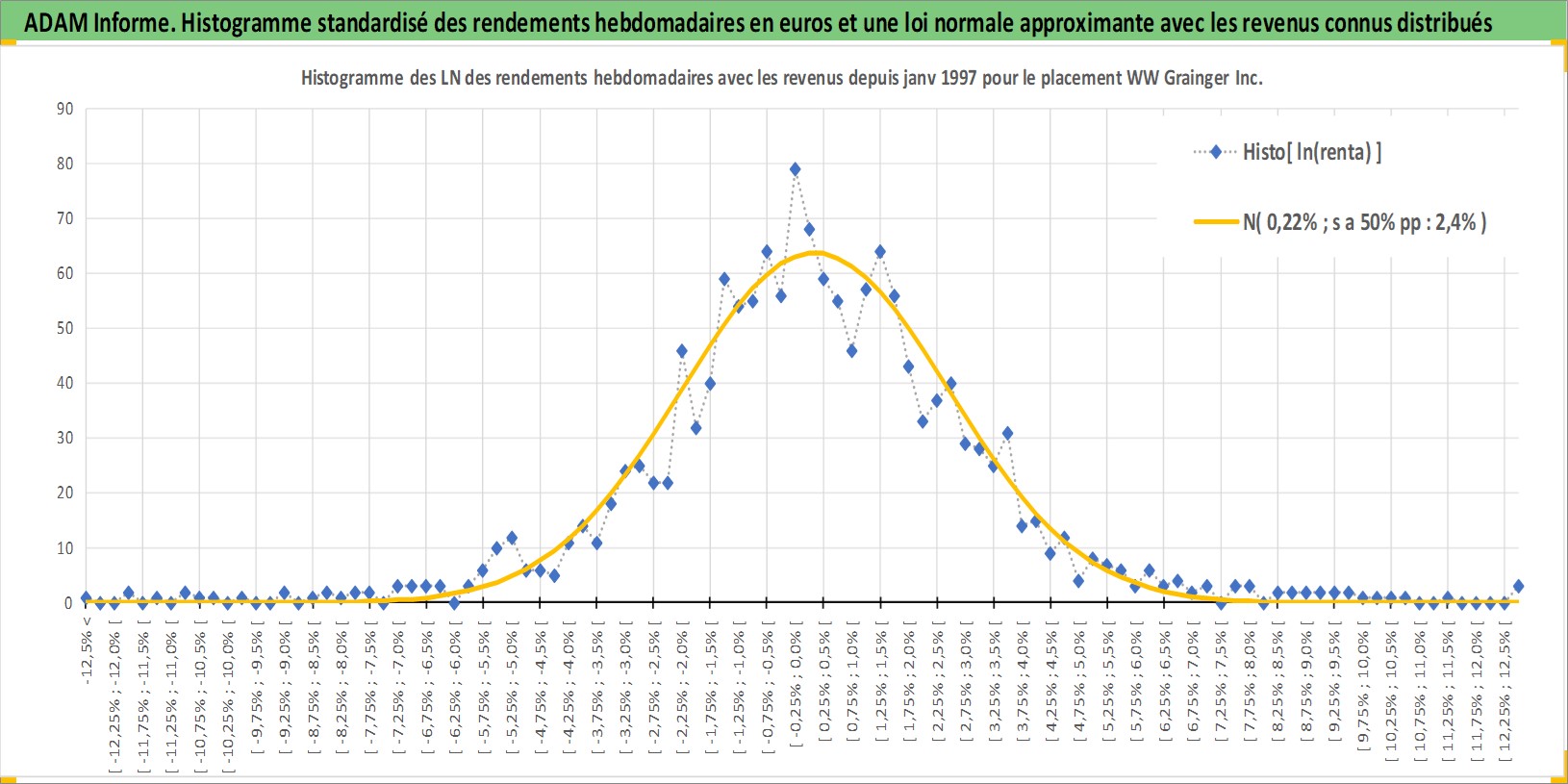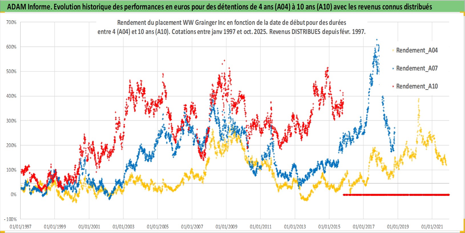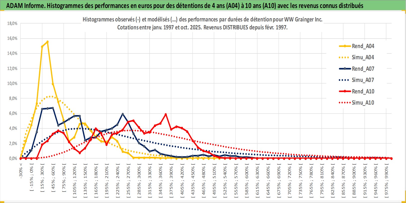 Site dédié aux investisseursPage dédiée sur site financeAnalyse des valorisations hebdomadaires de l'action WW Grainger Inc. Cet actif est cote en USD. Les valorisations sont en contrevaleur EURO et couvrent les semaines 1997W01 a 2025W44. Les revenus de cet actif financier sont pris en compte depuis la semaine 1997W06. La note globale ESG de cet actif est estimee a 13.0 (apres rebasage entre 0 et 20).