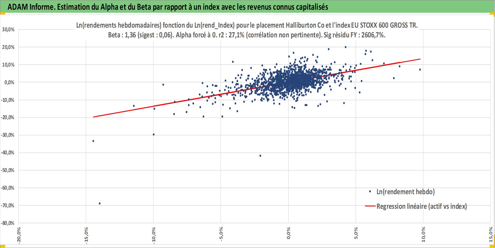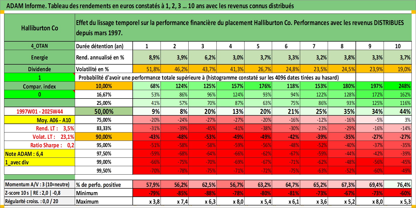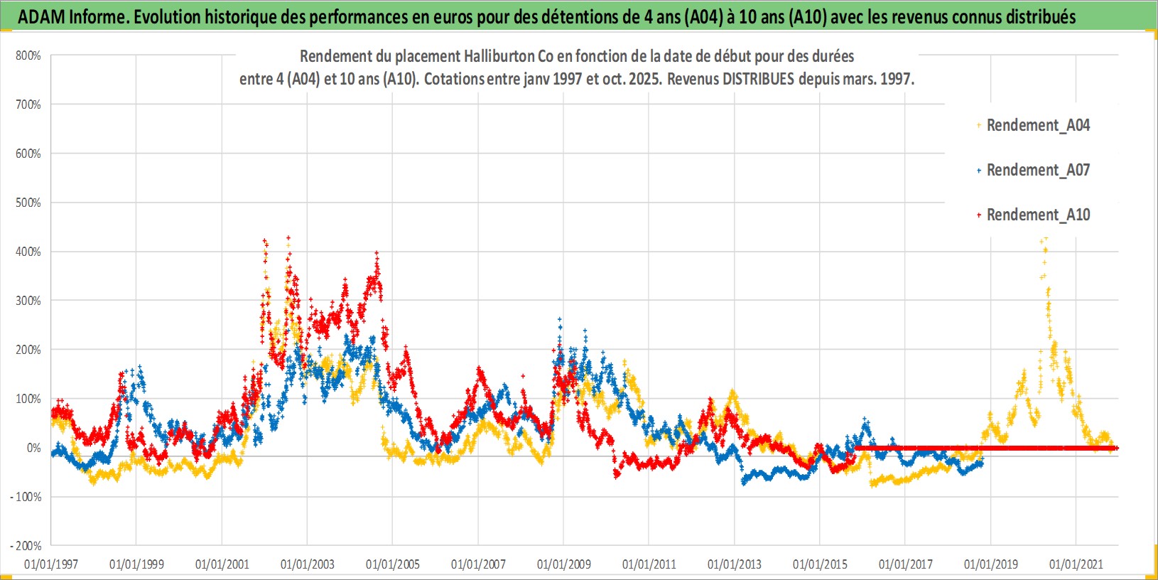 Site dédié aux investisseursPage dédiée sur site financeAnalyse des valorisations hebdomadaires de l'action Halliburton Co. Cet actif est cote en USD. Les valorisations sont en contrevaleur EURO et couvrent les semaines 1997W01 a 2025W44. Les revenus de cet actif financier sont pris en compte depuis la semaine 1997W10. La note globale ESG de cet actif est estimee a 8.0 (apres rebasage entre 0 et 20).