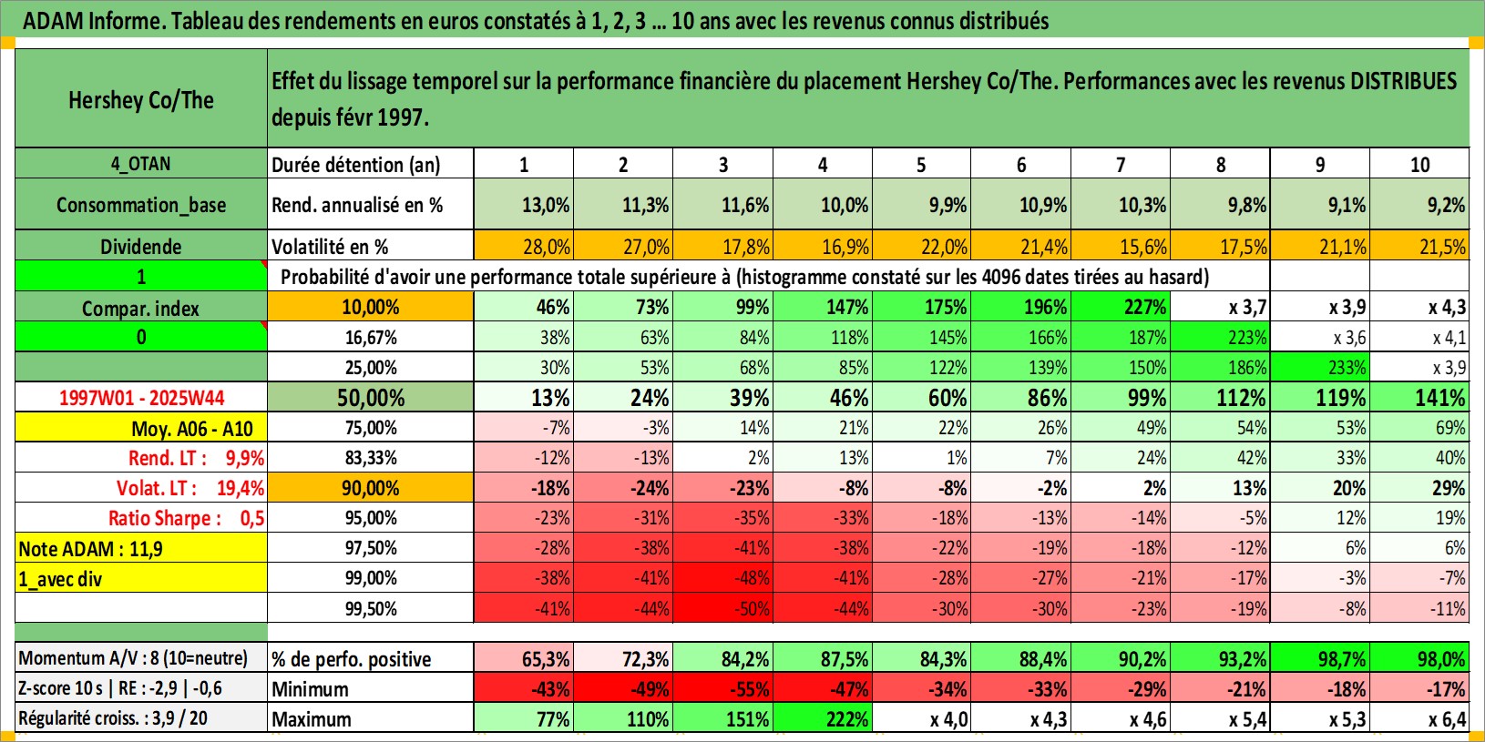 Site dédié aux investisseursPage dédiée sur site financeAnalyse des valorisations hebdomadaires de l'action Hershey Co/The. Cet actif est cote en USD. Les valorisations sont en contrevaleur EURO et couvrent les semaines 1997W01 a 2025W44. Les revenus de cet actif financier sont pris en compte depuis la semaine 1997W08. La note globale ESG de cet actif est estimee a 7.0 (apres rebasage entre 0 et 20).