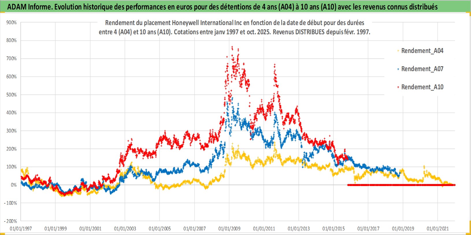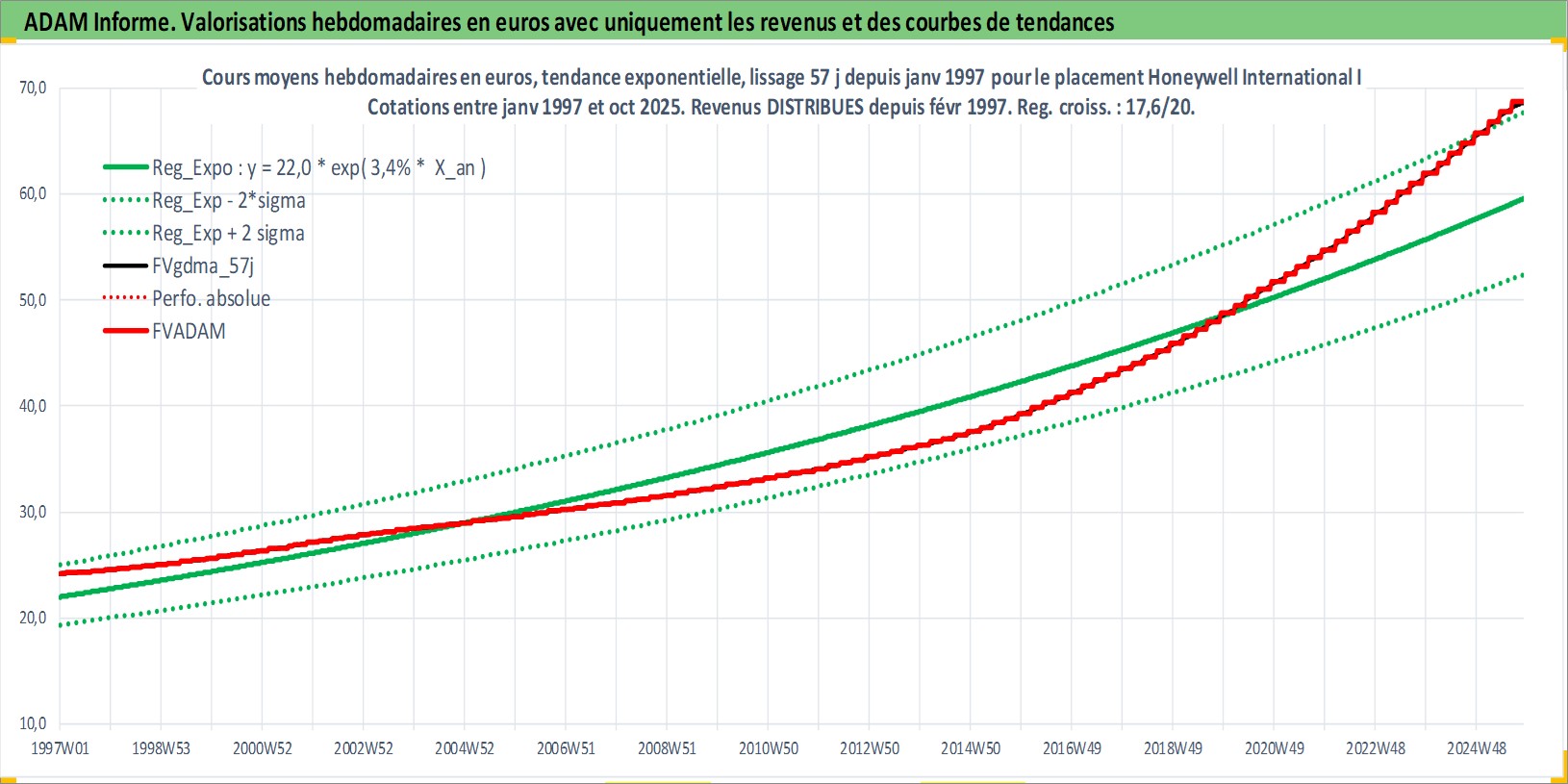 Site dédié aux investisseursPage dédiée sur site financeAnalyse des valorisations hebdomadaires de l'action Honeywell International Inc. Cet actif est cote en USD. Les valorisations sont en contrevaleur EURO et couvrent les semaines 1997W01 a 2025W44. Les revenus de cet actif financier sont pris en compte depuis la semaine 1997W08. La note globale ESG de cet actif est estimee a 6.0 (apres rebasage entre 0 et 20).