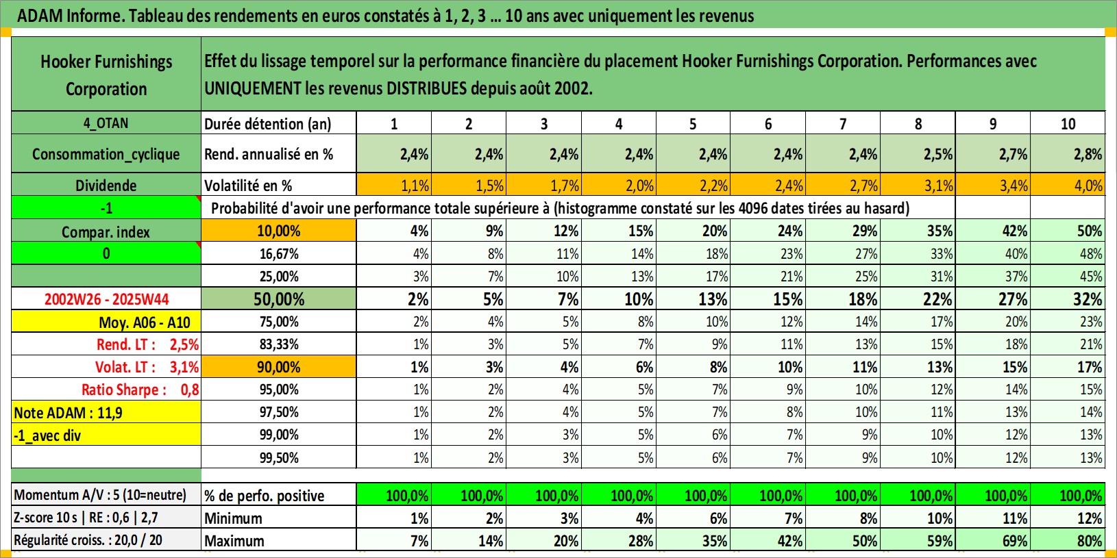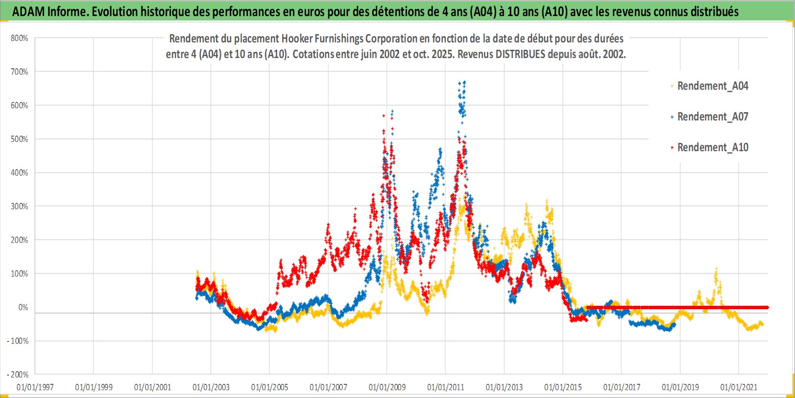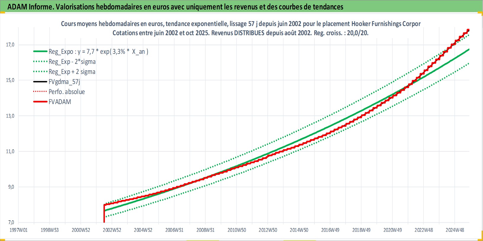 Site dédié aux investisseursPage dédiée sur site financeAnalyse des valorisations hebdomadaires de l'action Hooker Furnishings Corporation. Cet actif est cote en USD. Les valorisations sont en contrevaleur EURO et couvrent les semaines 2002W26 a 2025W44. Les revenus de cet actif financier sont pris en compte depuis la semaine 2002W33. La note ESG de cet actif n'est pas connue.