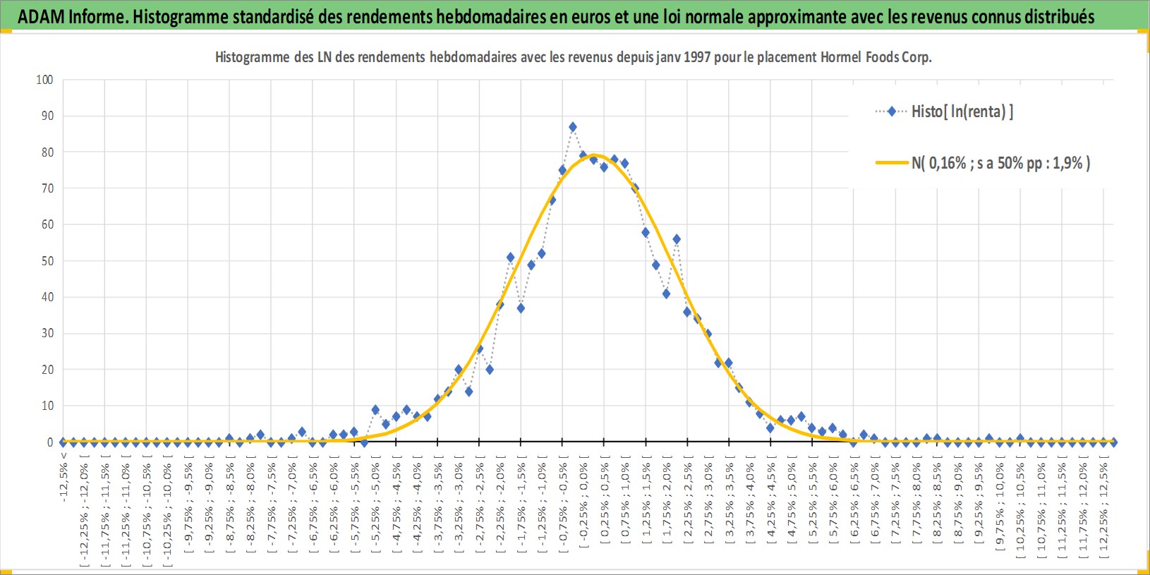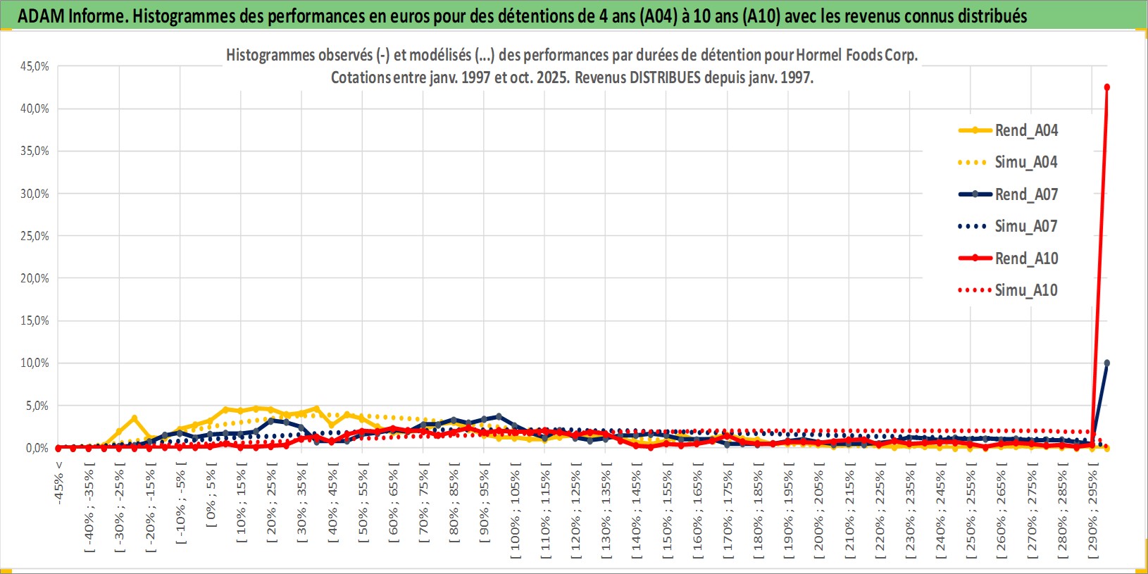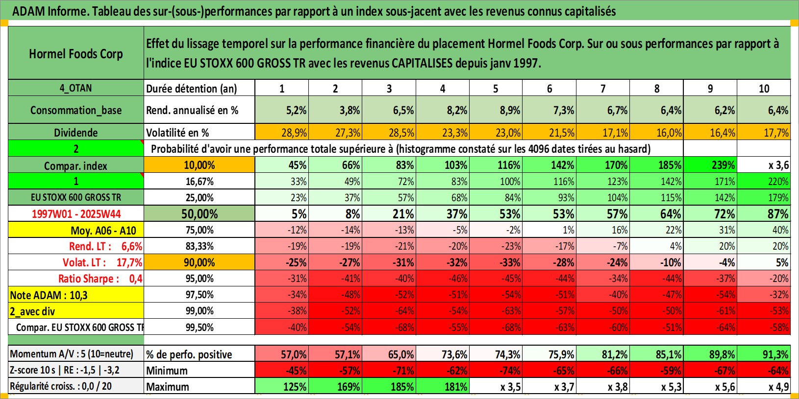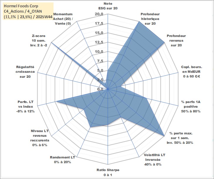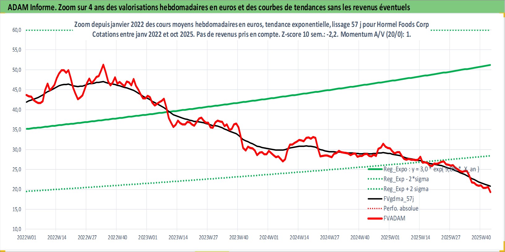Site dédié aux investisseursPage dédiée sur site financeAnalyse des valorisations hebdomadaires de l'action Hormel Foods Corp. Cet actif est cote en USD. Les valorisations sont en contrevaleur EURO et couvrent les semaines 1997W01 a 2025W44. Les revenus de cet actif financier sont pris en compte depuis la semaine 1997W03. La note globale ESG de cet actif est estimee a 5.0 (apres rebasage entre 0 et 20).