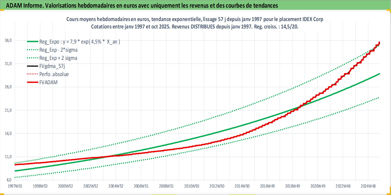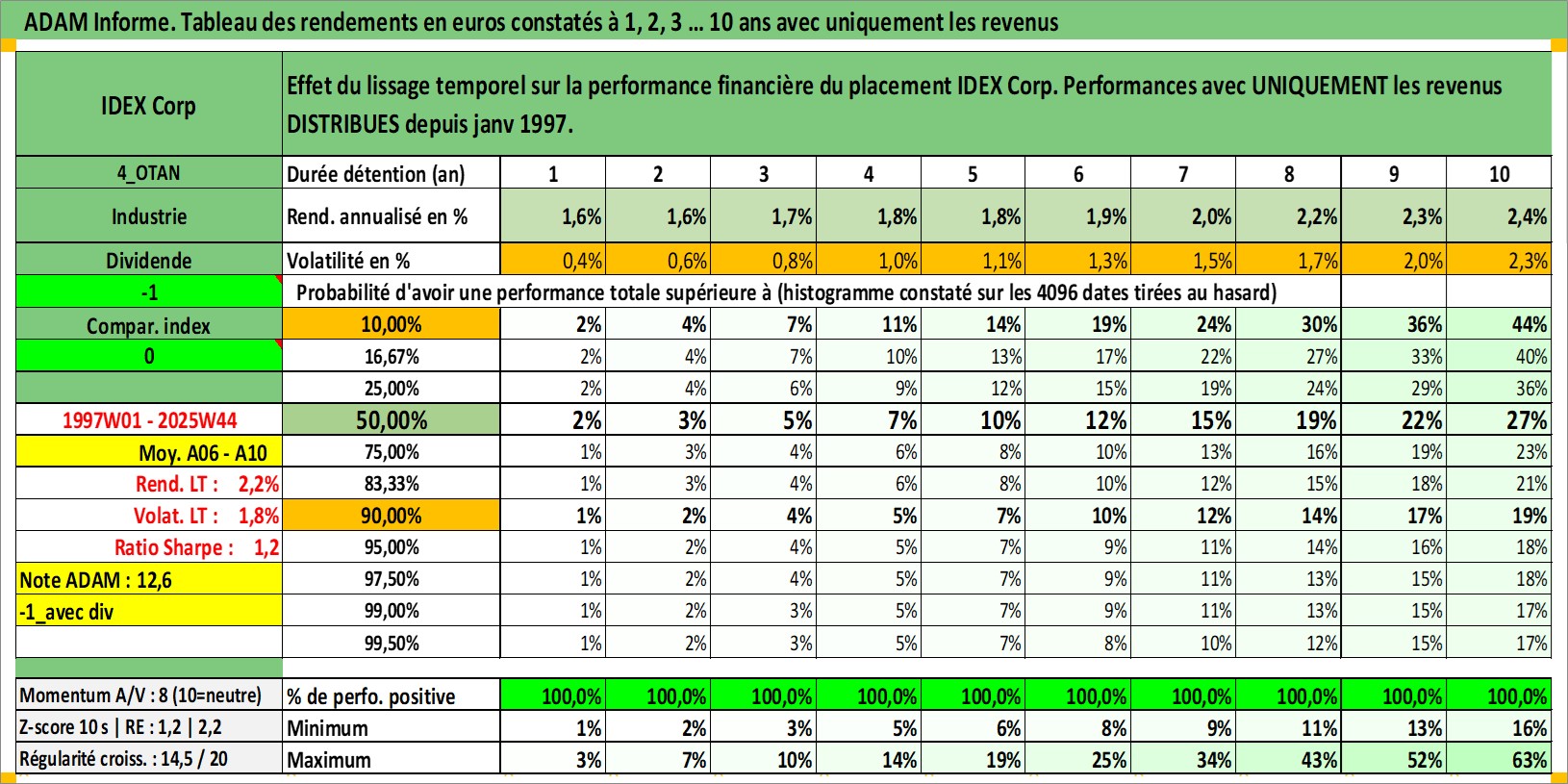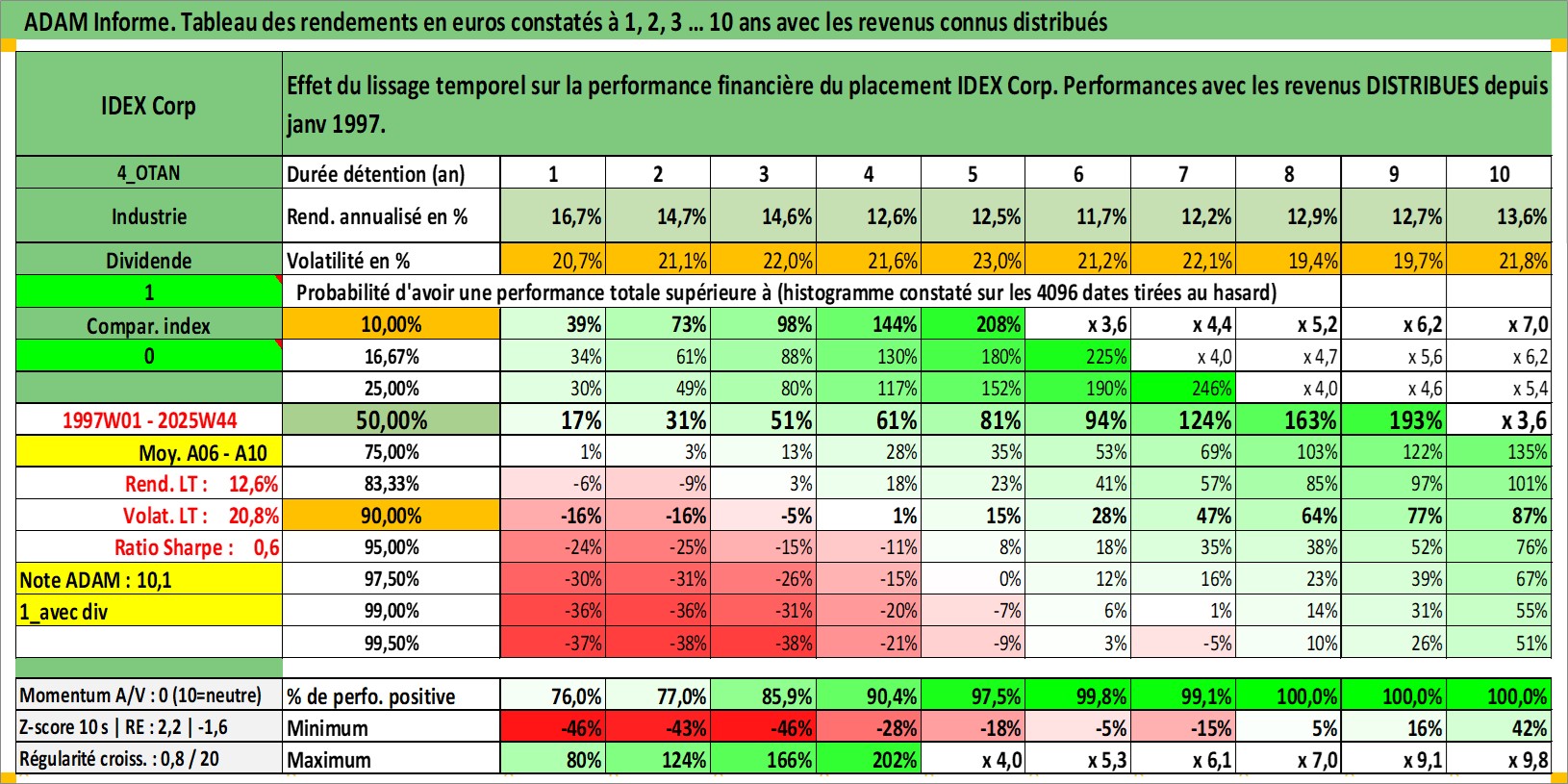 Site dédié aux investisseursPage dédiée sur site financeAnalyse des valorisations hebdomadaires de l'action IDEX Corp. Cet actif est cote en USD. Les valorisations sont en contrevaleur EURO et couvrent les semaines 1997W01 a 2025W44. Les revenus de cet actif financier sont pris en compte depuis la semaine 1997W03. La note globale ESG de cet actif est estimee a 7.0 (apres rebasage entre 0 et 20).