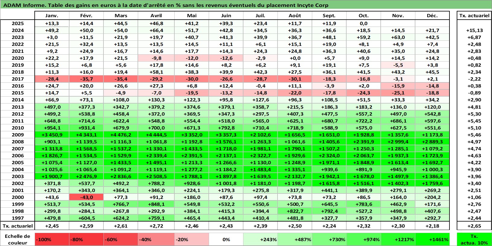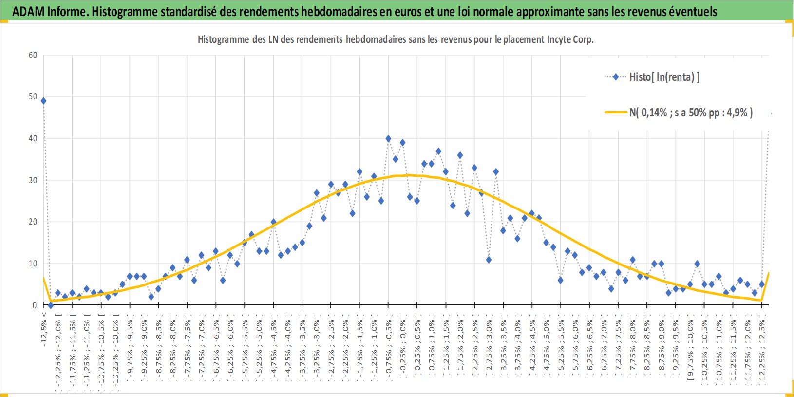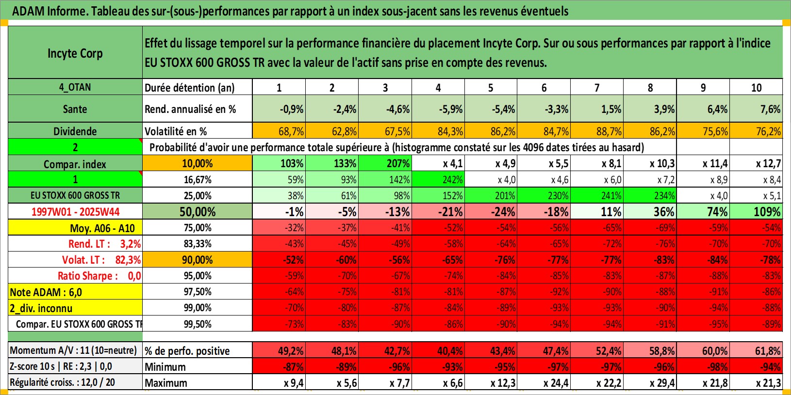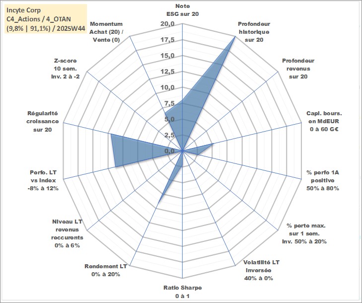 Site dédié aux investisseursPage dédiée sur site financeAnalyse des valorisations hebdomadaires de l'action Incyte Corp. Cet actif est cote en USD. Les valorisations sont en contrevaleur EURO et couvrent les semaines 1997W01 a 2025W44. Les revenus de cet actif financier ne sont pas connus car non existants ou non disponibles sur le site Yahoo Finance. La note globale ESG de cet actif est estimee a 8.0 (apres rebasage entre 0 et 20).