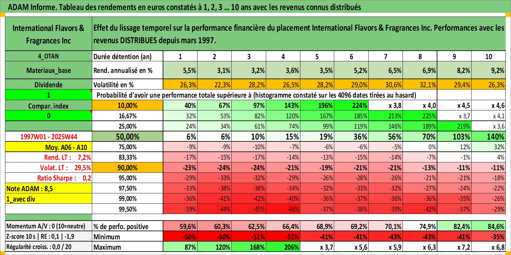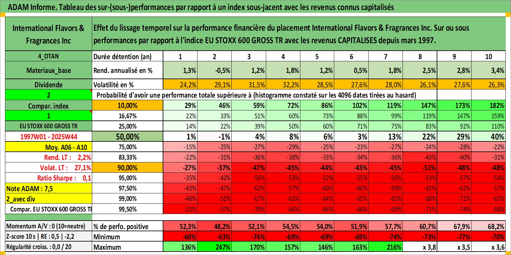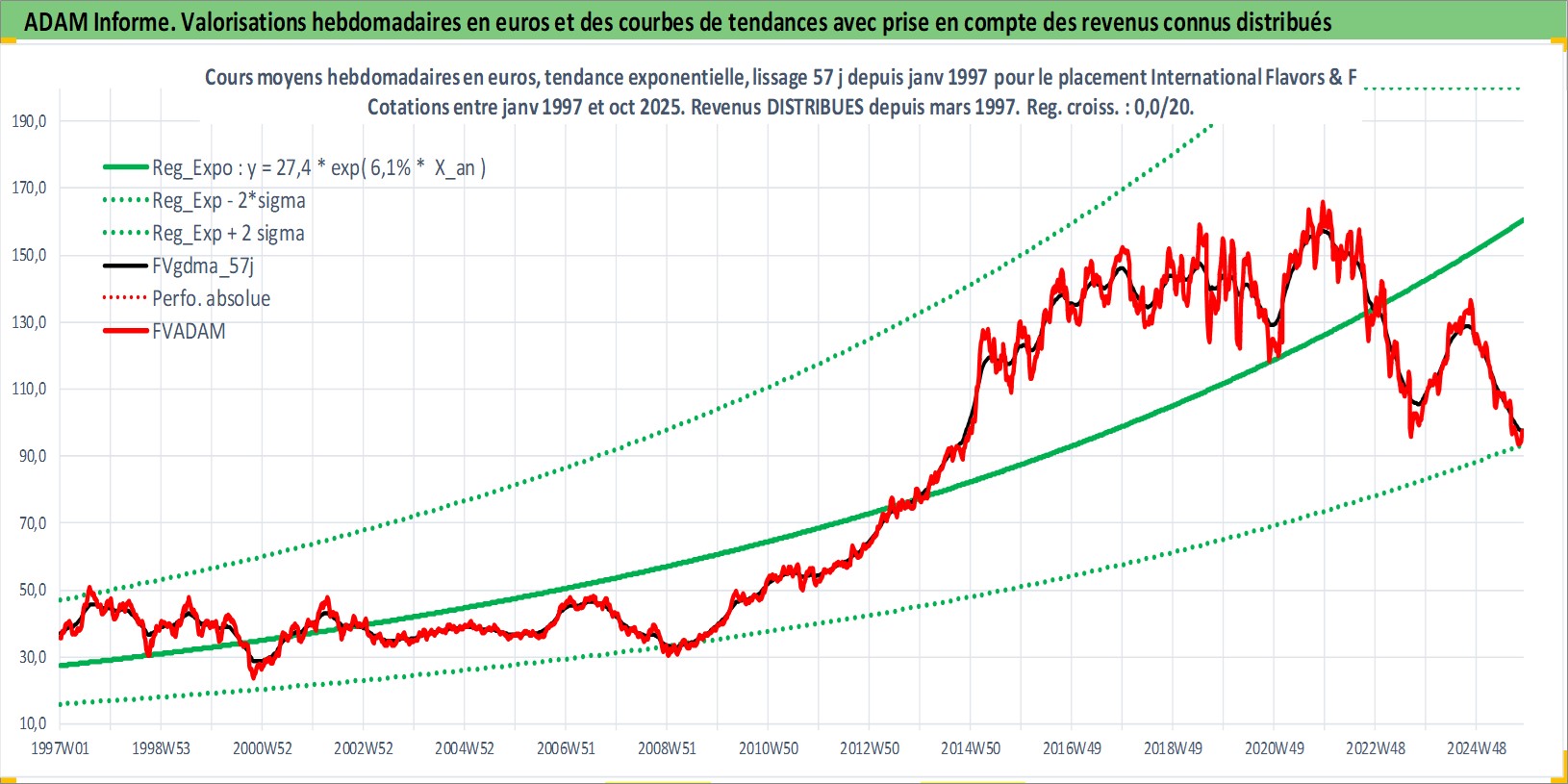 Site dédié aux investisseursPage dédiée sur site financeAnalyse des valorisations hebdomadaires de l'action International Flavors & Fragrances Inc. Cet actif est cote en USD. Les valorisations sont en contrevaleur EURO et couvrent les semaines 1997W01 a 2025W44. Les revenus de cet actif financier sont pris en compte depuis la semaine 1997W12. La note globale ESG de cet actif est estimee a 9.0 (apres rebasage entre 0 et 20).