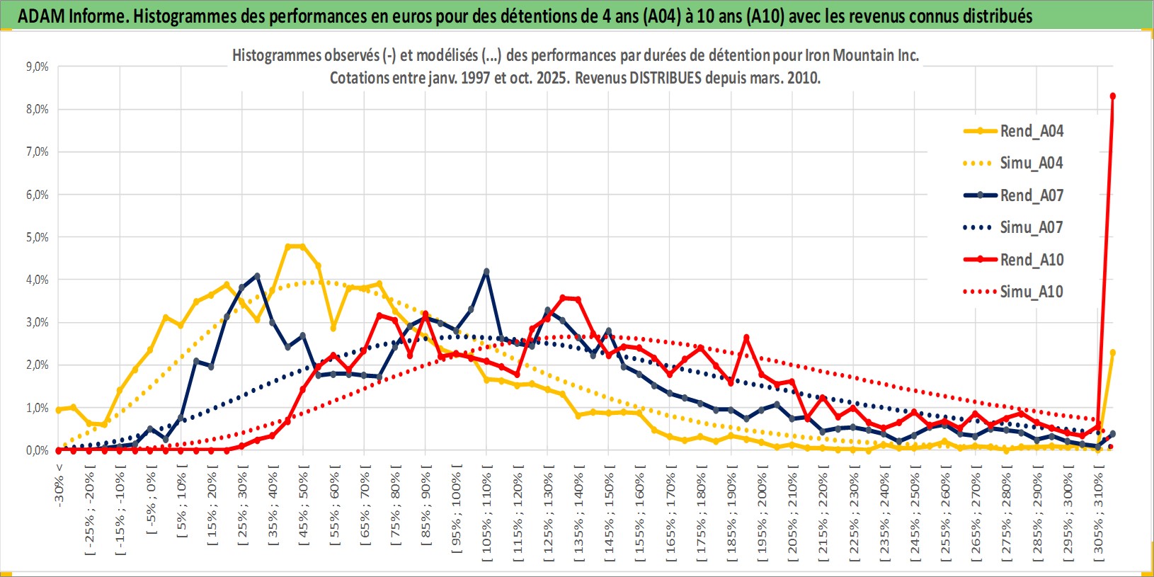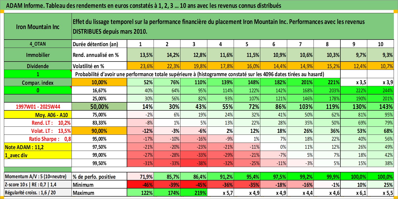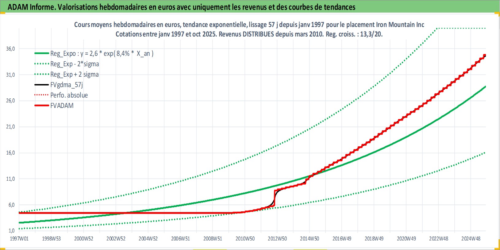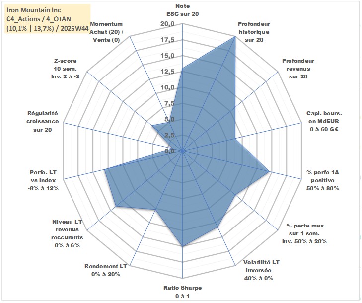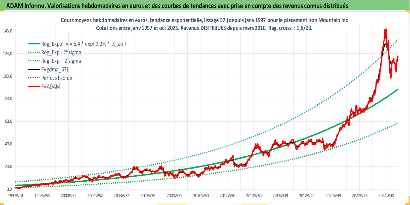 Site dédié aux investisseursPage dédiée sur site financeAnalyse des valorisations hebdomadaires de l'action Iron Mountain Inc. Cet actif est cote en USD. Les valorisations sont en contrevaleur EURO et couvrent les semaines 1997W01 a 2025W44. Les revenus de cet actif financier sont pris en compte depuis la semaine 2010W12. La note globale ESG de cet actif est estimee a 13.0 (apres rebasage entre 0 et 20).