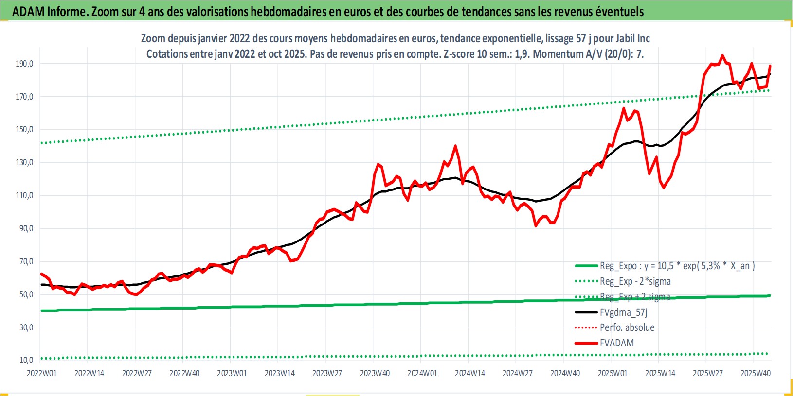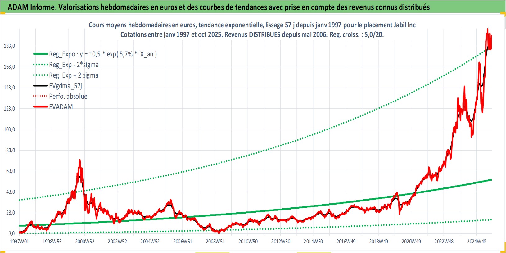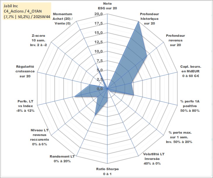 Site dédié aux investisseursPage dédiée sur site financeAnalyse des valorisations hebdomadaires de l'action Jabil Inc. Cet actif est cote en USD. Les valorisations sont en contrevaleur EURO et couvrent les semaines 1997W01 a 2025W44. Les revenus de cet actif financier sont pris en compte depuis la semaine 2006W19. La note ESG de cet actif n'est pas connue.