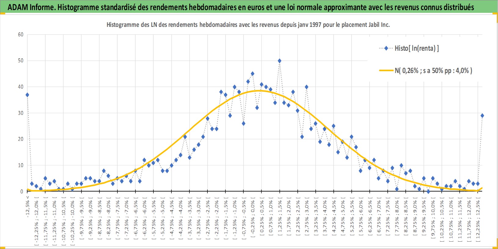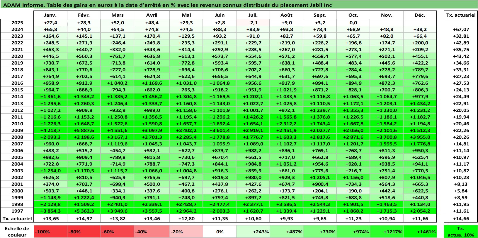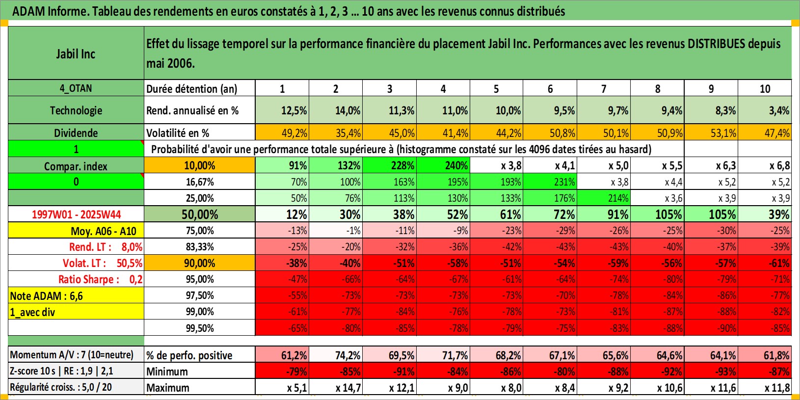Site dédié aux investisseursPage dédiée sur site financeAnalyse des valorisations hebdomadaires de l'action Jabil Inc. Cet actif est cote en USD. Les valorisations sont en contrevaleur EURO et couvrent les semaines 1997W01 a 2025W44. Les revenus de cet actif financier sont pris en compte depuis la semaine 2006W19. La note ESG de cet actif n'est pas connue.