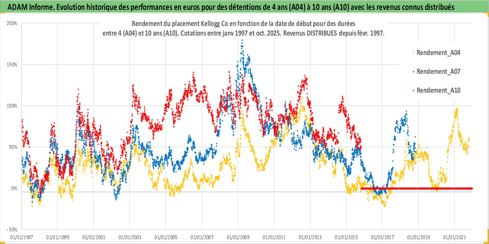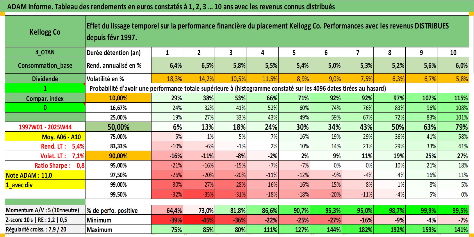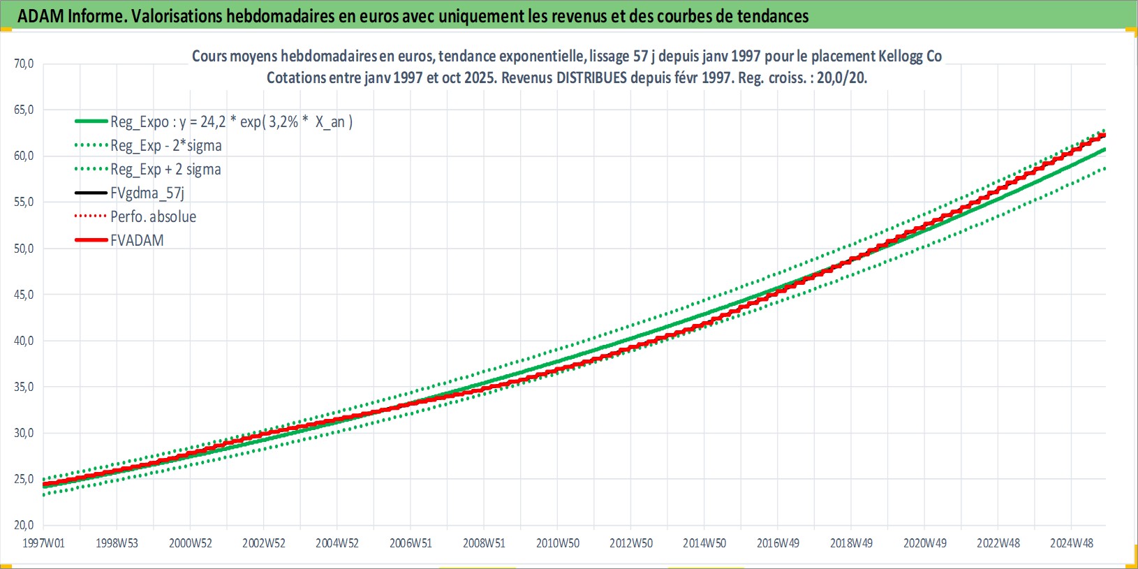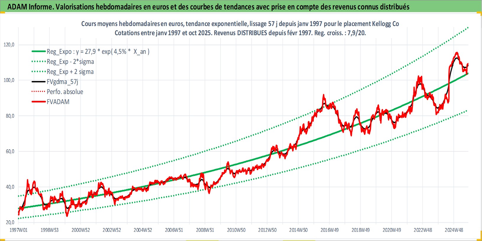 Site dédié aux investisseursPage dédiée sur site financeAnalyse des valorisations hebdomadaires de l'action Kellogg Co. Cet actif est cote en USD. Les valorisations sont en contrevaleur EURO et couvrent les semaines 1997W01 a 2025W44. Les revenus de cet actif financier sont pris en compte depuis la semaine 1997W09. La note globale ESG de cet actif est estimee a 7.0 (apres rebasage entre 0 et 20).