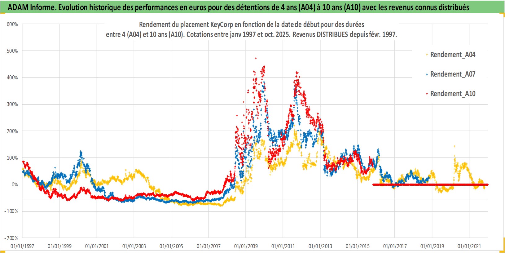 Site dédié aux investisseursPage dédiée sur site financeAnalyse des valorisations hebdomadaires de l'action KeyCorp. Cet actif est cote en USD. Les valorisations sont en contrevaleur EURO et couvrent les semaines 1997W01 a 2025W44. Les revenus de cet actif financier sont pris en compte depuis la semaine 1997W09. La note globale ESG de cet actif est estimee a 9.0 (apres rebasage entre 0 et 20).