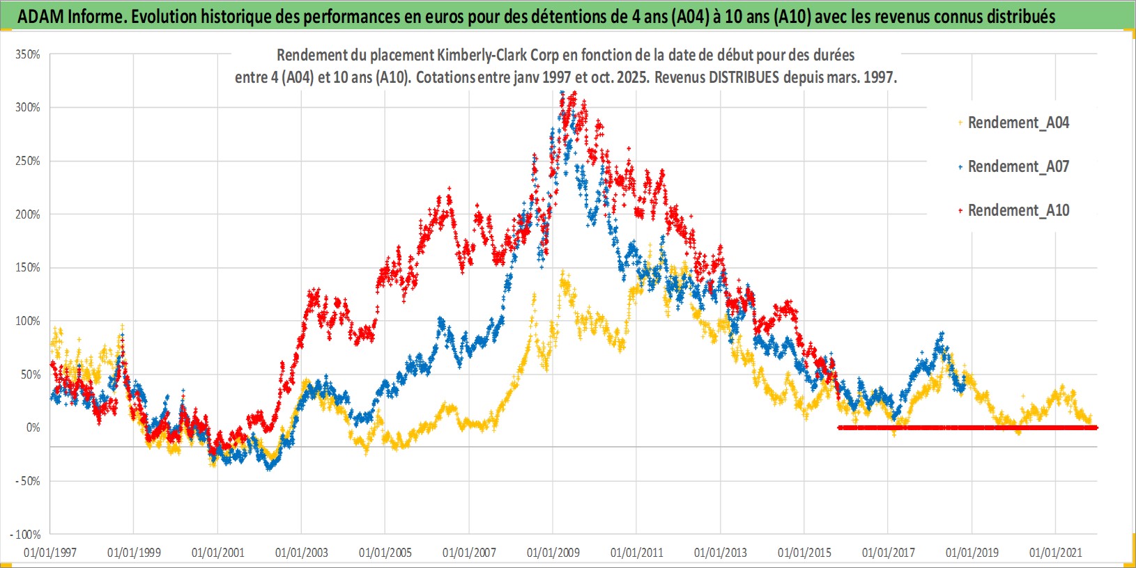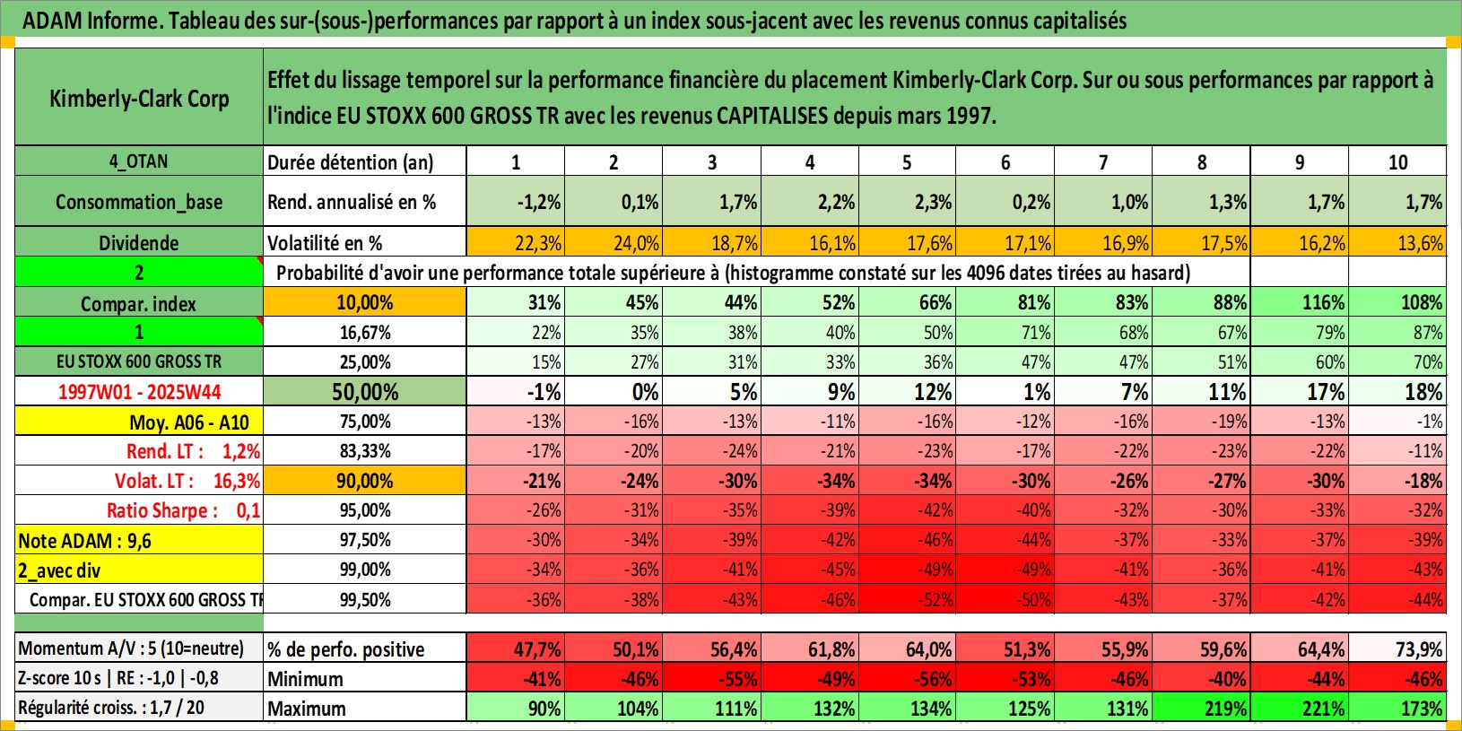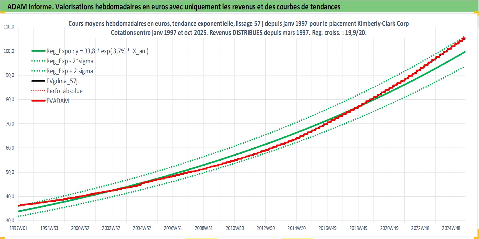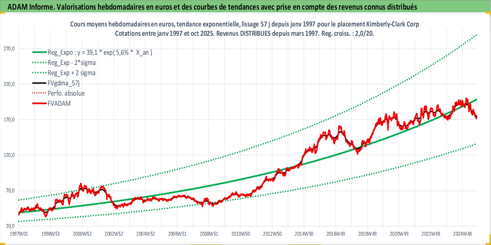 Site dédié aux investisseursPage dédiée sur site financeAnalyse des valorisations hebdomadaires de l'action Kimberly-Clark Corp. Cet actif est cote en USD. Les valorisations sont en contrevaleur EURO et couvrent les semaines 1997W01 a 2025W44. Les revenus de cet actif financier sont pris en compte depuis la semaine 1997W10. La note globale ESG de cet actif est estimee a 9.0 (apres rebasage entre 0 et 20).