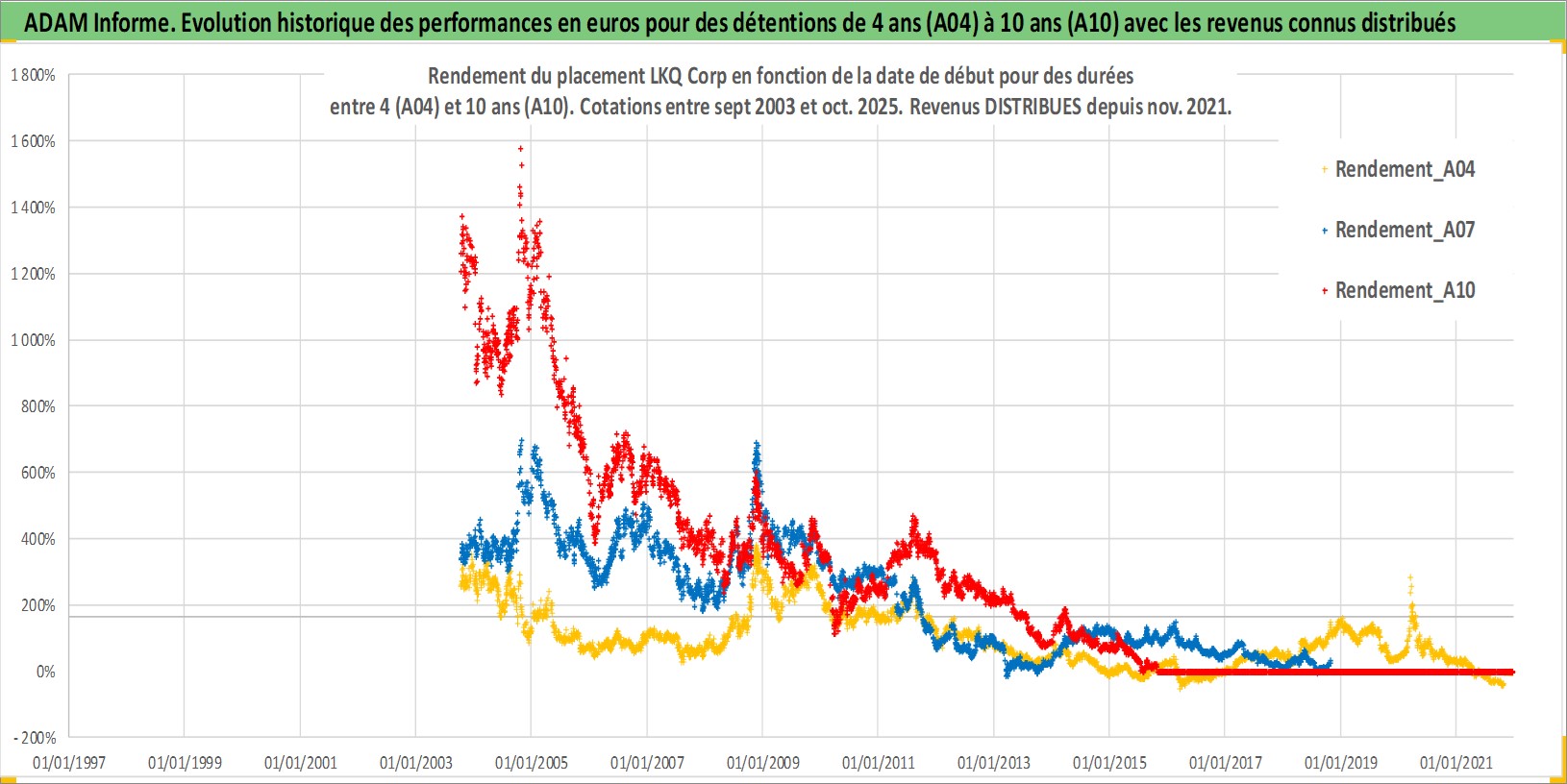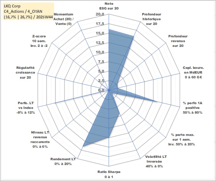 Site dédié aux investisseursPage dédiée sur site financeAnalyse des valorisations hebdomadaires de l'action LKQ Corp. Cet actif est cote en USD. Les valorisations sont en contrevaleur EURO et couvrent les semaines 2003W40 a 2025W44. Les revenus de cet actif financier sont pris en compte depuis la semaine 2021W45. La note globale ESG de cet actif est estimee a 16.0 (apres rebasage entre 0 et 20).