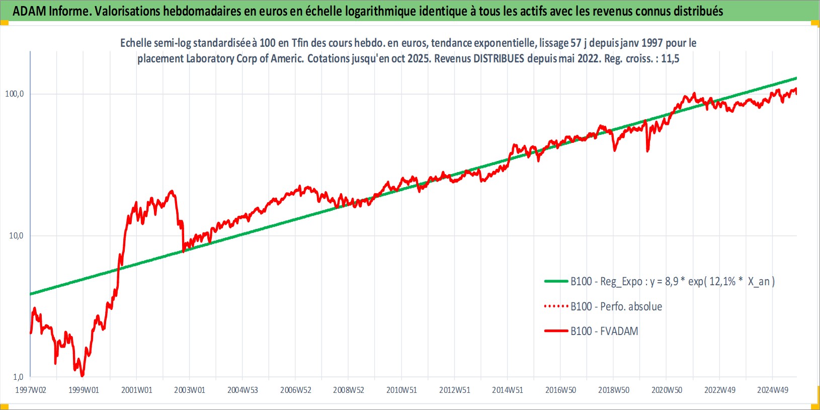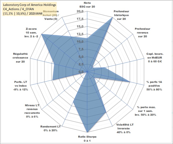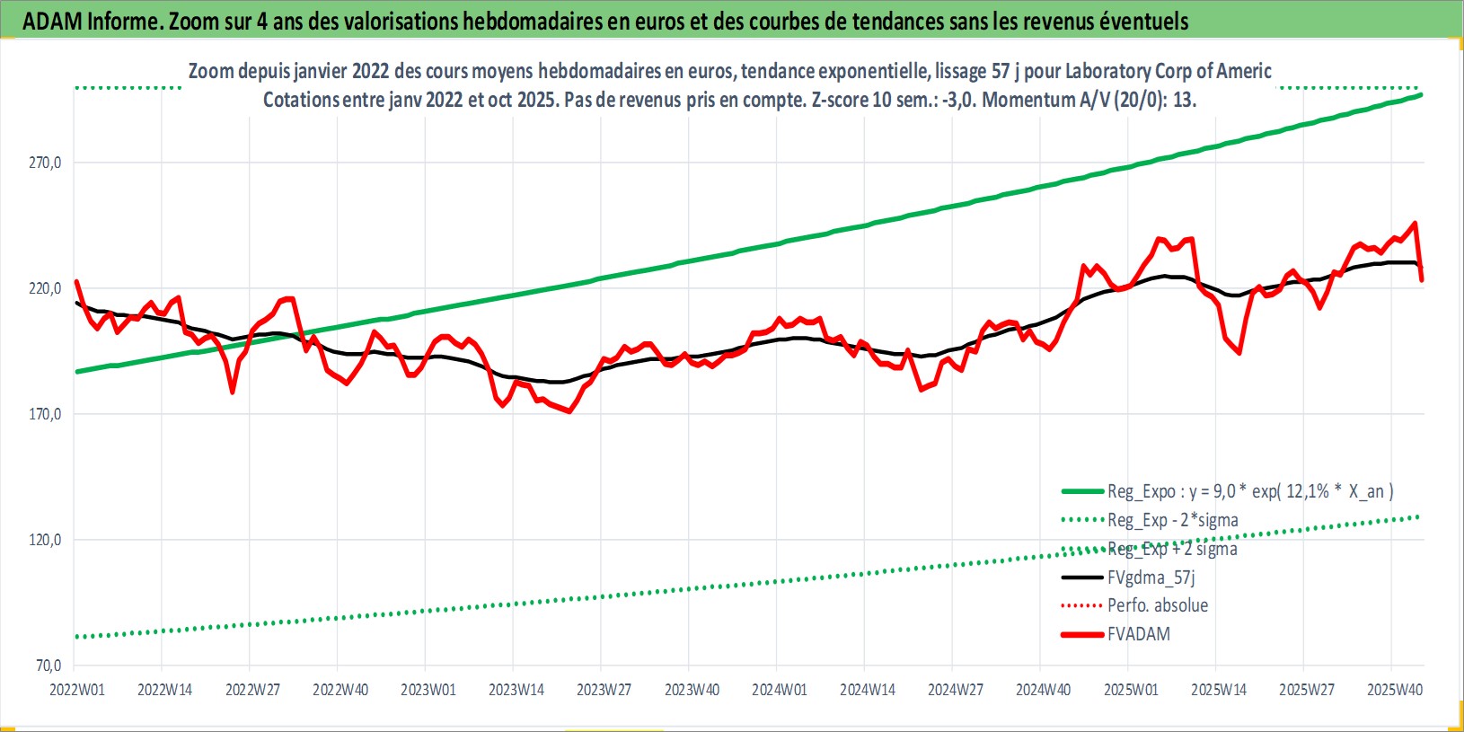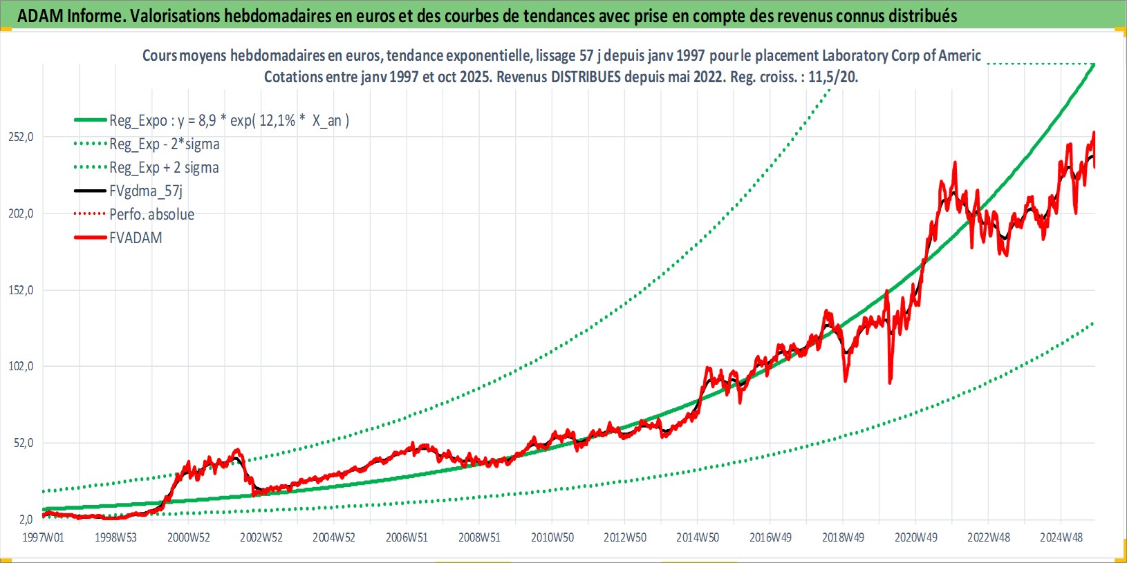 Site dédié aux investisseursPage dédiée sur site financeAnalyse des valorisations hebdomadaires de l'action Laboratory Corp of America Holdings. Cet actif est cote en USD. Les valorisations sont en contrevaleur EURO et couvrent les semaines 1997W01 a 2025W44. Les revenus de cet actif financier sont pris en compte depuis la semaine 2022W20. La note globale ESG de cet actif est estimee a 11.0 (apres rebasage entre 0 et 20).