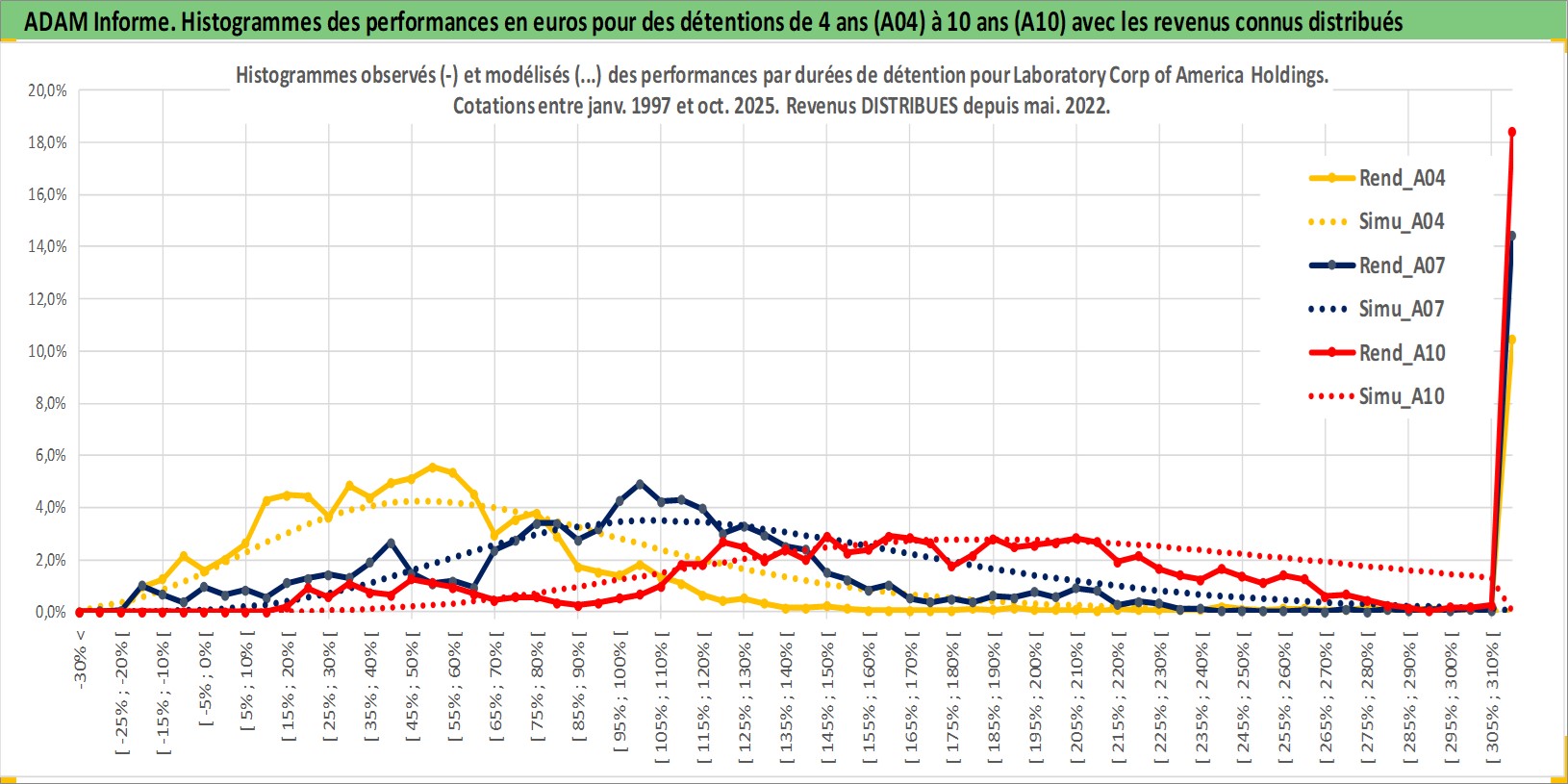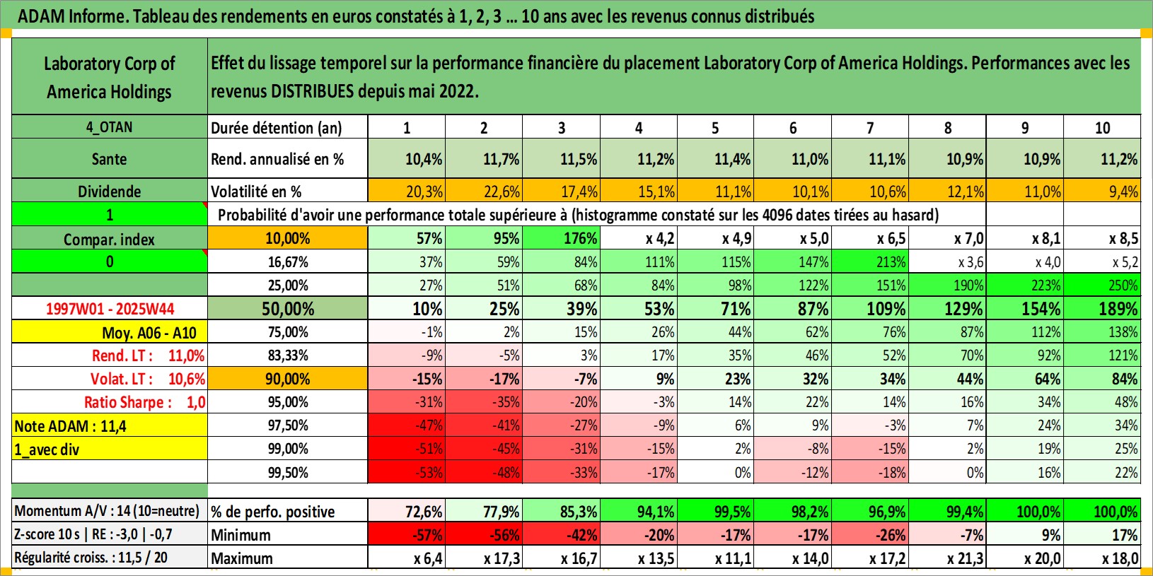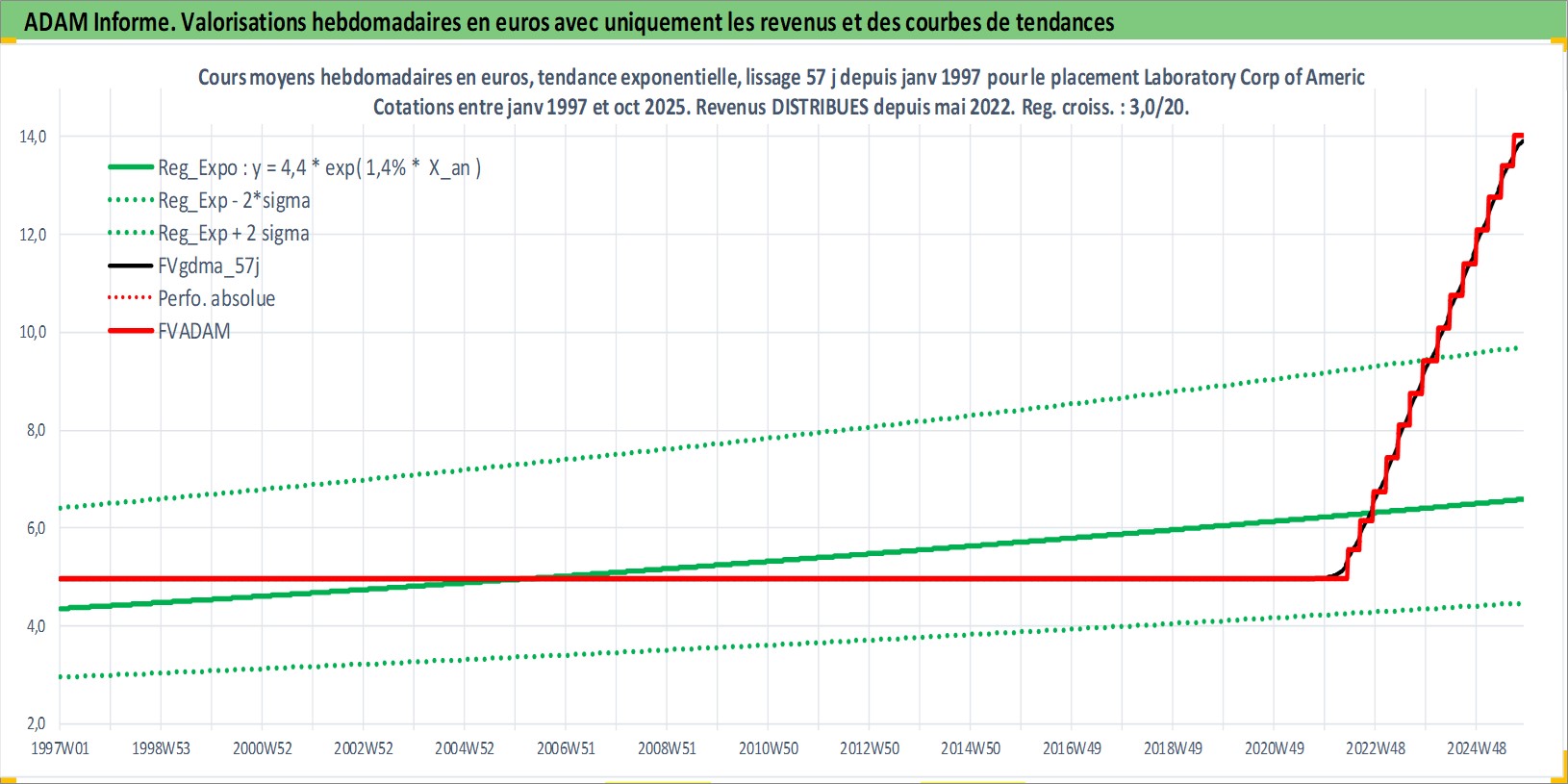 Site dédié aux investisseursPage dédiée sur site financeAnalyse des valorisations hebdomadaires de l'action Laboratory Corp of America Holdings. Cet actif est cote en USD. Les valorisations sont en contrevaleur EURO et couvrent les semaines 1997W01 a 2025W44. Les revenus de cet actif financier sont pris en compte depuis la semaine 2022W20. La note globale ESG de cet actif est estimee a 11.0 (apres rebasage entre 0 et 20).