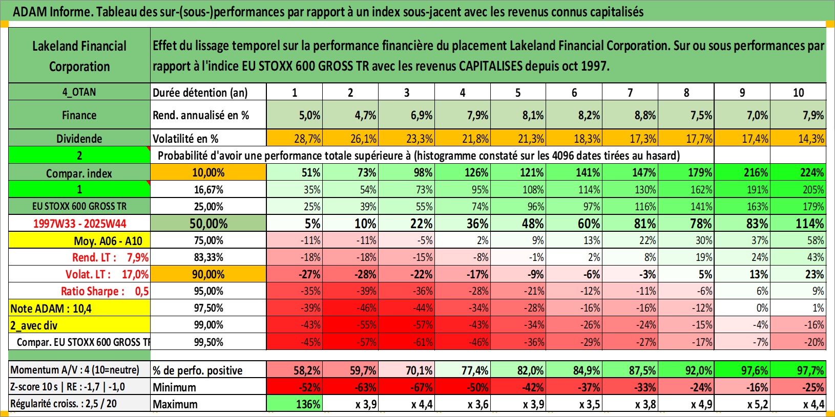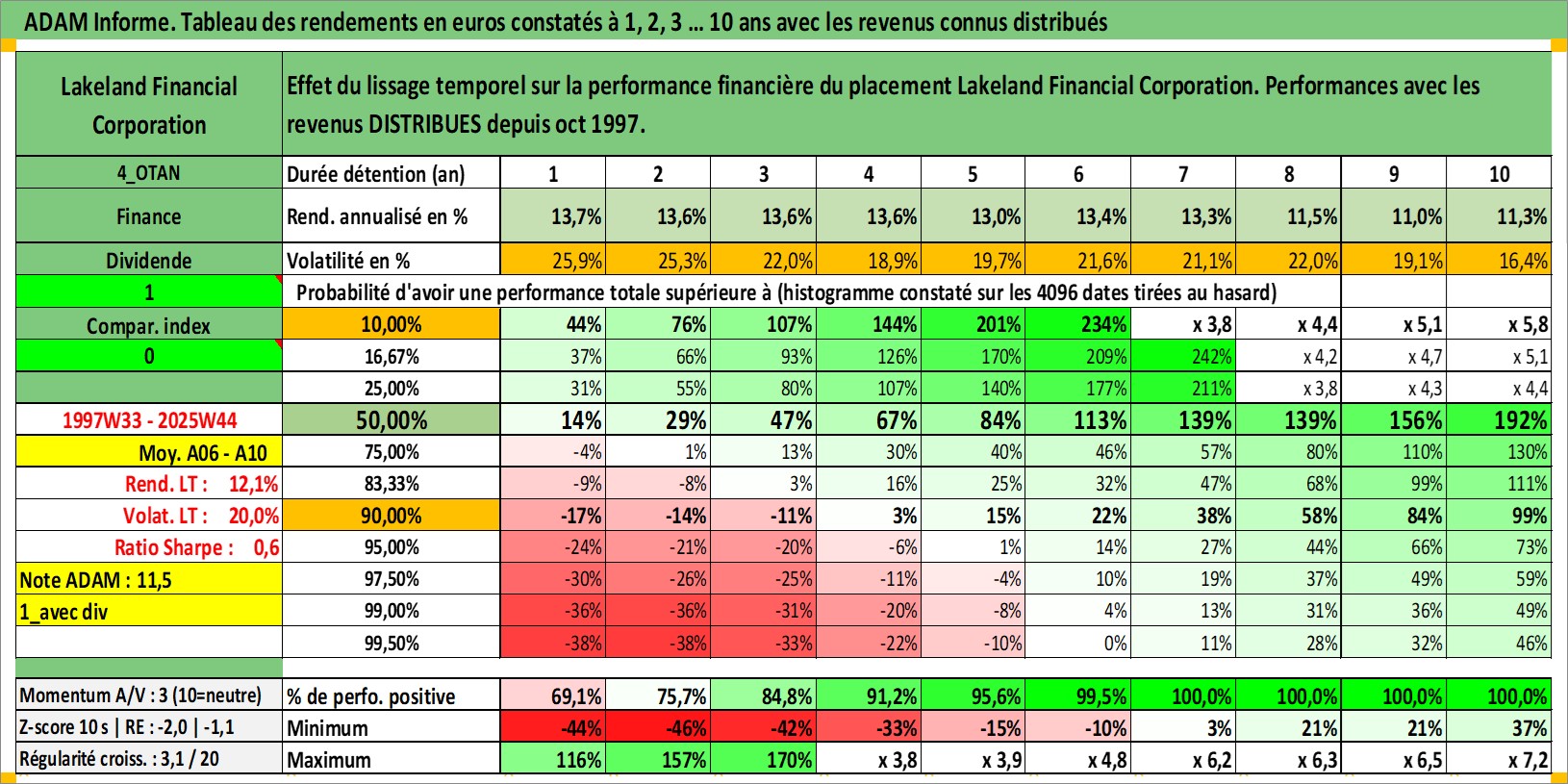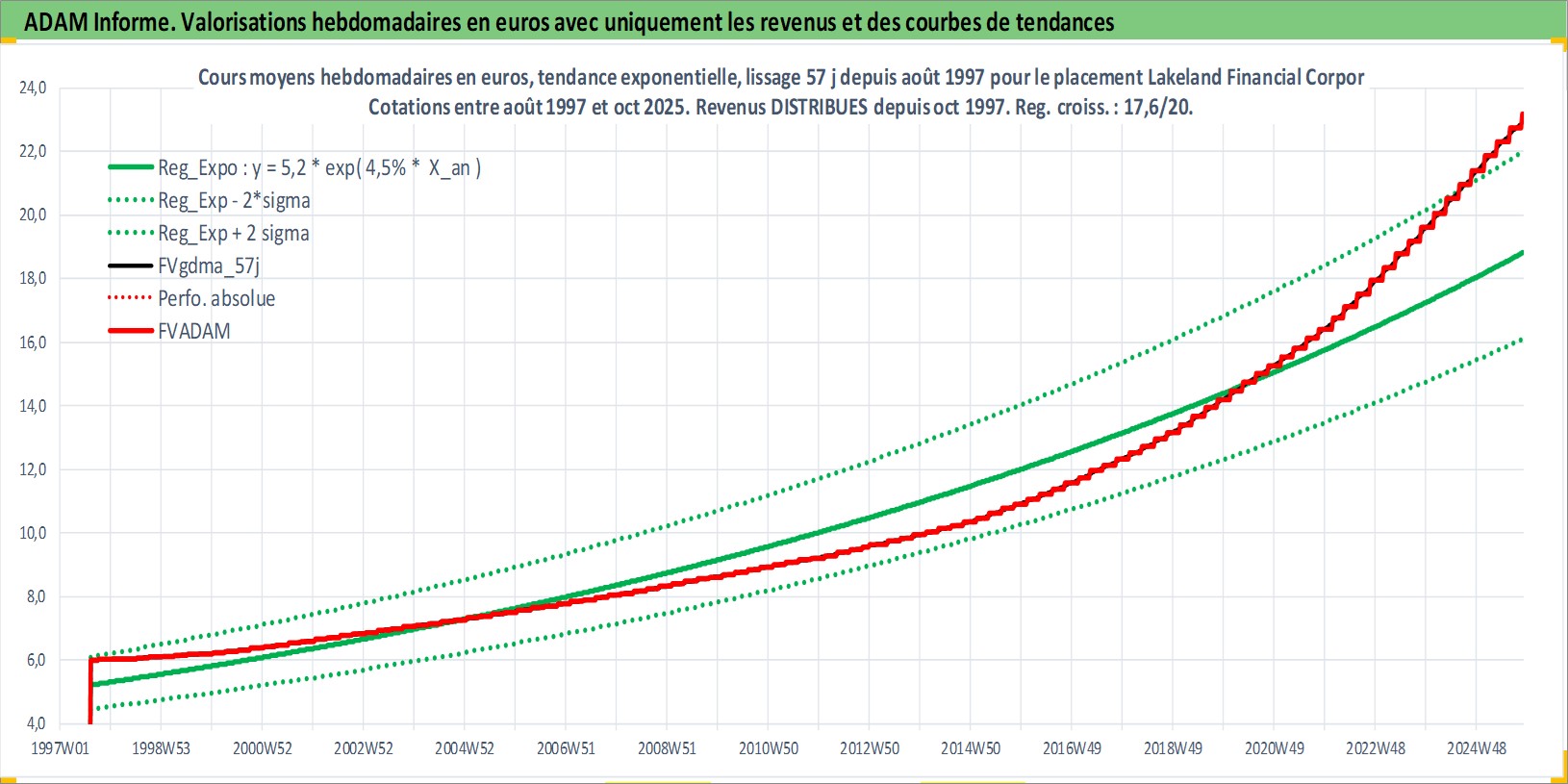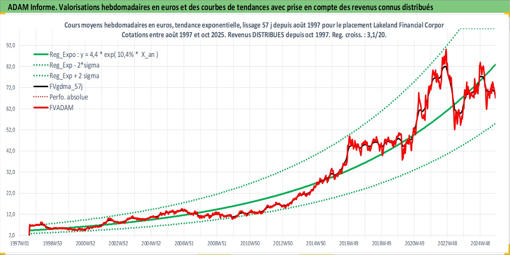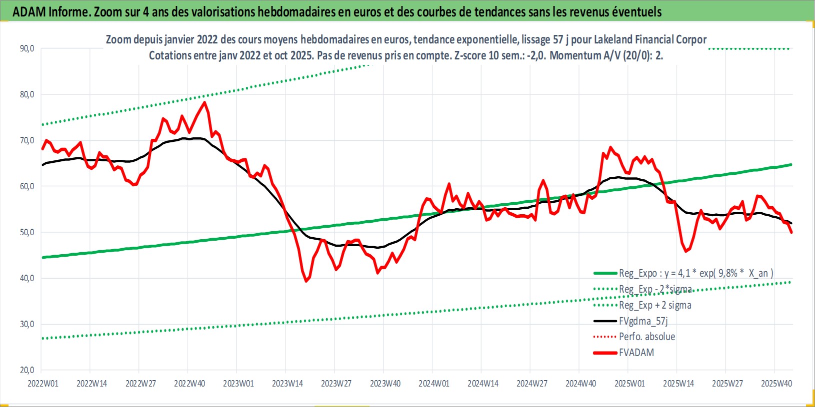 Site dédié aux investisseursPage dédiée sur site financeAnalyse des valorisations hebdomadaires de l'action Lakeland Financial Corporation. Cet actif est cote en USD. Les valorisations sont en contrevaleur EURO et couvrent les semaines 1997W33 a 2025W44. Les revenus de cet actif financier sont pris en compte depuis la semaine 1997W41. La note ESG de cet actif n'est pas connue.