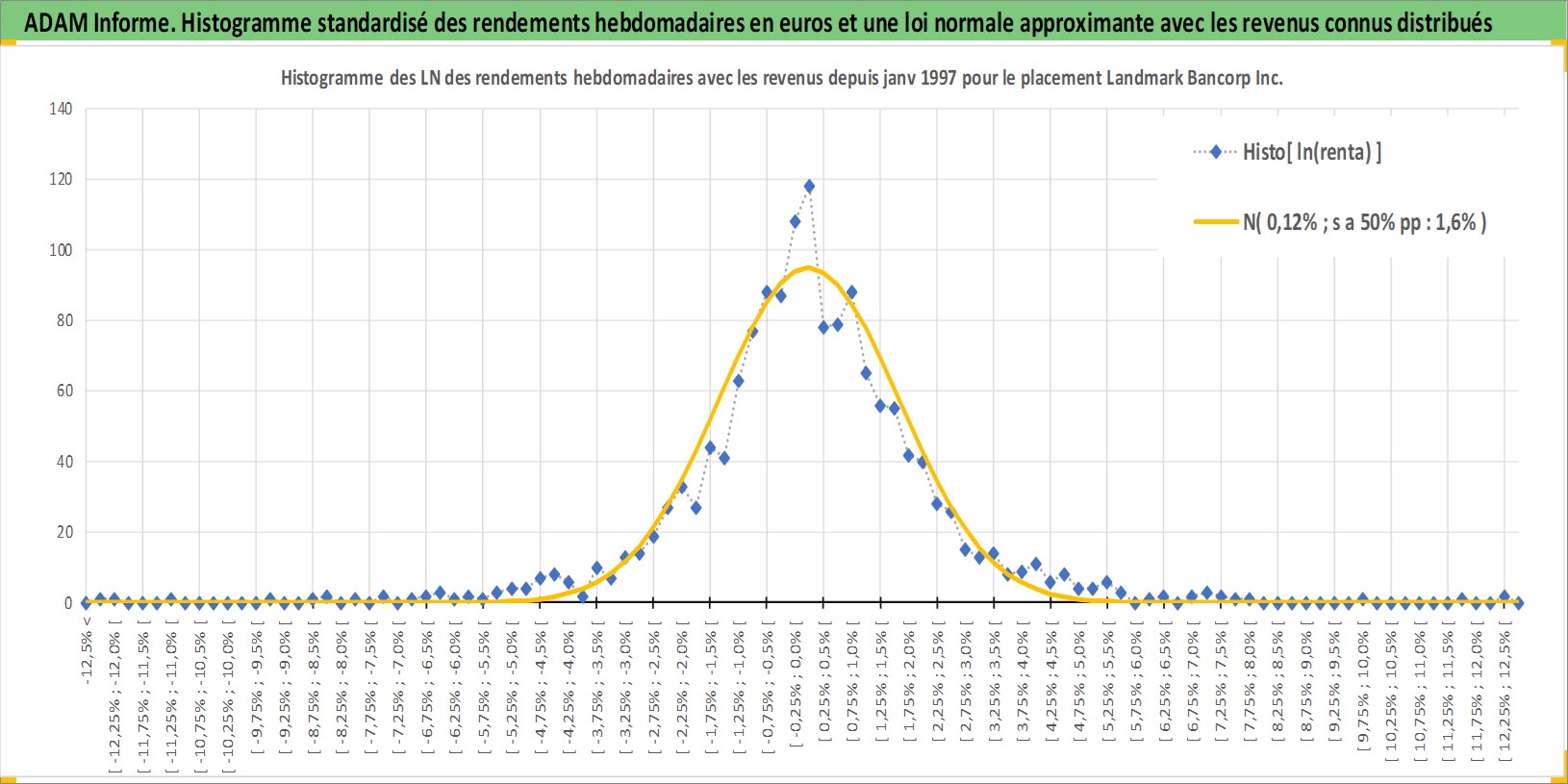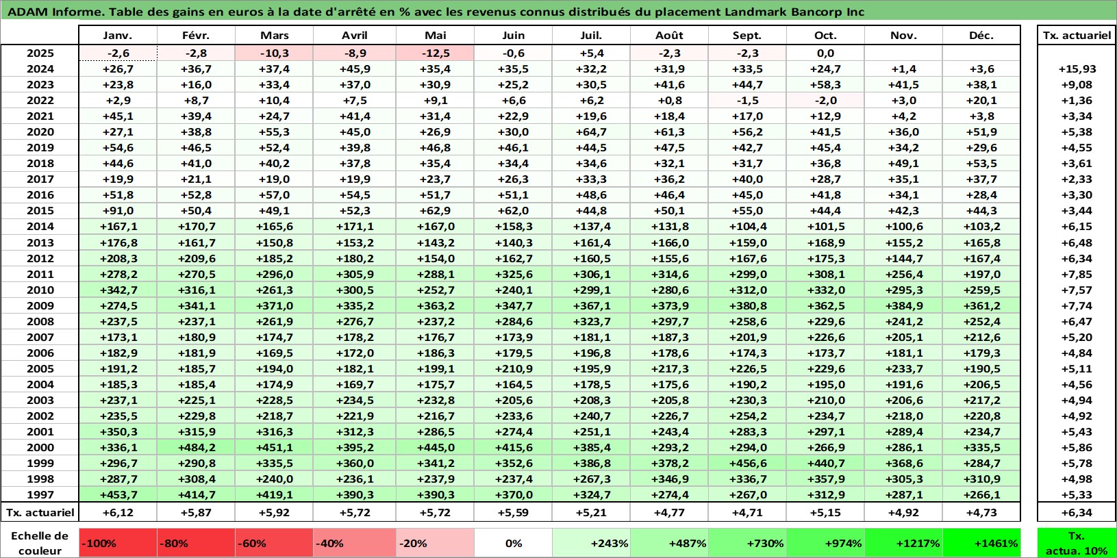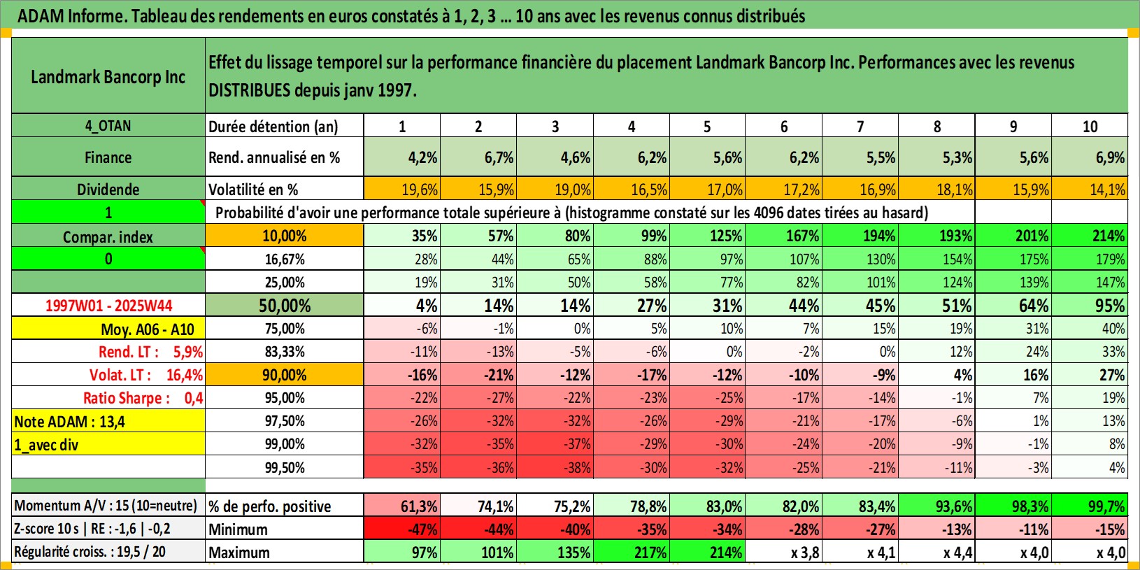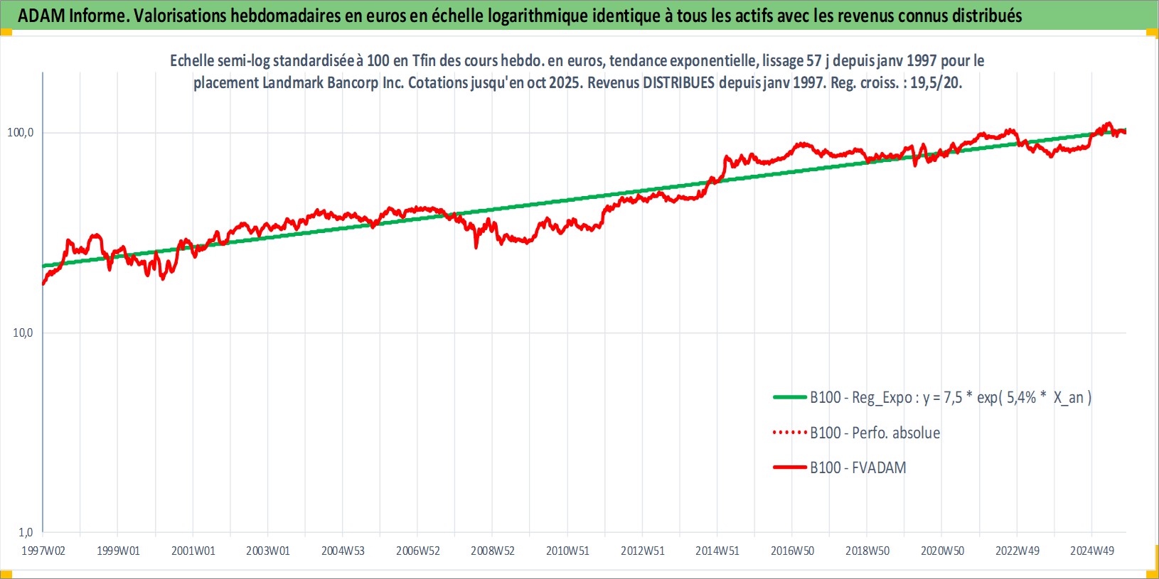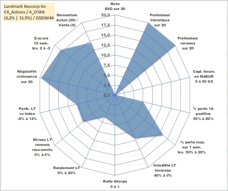 Site dédié aux investisseursPage dédiée sur site financeAnalyse des valorisations hebdomadaires de l'action Landmark Bancorp Inc. Cet actif est cote en USD. Les valorisations sont en contrevaleur EURO et couvrent les semaines 1997W01 a 2025W44. Les revenus de cet actif financier sont pris en compte depuis la semaine 1997W05. La note ESG de cet actif n'est pas connue.
