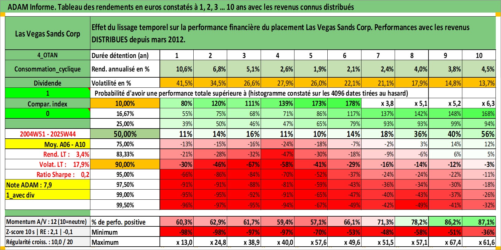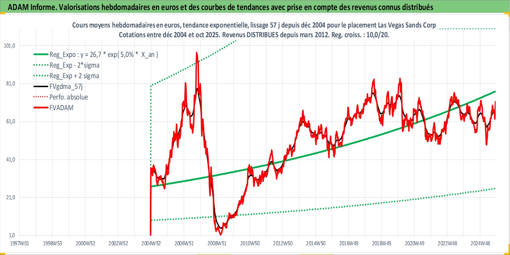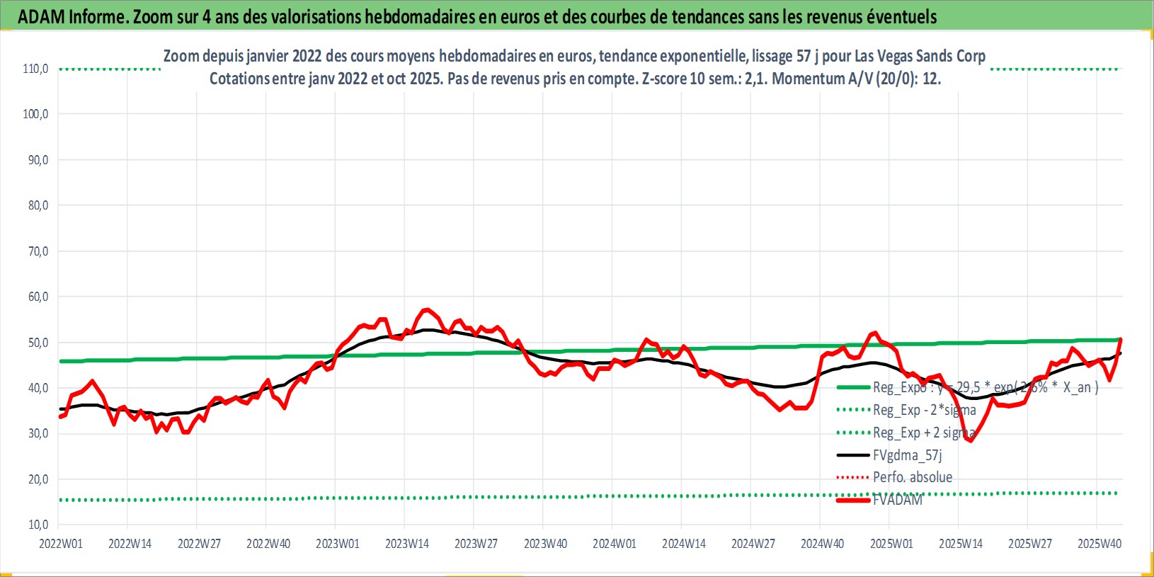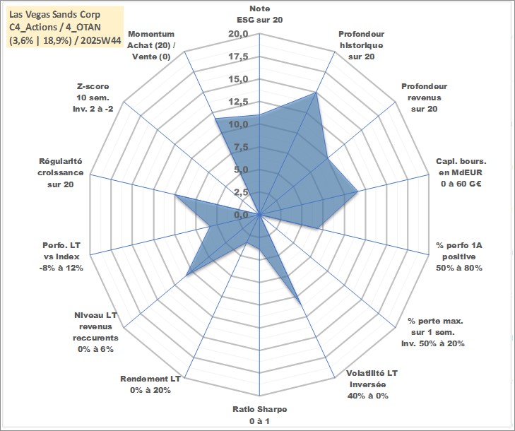 Site dédié aux investisseursPage dédiée sur site financeAnalyse des valorisations hebdomadaires de l'action Las Vegas Sands Corp. Cet actif est cote en USD. Les valorisations sont en contrevaleur EURO et couvrent les semaines 2004W51 a 2025W44. Les revenus de cet actif financier sont pris en compte depuis la semaine 2012W11. La note globale ESG de cet actif est estimee a 11.0 (apres rebasage entre 0 et 20).
