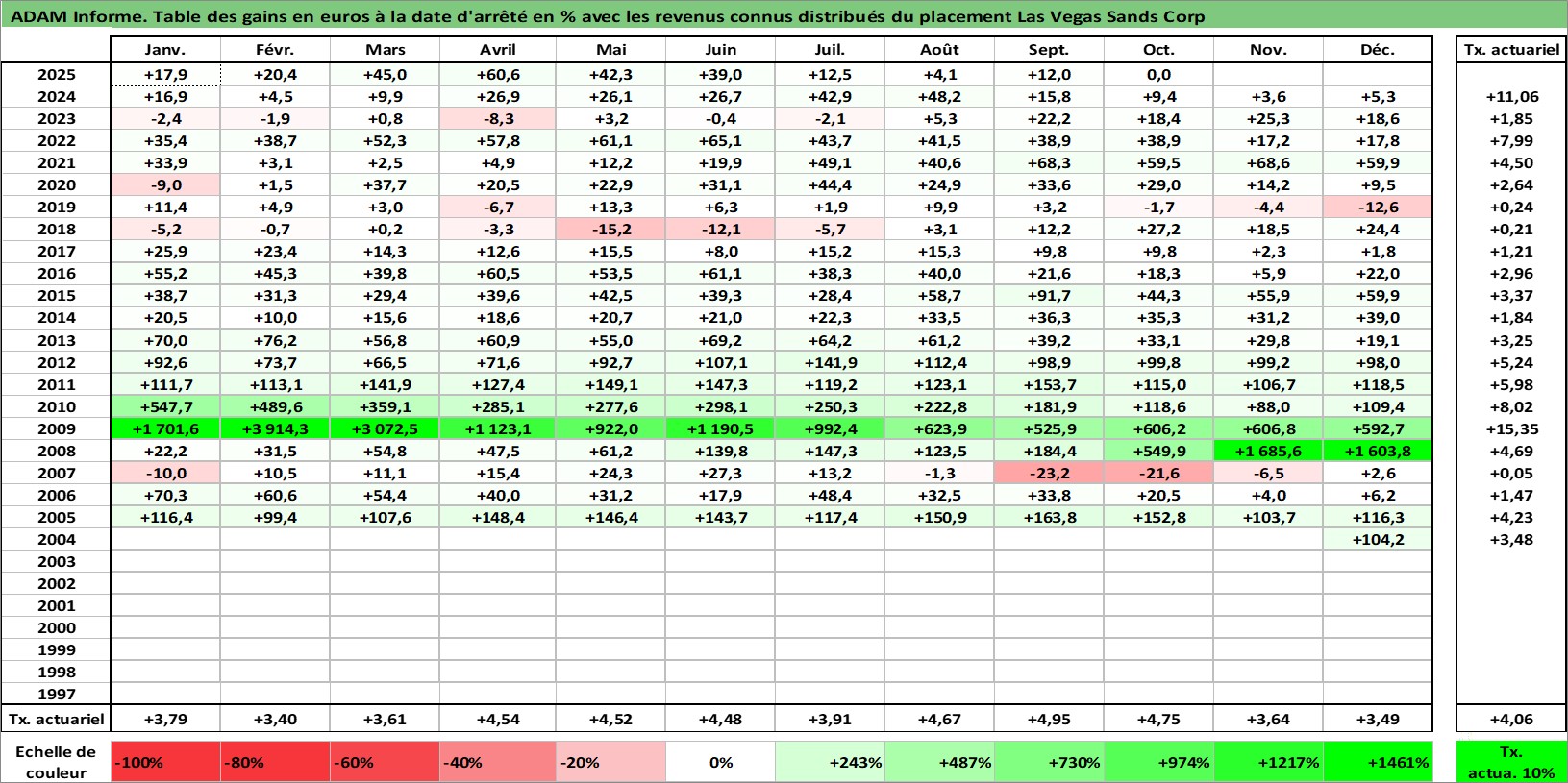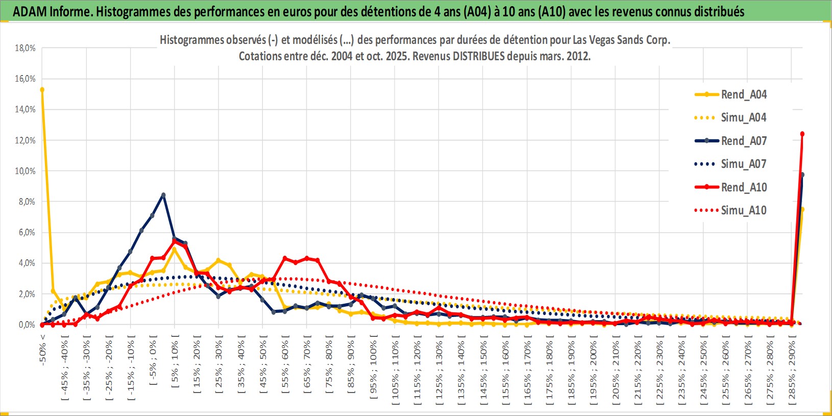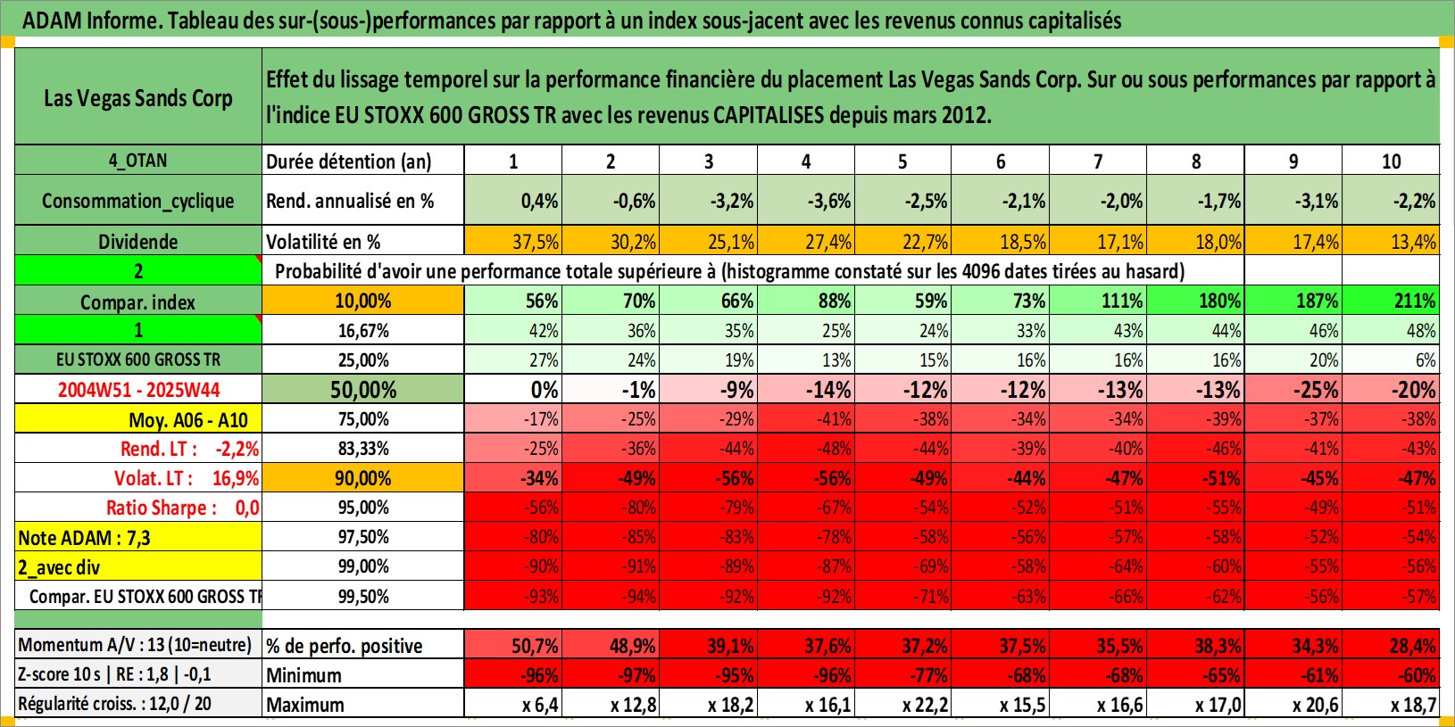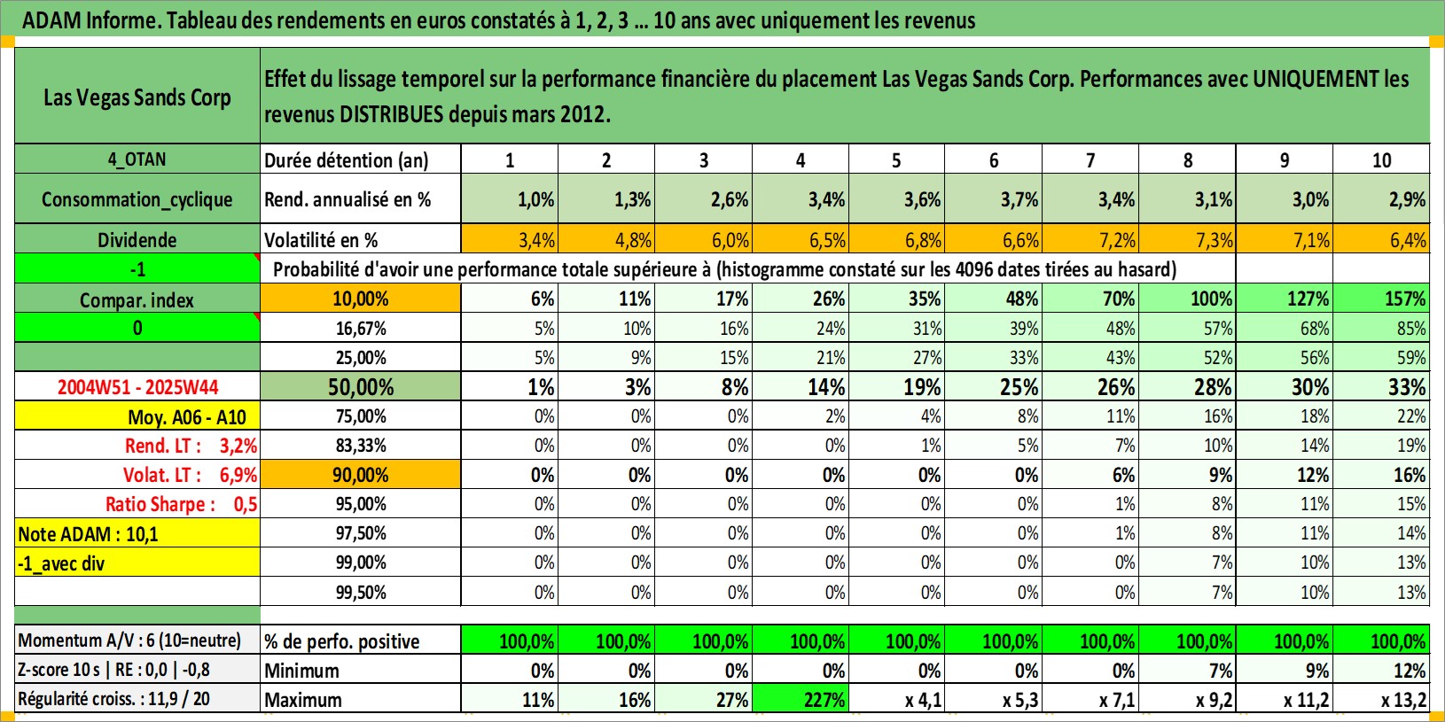 Site dédié aux investisseursPage dédiée sur site financeAnalyse des valorisations hebdomadaires de l'action Las Vegas Sands Corp. Cet actif est cote en USD. Les valorisations sont en contrevaleur EURO et couvrent les semaines 2004W51 a 2025W44. Les revenus de cet actif financier sont pris en compte depuis la semaine 2012W11. La note globale ESG de cet actif est estimee a 11.0 (apres rebasage entre 0 et 20).