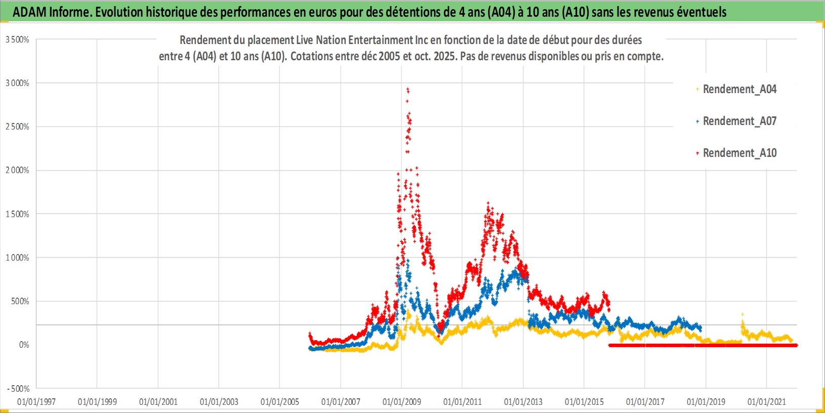 Site dédié aux investisseursPage dédiée sur site financeAnalyse des valorisations hebdomadaires de l'action Live Nation Entertainment Inc. Cet actif est cote en USD. Les valorisations sont en contrevaleur EURO et couvrent les semaines 2005W50 a 2025W44. Les revenus de cet actif financier ne sont pas connus car non existants ou non disponibles sur le site Yahoo Finance. La note ESG de cet actif n'est pas connue.