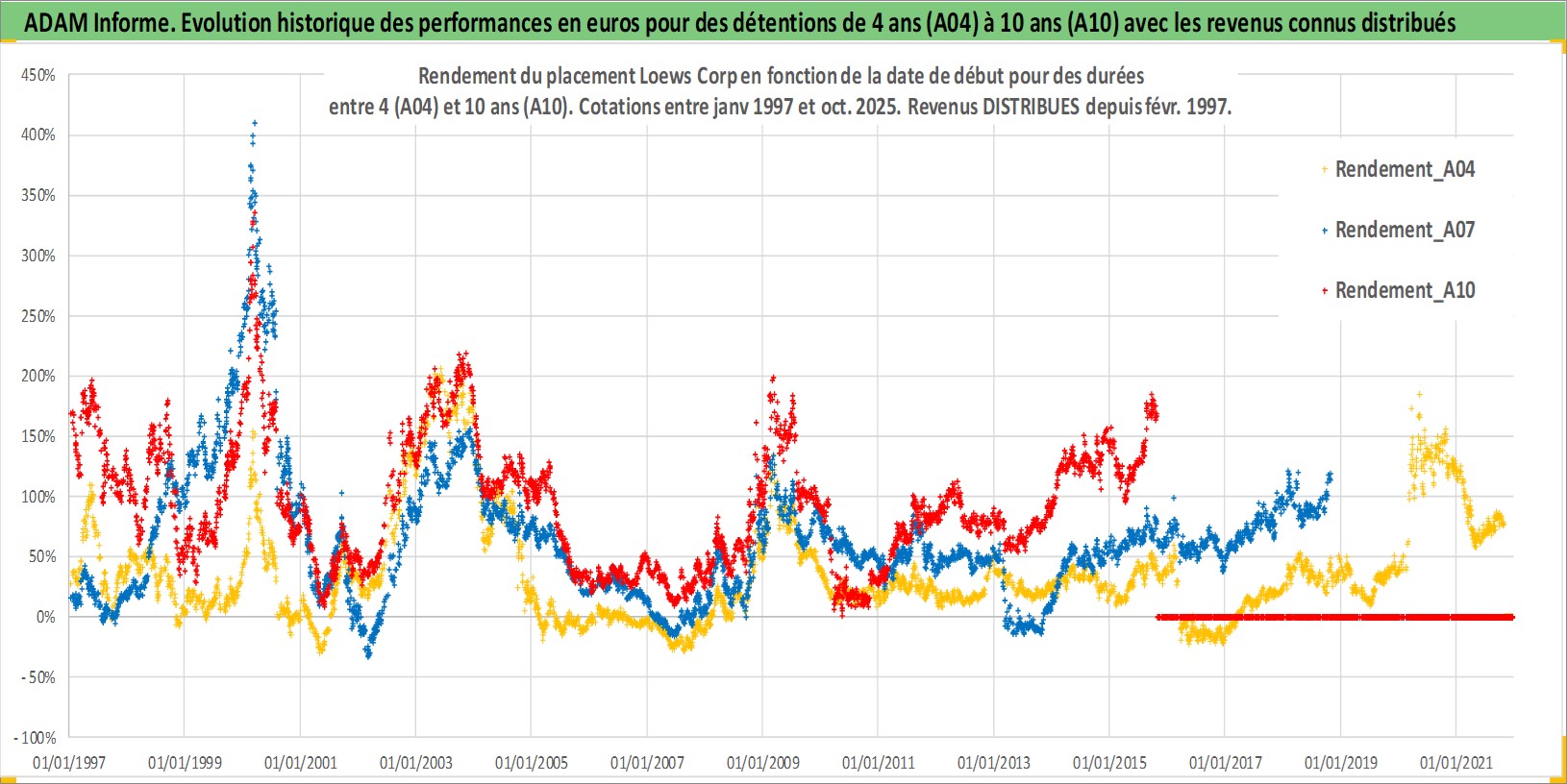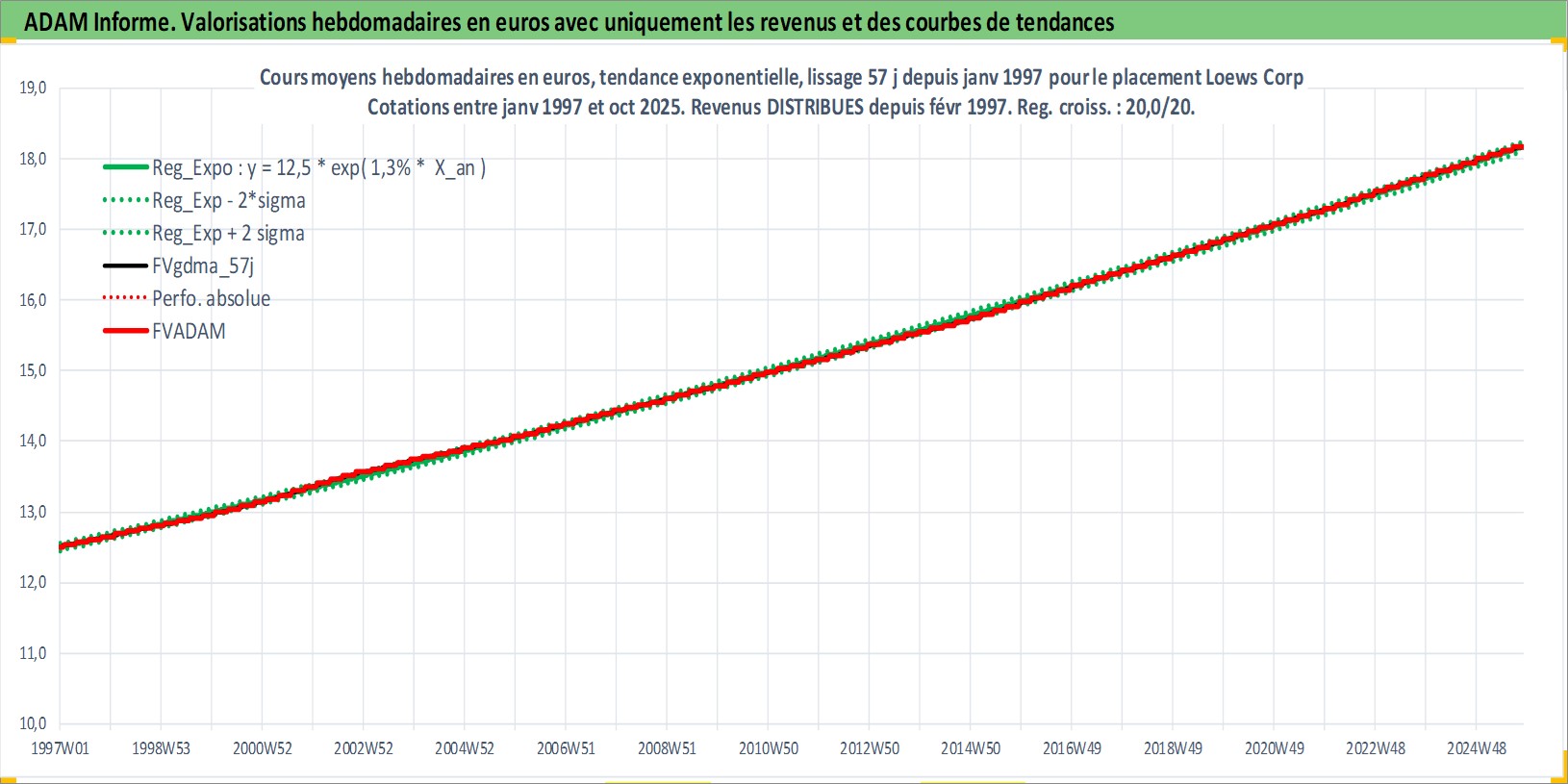 Site dédié aux investisseursPage dédiée sur site financeAnalyse des valorisations hebdomadaires de l'action Loews Corp. Cet actif est cote en USD. Les valorisations sont en contrevaleur EURO et couvrent les semaines 1997W01 a 2025W44. Les revenus de cet actif financier sont pris en compte depuis la semaine 1997W06. La note globale ESG de cet actif est estimee a 13.0 (apres rebasage entre 0 et 20).