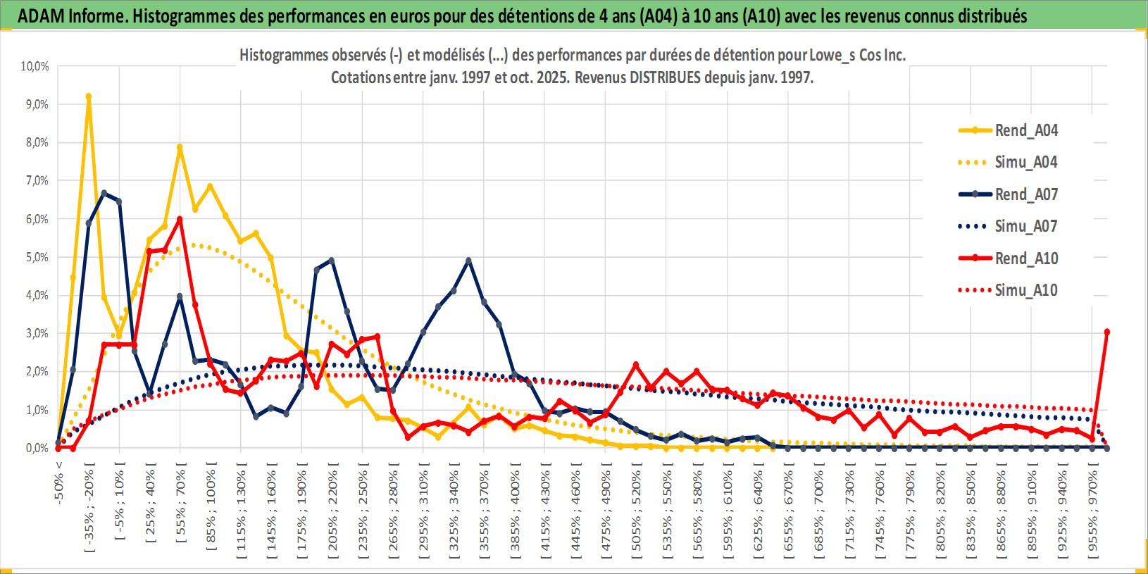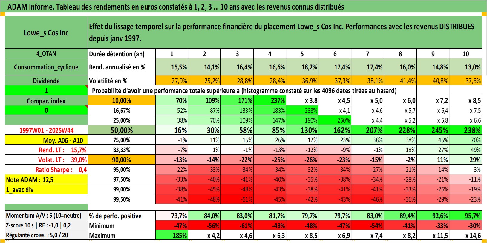 Site dédié aux investisseursPage dédiée sur site financeAnalyse des valorisations hebdomadaires de l'action Lowe_s Cos Inc. Cet actif est cote en USD. Les valorisations sont en contrevaleur EURO et couvrent les semaines 1997W01 a 2025W44. Les revenus de cet actif financier sont pris en compte depuis la semaine 1997W03. La note globale ESG de cet actif est estimee a 16.0 (apres rebasage entre 0 et 20).
