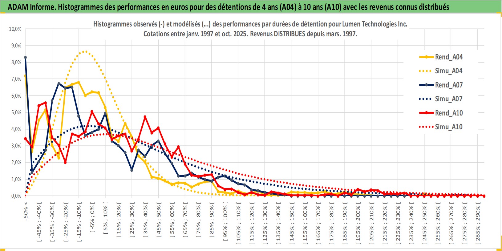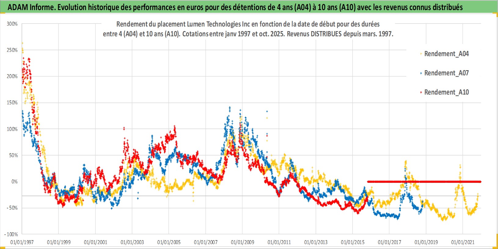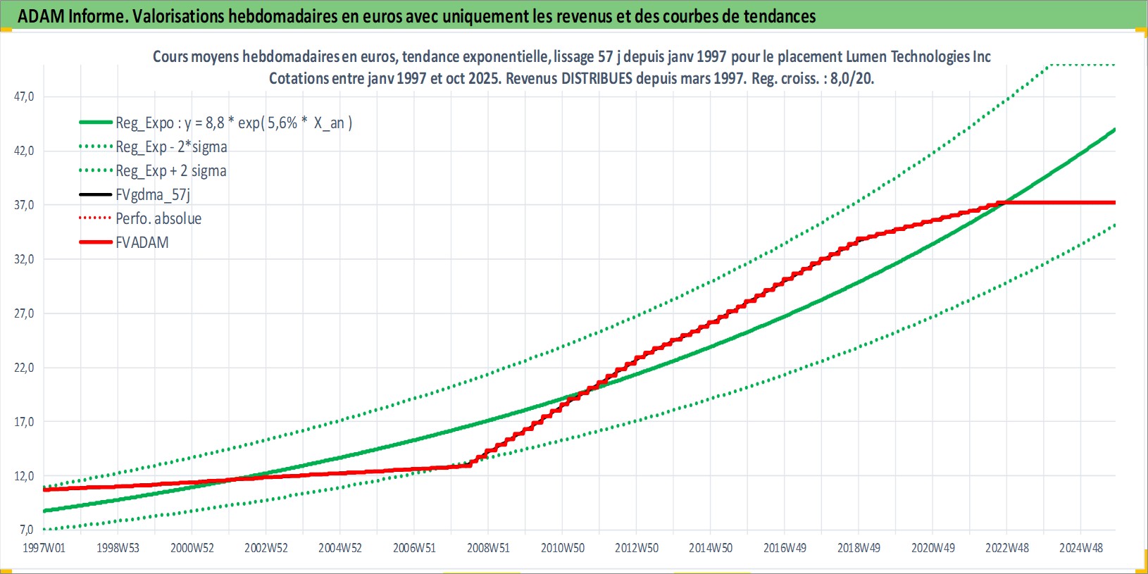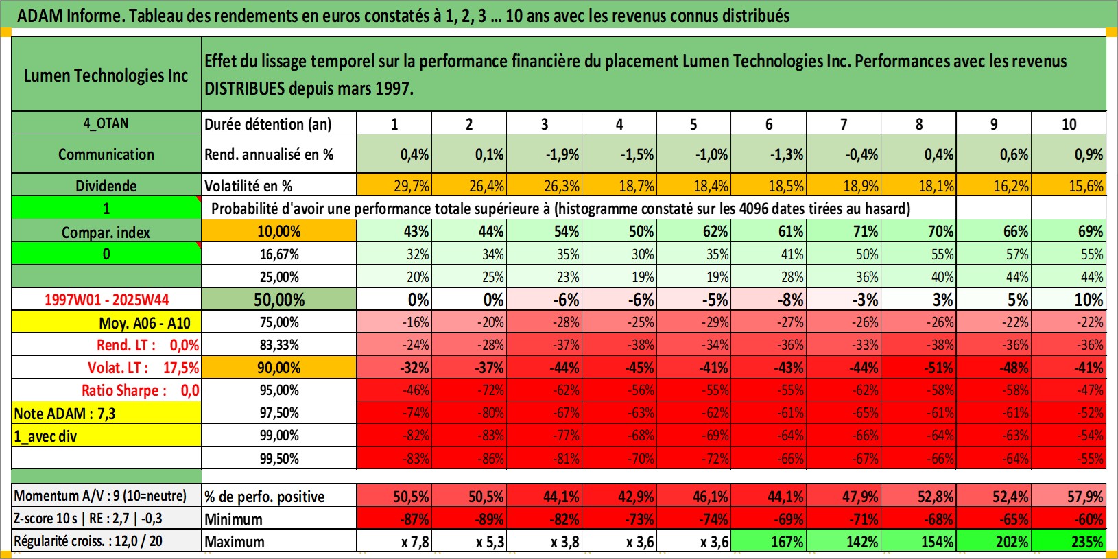 Site dédié aux investisseursPage dédiée sur site financeAnalyse des valorisations hebdomadaires de l'action Lumen Technologies Inc. Cet actif est cote en USD. Les valorisations sont en contrevaleur EURO et couvrent les semaines 1997W01 a 2025W44. Les revenus de cet actif financier sont pris en compte depuis la semaine 1997W10. La note globale ESG de cet actif est estimee a 9.0 (apres rebasage entre 0 et 20).