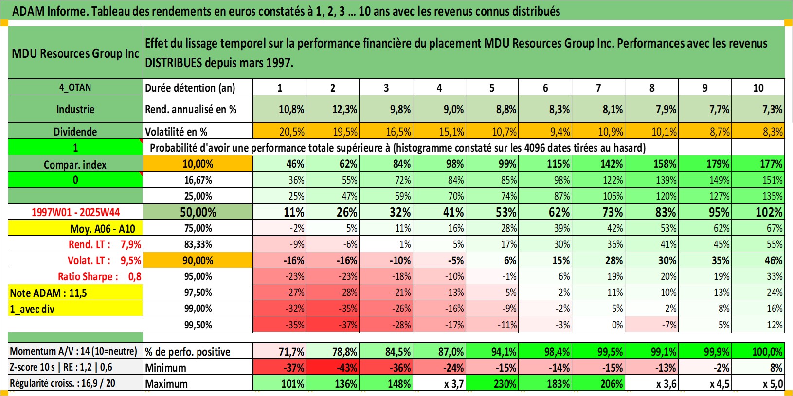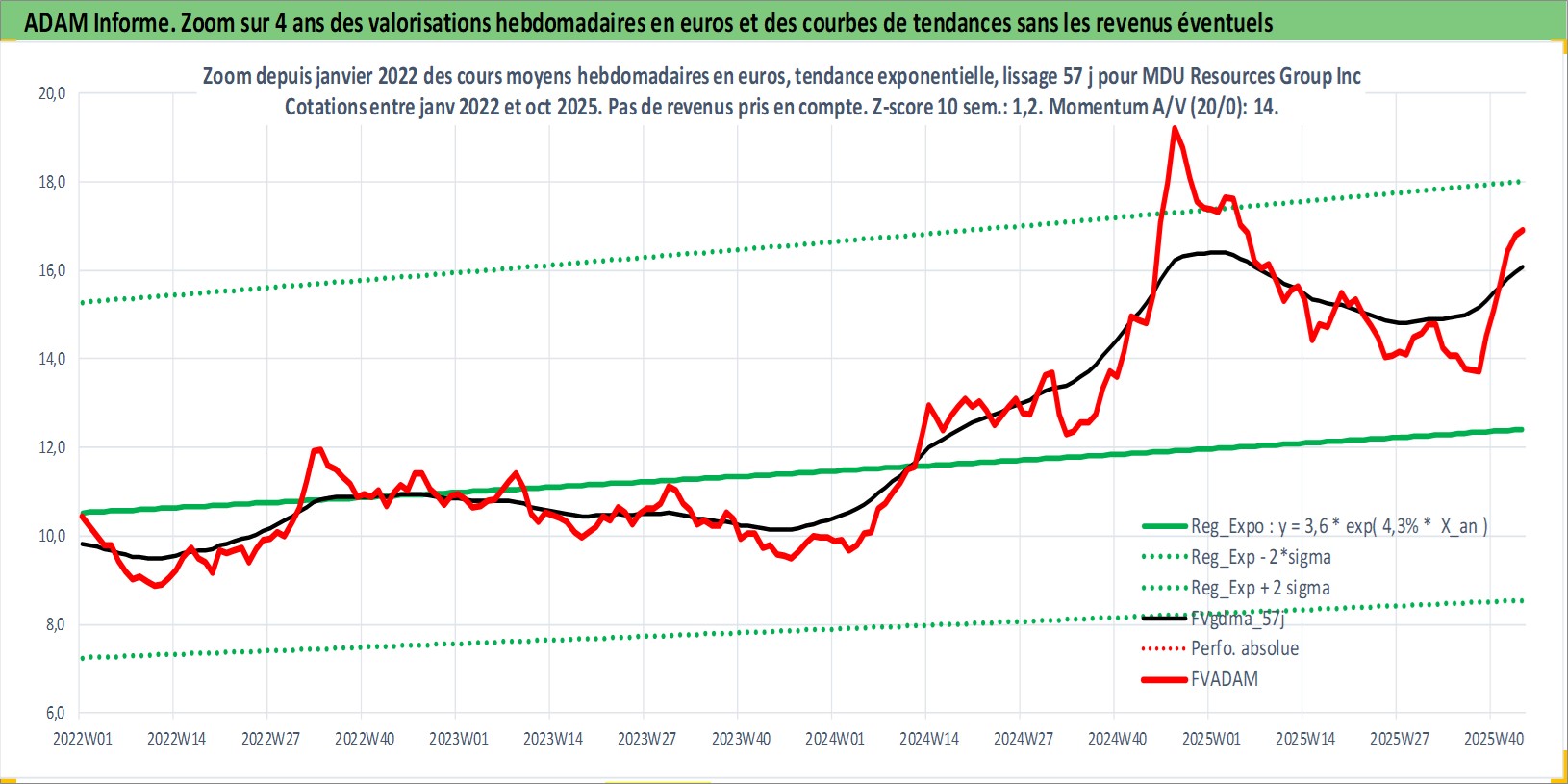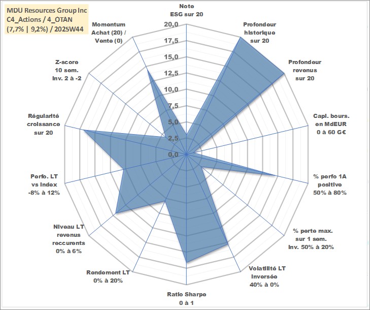 Site dédié aux investisseursPage dédiée sur site financeAnalyse des valorisations hebdomadaires de l'action MDU Resources Group Inc. Cet actif est cote en USD. Les valorisations sont en contrevaleur EURO et couvrent les semaines 1997W01 a 2025W44. Les revenus de cet actif financier sont pris en compte depuis la semaine 1997W11. La note globale ESG de cet actif est estimee a 3.0 (apres rebasage entre 0 et 20).