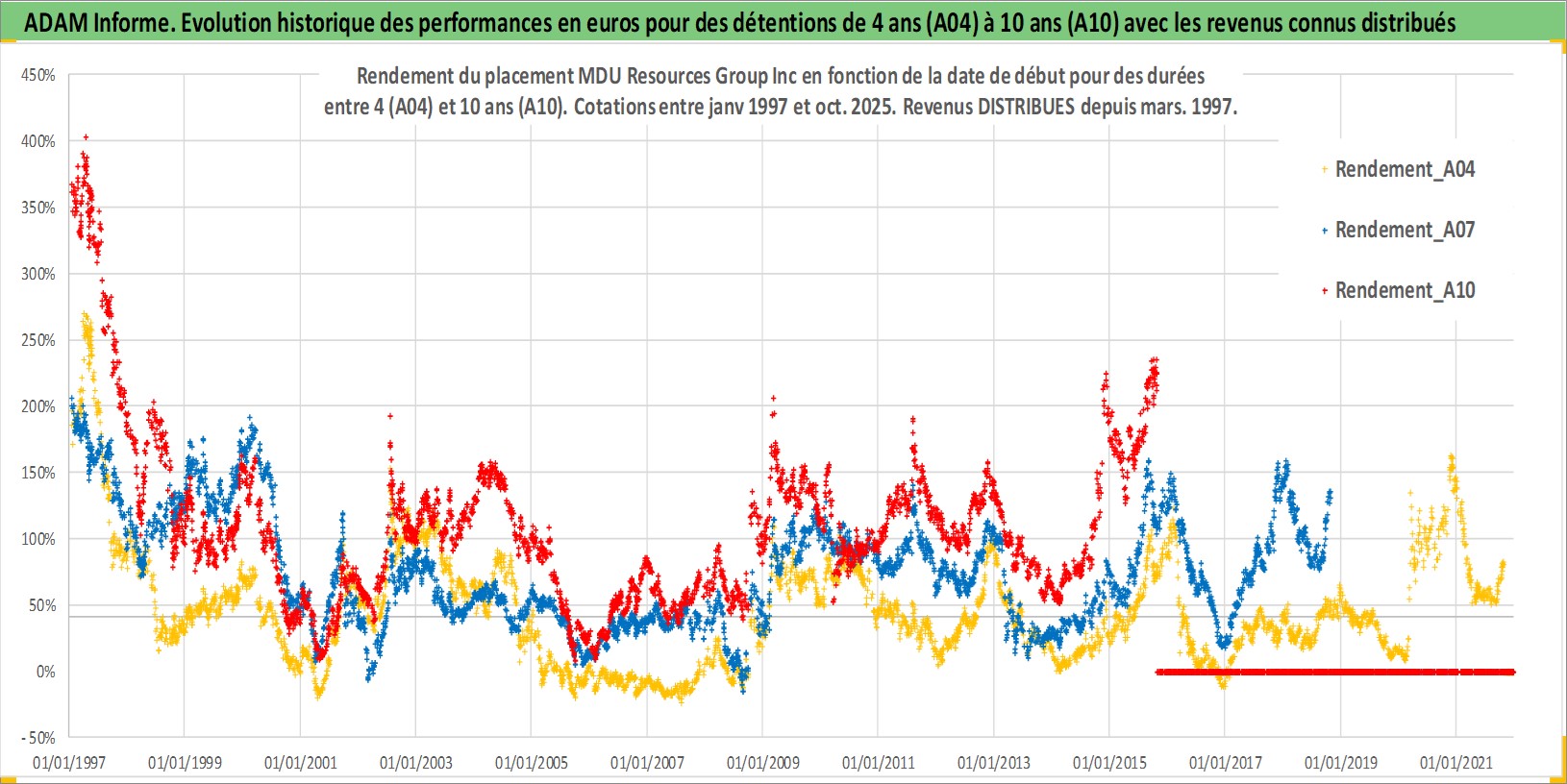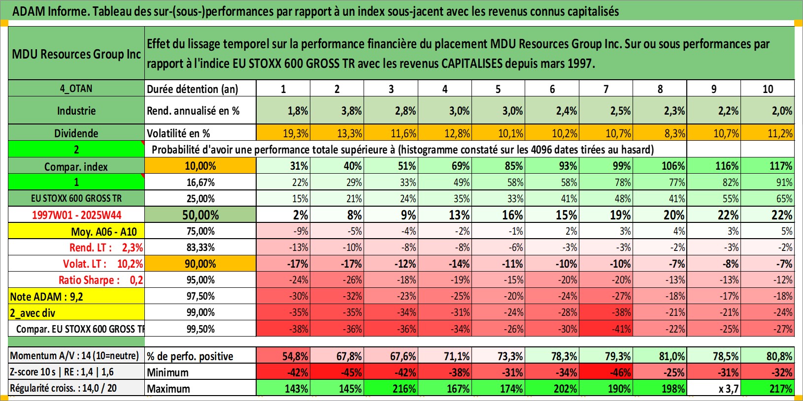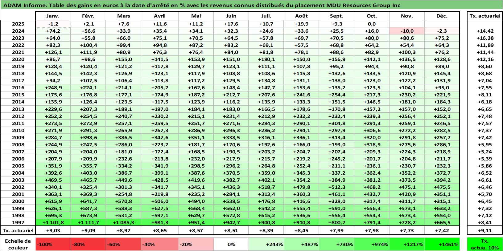 Site dédié aux investisseursPage dédiée sur site financeAnalyse des valorisations hebdomadaires de l'action MDU Resources Group Inc. Cet actif est cote en USD. Les valorisations sont en contrevaleur EURO et couvrent les semaines 1997W01 a 2025W44. Les revenus de cet actif financier sont pris en compte depuis la semaine 1997W11. La note globale ESG de cet actif est estimee a 3.0 (apres rebasage entre 0 et 20).