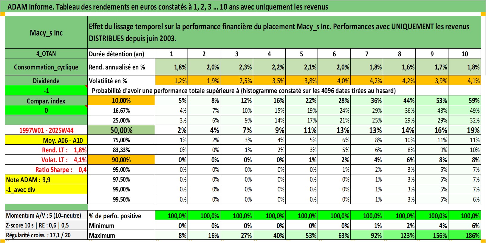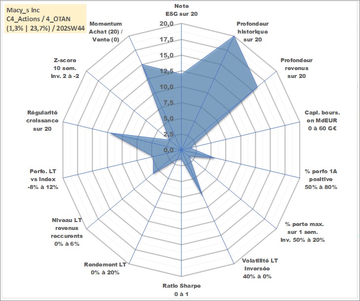 Site dédié aux investisseursPage dédiée sur site financeAnalyse des valorisations hebdomadaires de l'action Macy_s Inc. Cet actif est cote en USD. Les valorisations sont en contrevaleur EURO et couvrent les semaines 1997W01 a 2025W44. Les revenus de cet actif financier sont pris en compte depuis la semaine 2003W24. La note globale ESG de cet actif est estimee a 12.0 (apres rebasage entre 0 et 20).