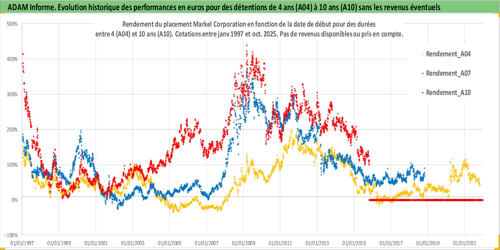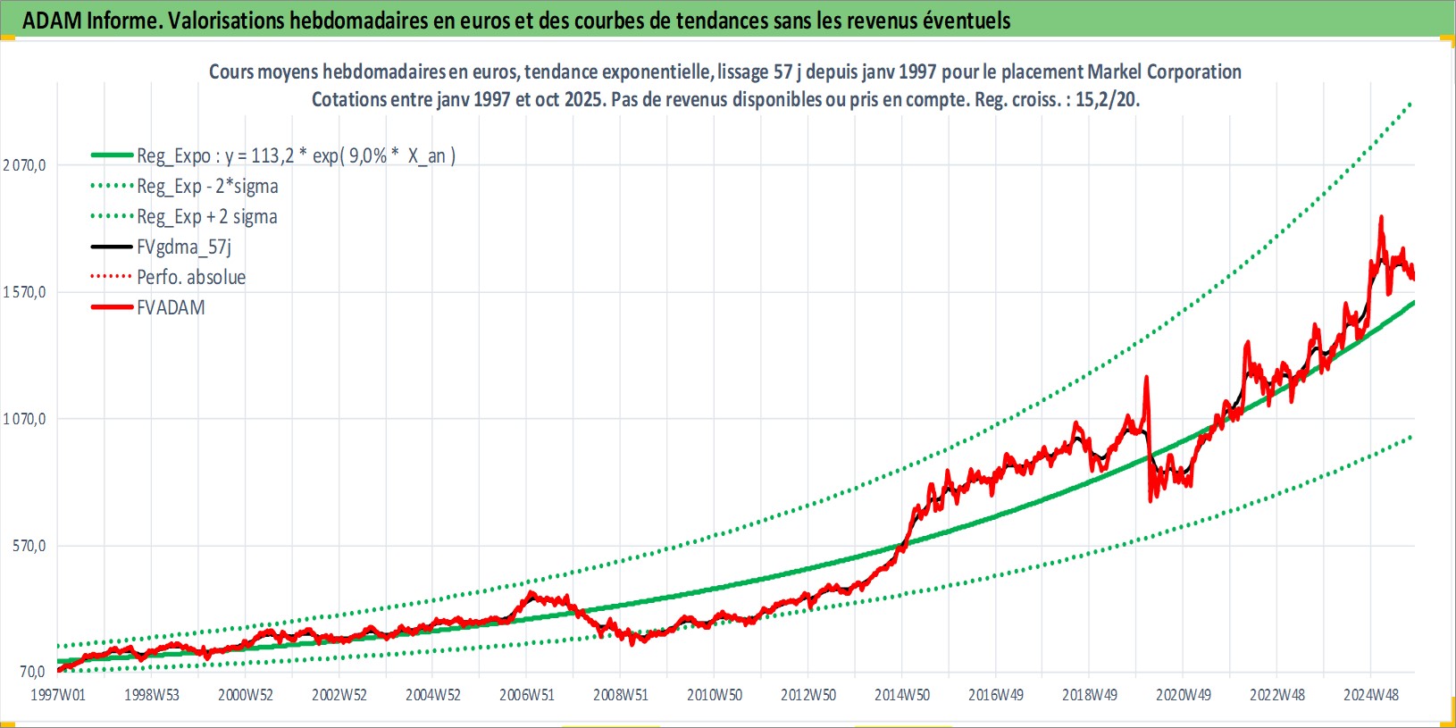 Site dédié aux investisseursPage dédiée sur site financeAnalyse des valorisations hebdomadaires de l'action Markel Corporation. Cet actif est cote en USD. Les valorisations sont en contrevaleur EURO et couvrent les semaines 1997W01 a 2025W44. Les revenus de cet actif financier ne sont pas connus car non existants ou non disponibles sur le site Yahoo Finance. La note globale ESG de cet actif est estimee a 6.0 (apres rebasage entre 0 et 20).