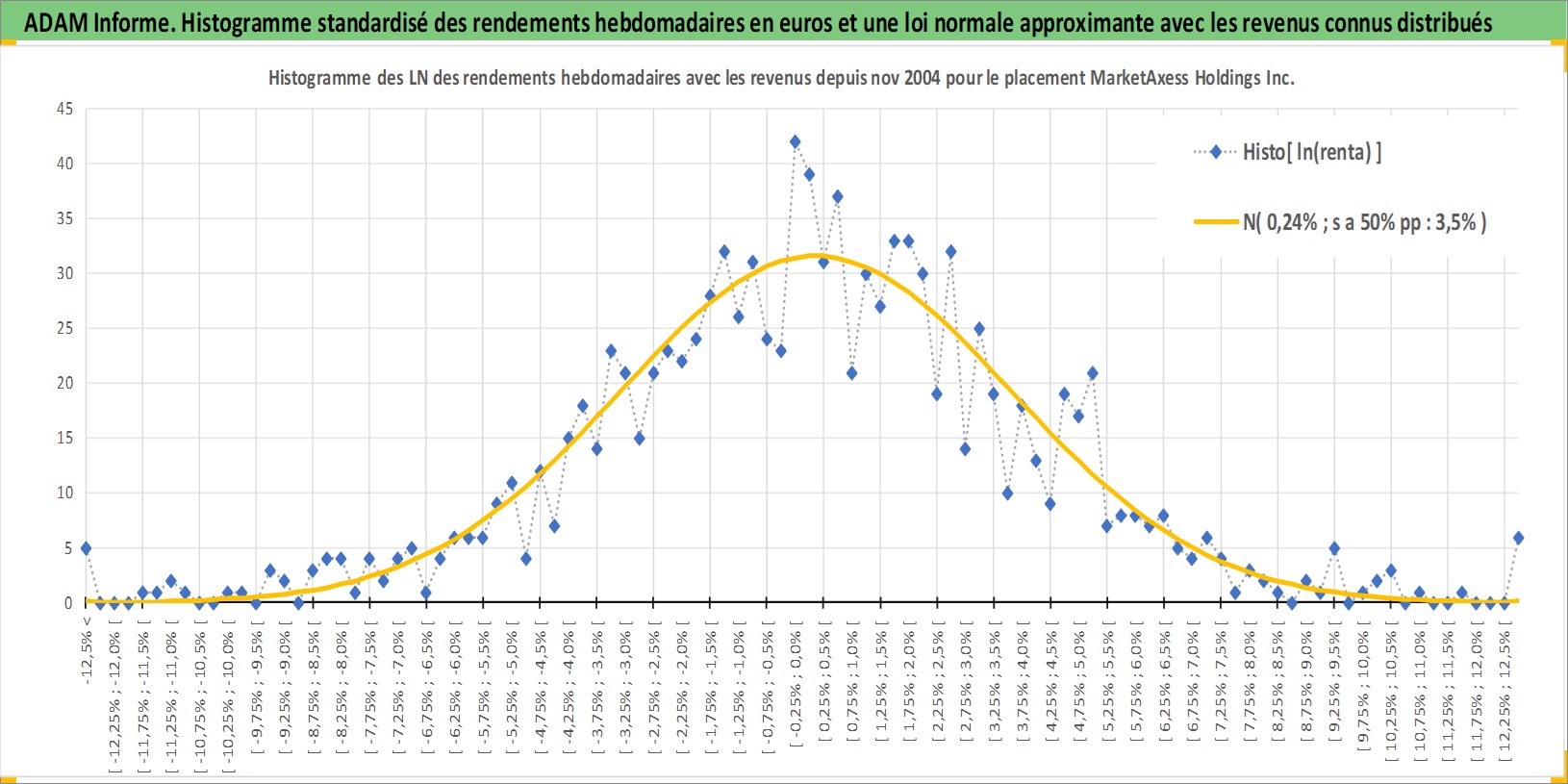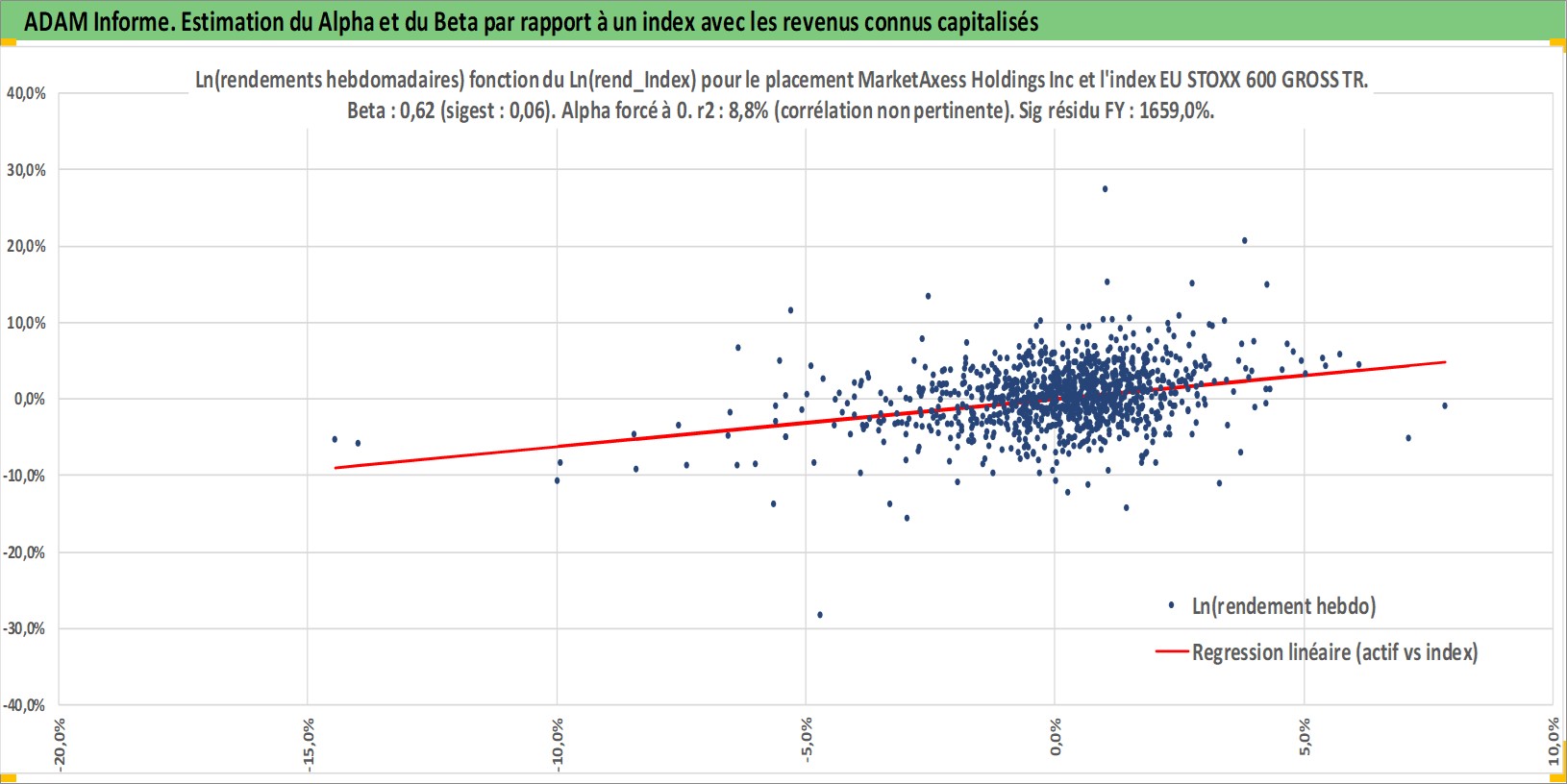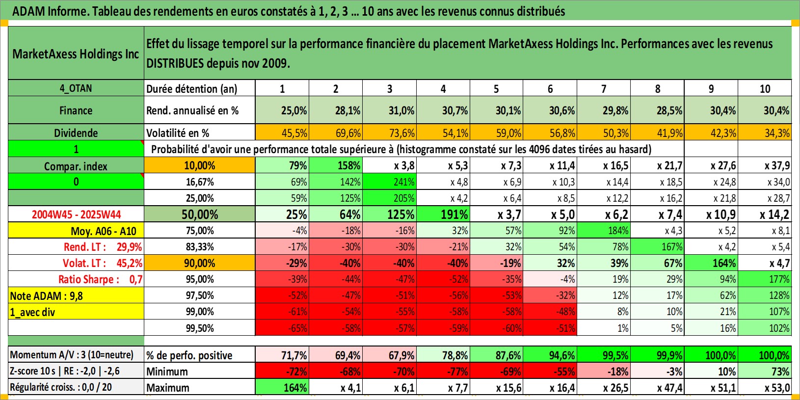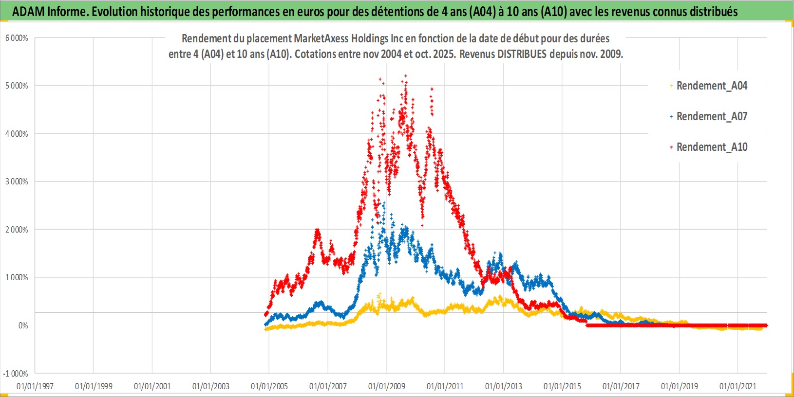 Site dédié aux investisseursPage dédiée sur site financeAnalyse des valorisations hebdomadaires de l'action MarketAxess Holdings Inc. Cet actif est cote en USD. Les valorisations sont en contrevaleur EURO et couvrent les semaines 2004W45 a 2025W44. Les revenus de cet actif financier sont pris en compte depuis la semaine 2009W45. La note ESG de cet actif n'est pas connue.