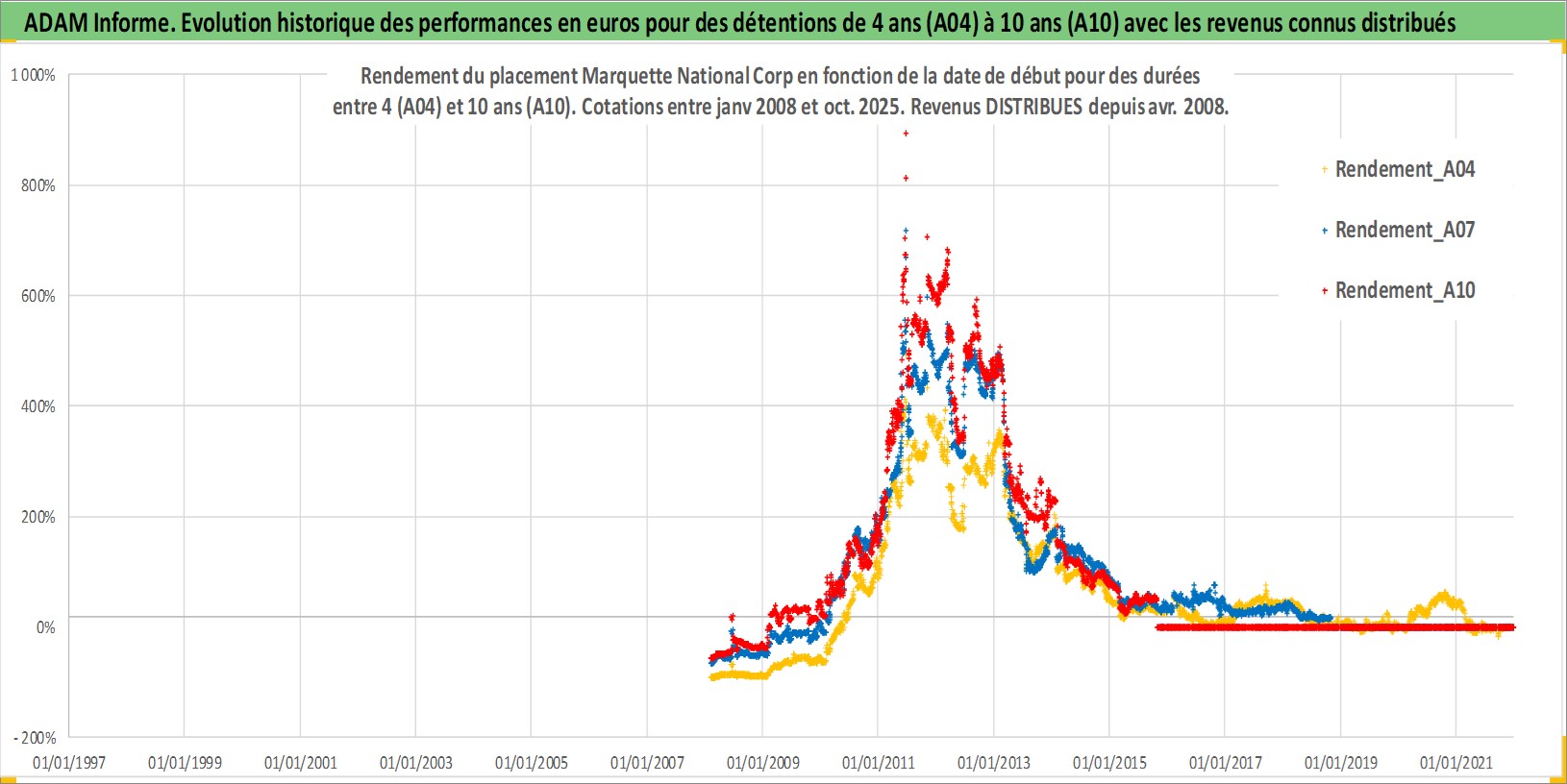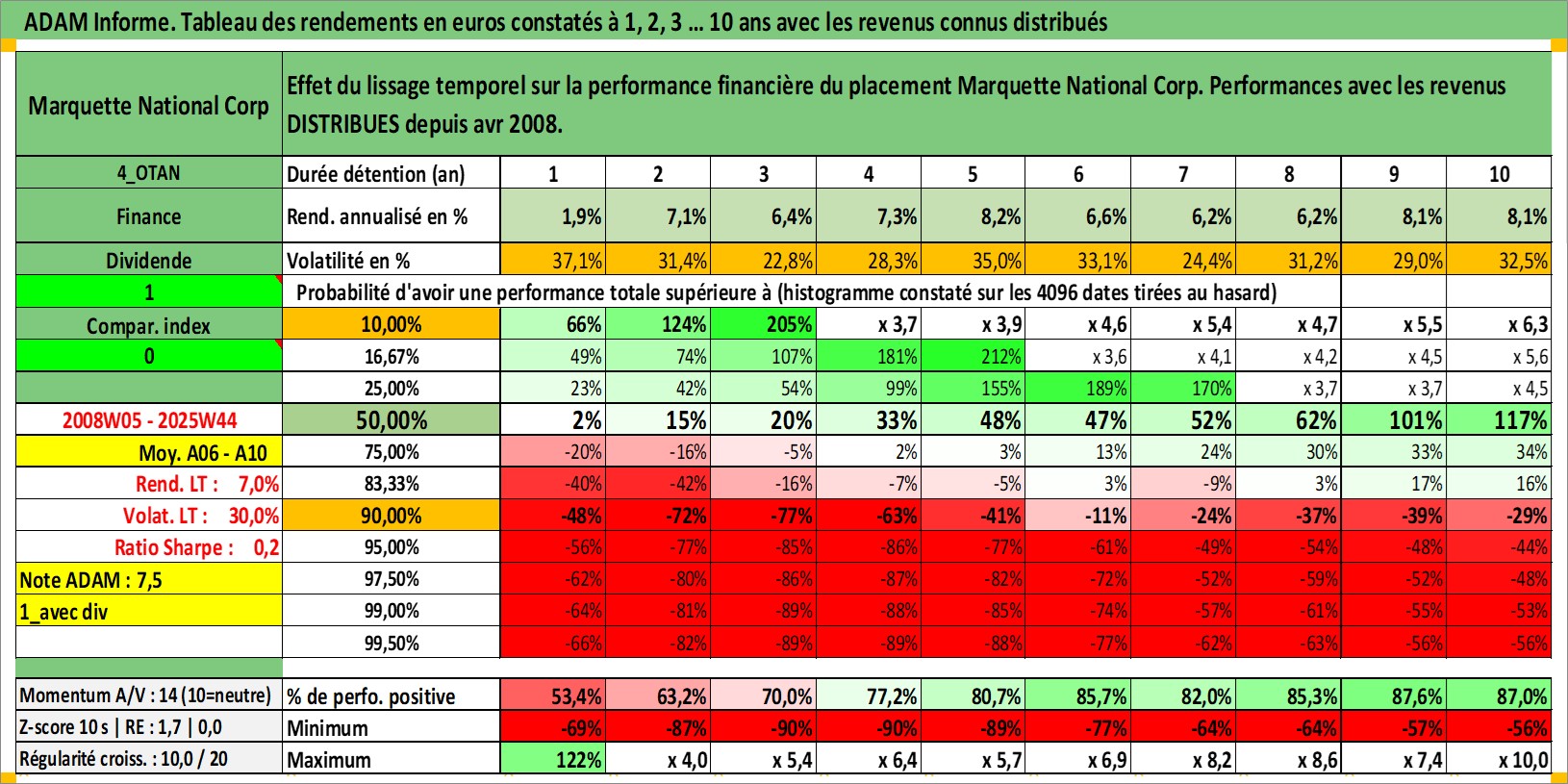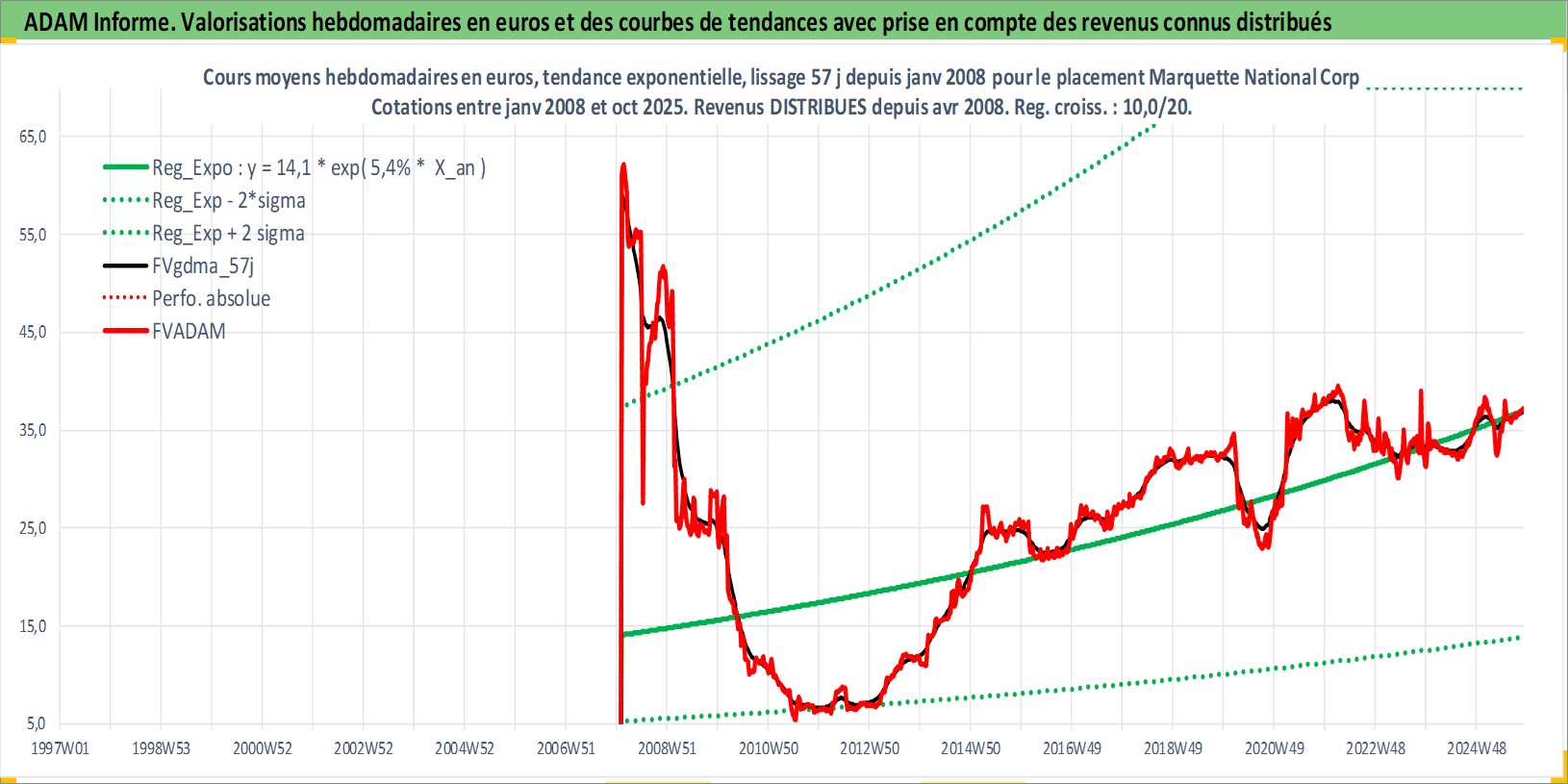 Site dédié aux investisseursPage dédiée sur site financeAnalyse des valorisations hebdomadaires de l'action Marquette National Corp. Cet actif est cote en USD. Les valorisations sont en contrevaleur EURO et couvrent les semaines 2008W05 a 2025W44. Les revenus de cet actif financier sont pris en compte depuis la semaine 2008W16. La note ESG de cet actif n'est pas connue.