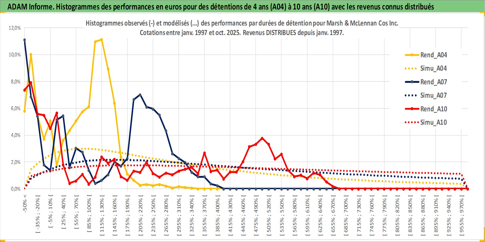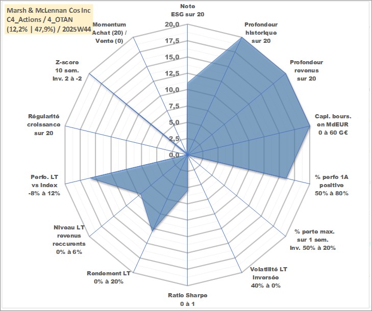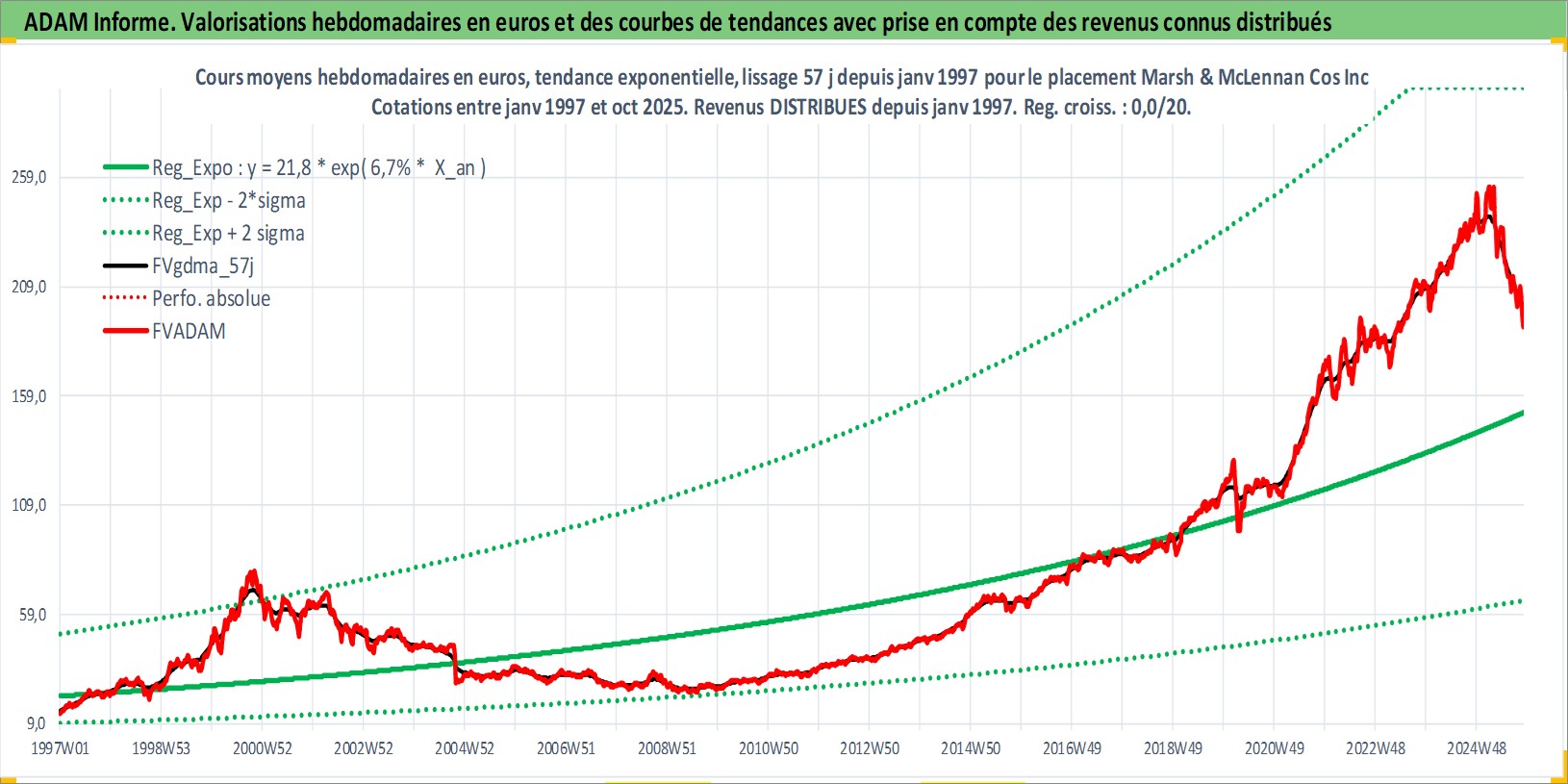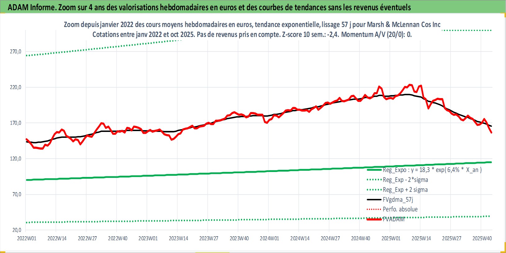 Site dédié aux investisseursPage dédiée sur site financeAnalyse des valorisations hebdomadaires de l'action Marsh & McLennan Cos Inc. Cet actif est cote en USD. Les valorisations sont en contrevaleur EURO et couvrent les semaines 1997W01 a 2025W44. Les revenus de cet actif financier sont pris en compte depuis la semaine 1997W02. La note globale ESG de cet actif est estimee a 11.0 (apres rebasage entre 0 et 20).