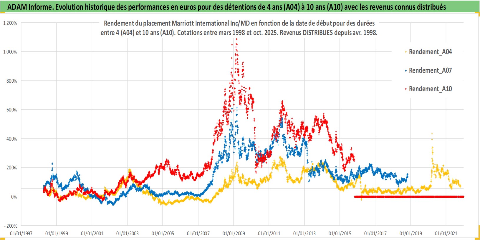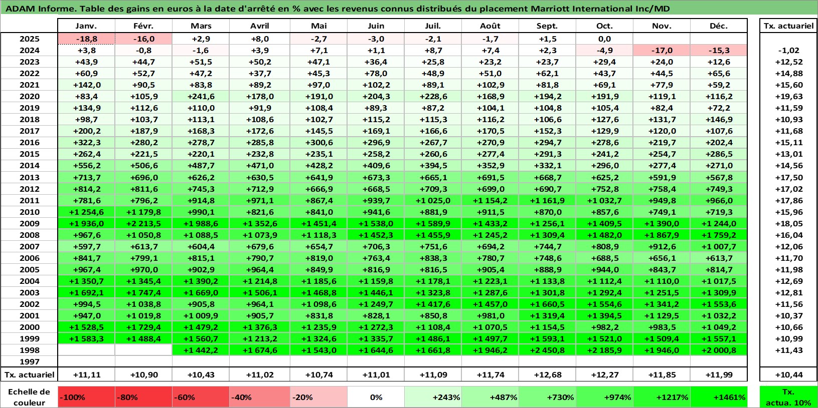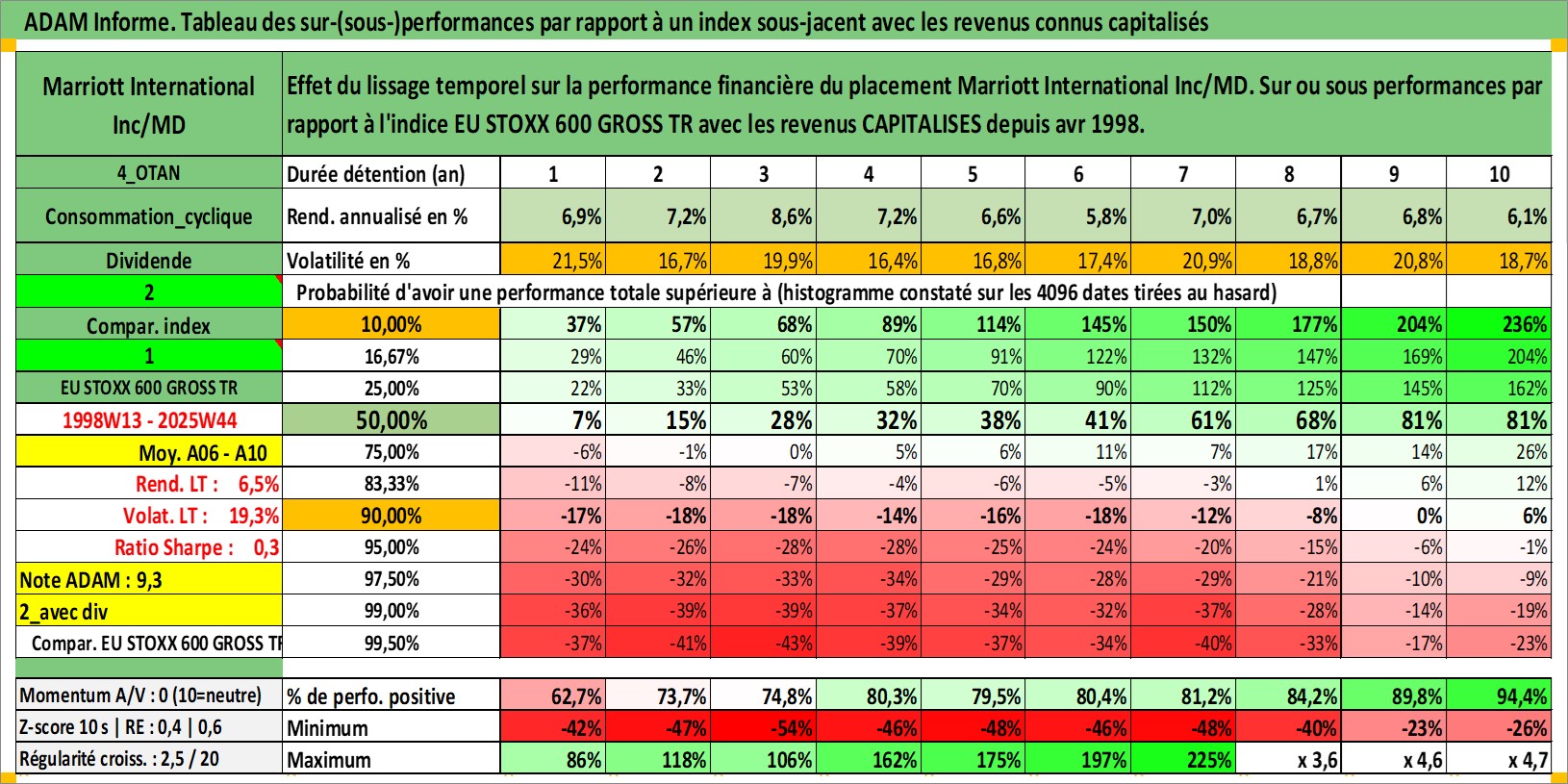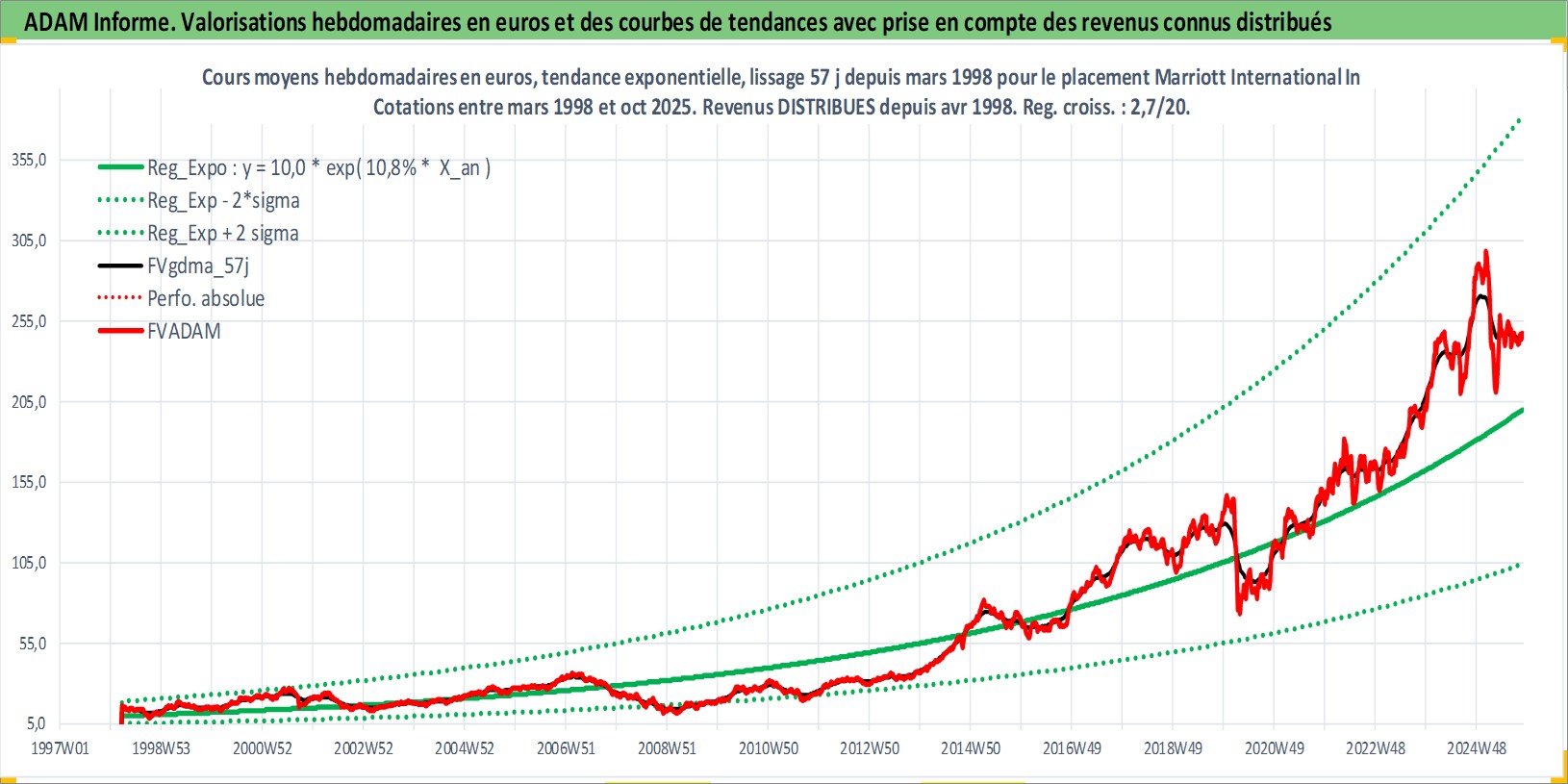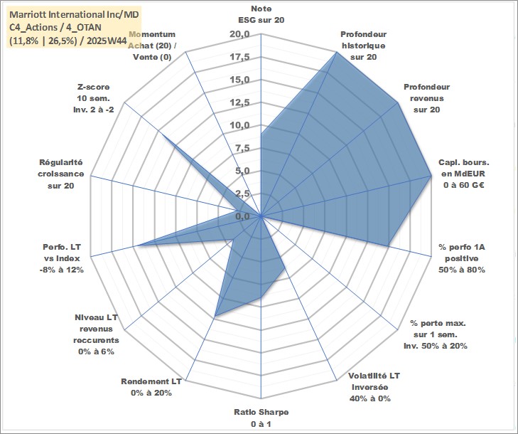 Site dédié aux investisseursPage dédiée sur site financeAnalyse des valorisations hebdomadaires de l'action Marriott International Inc/MD. Cet actif est cote en USD. Les valorisations sont en contrevaleur EURO et couvrent les semaines 1998W13 a 2025W44. Les revenus de cet actif financier sont pris en compte depuis la semaine 1998W16. La note globale ESG de cet actif est estimee a 9.0 (apres rebasage entre 0 et 20).