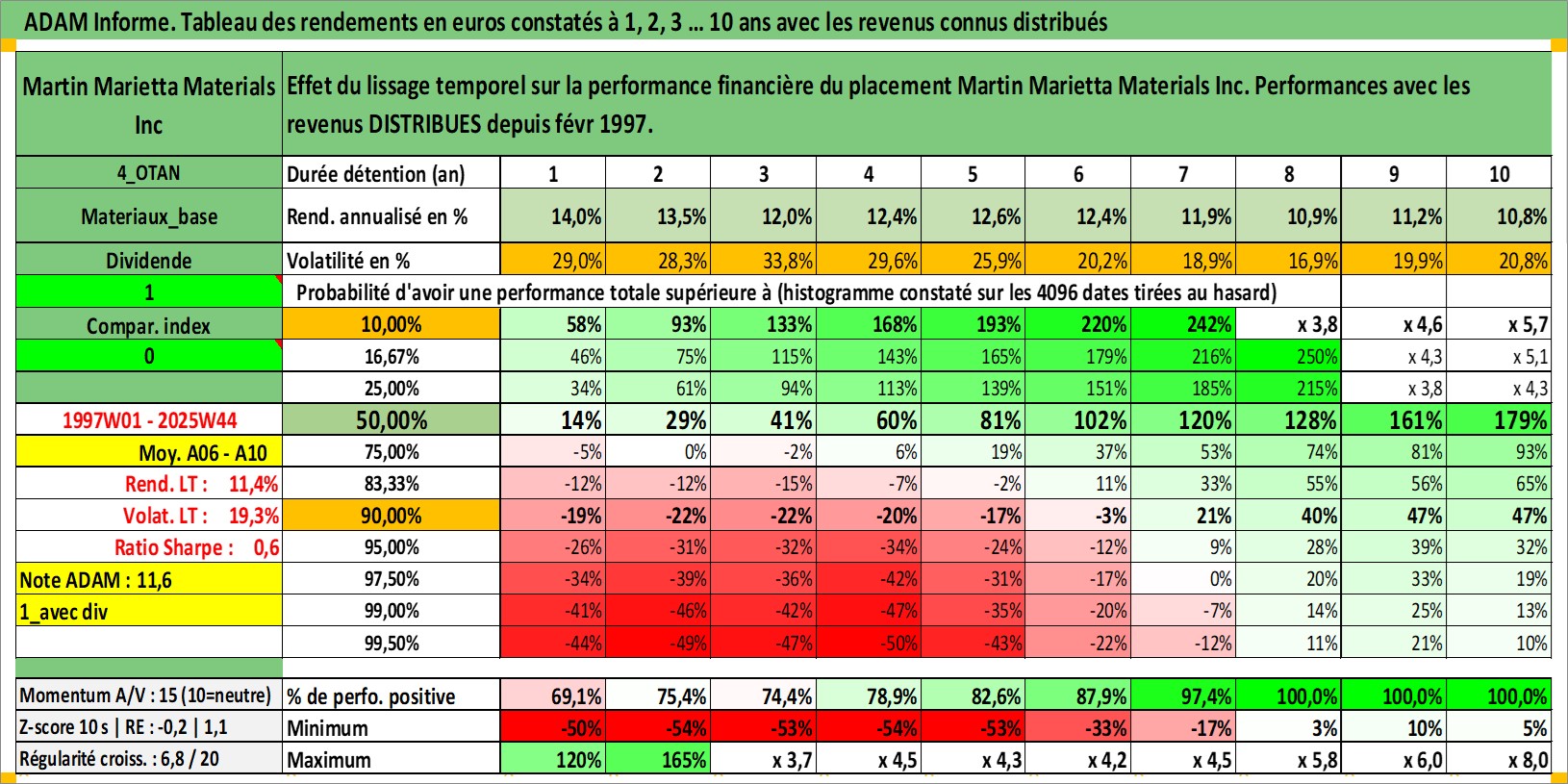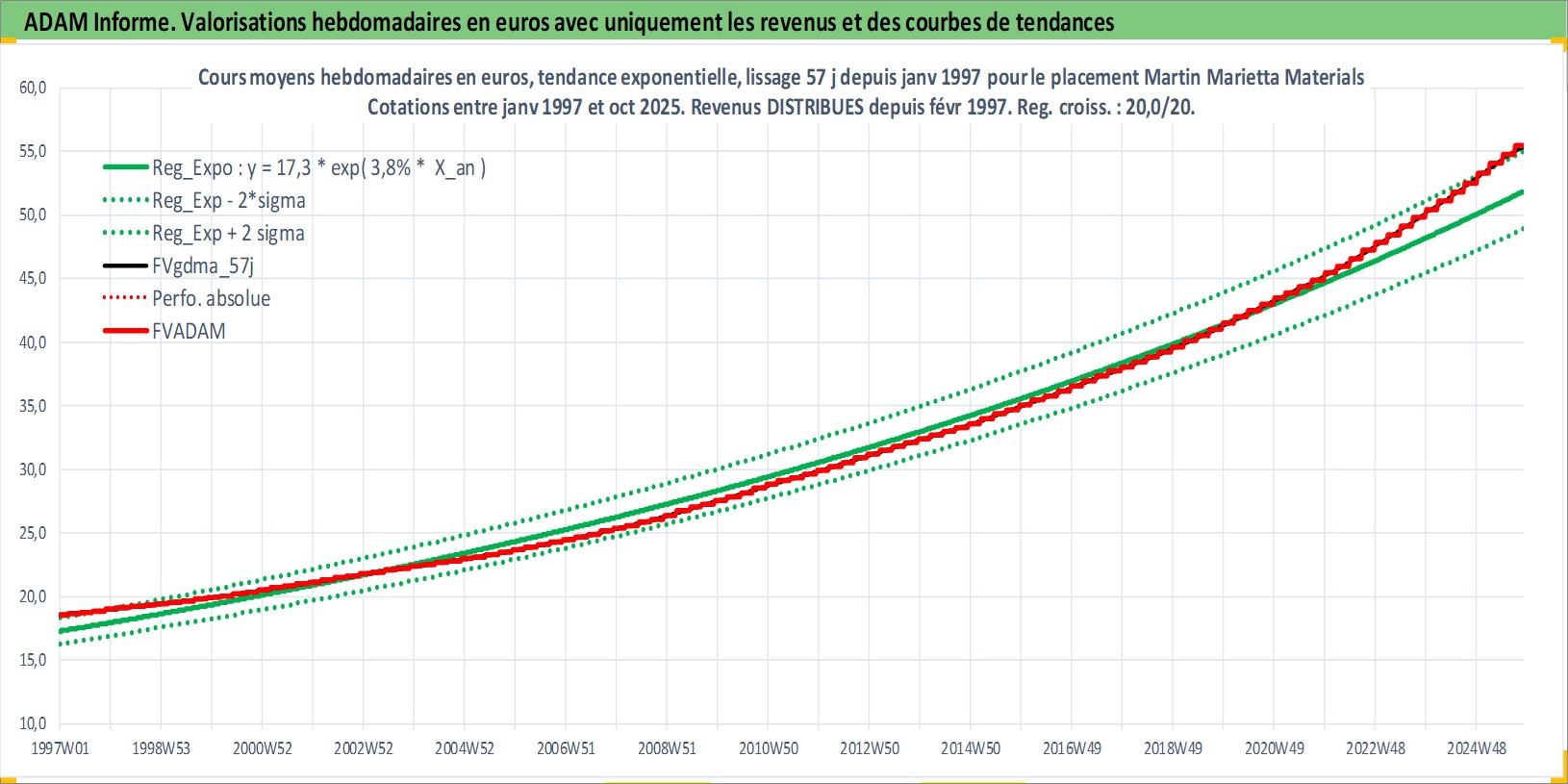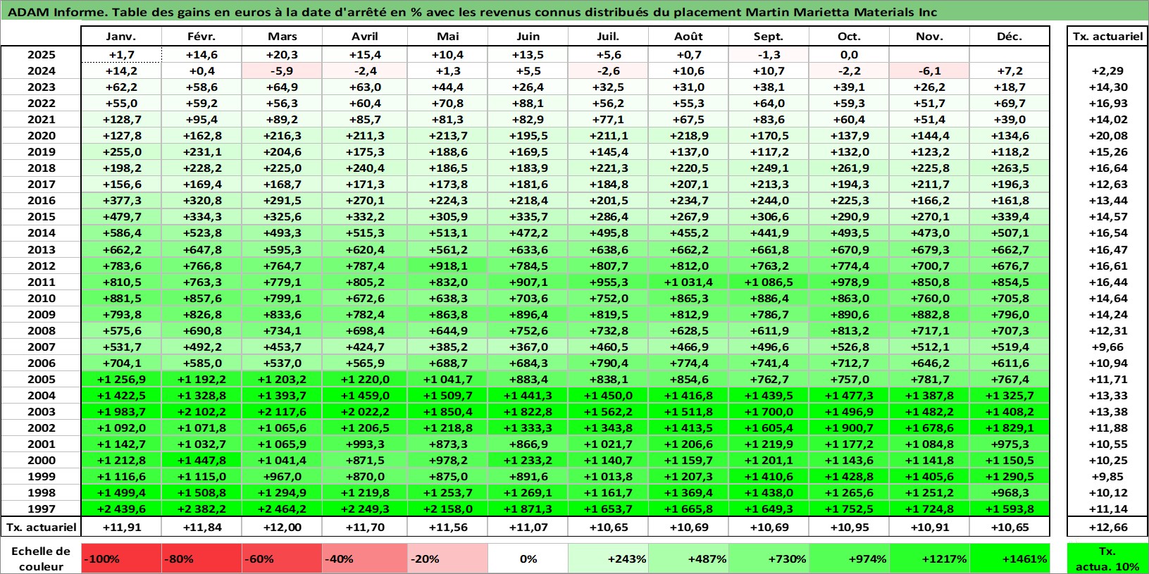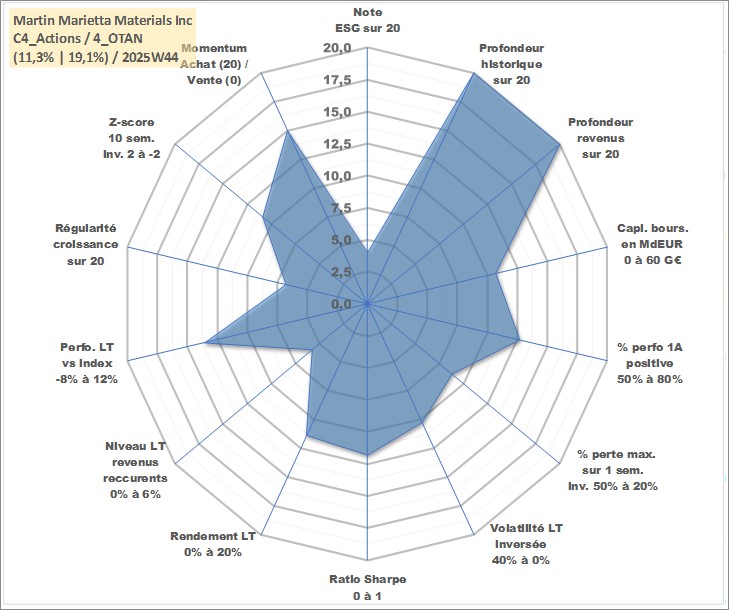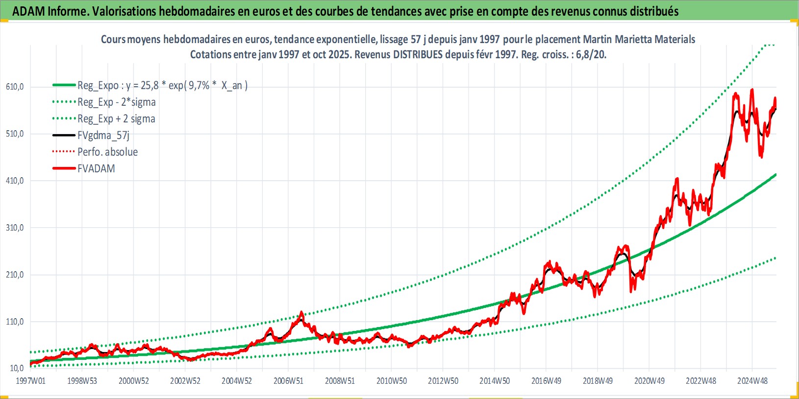 Site dédié aux investisseursPage dédiée sur site financeAnalyse des valorisations hebdomadaires de l'action Martin Marietta Materials Inc. Cet actif est cote en USD. Les valorisations sont en contrevaleur EURO et couvrent les semaines 1997W01 a 2025W44. Les revenus de cet actif financier sont pris en compte depuis la semaine 1997W09. La note globale ESG de cet actif est estimee a 4.0 (apres rebasage entre 0 et 20).