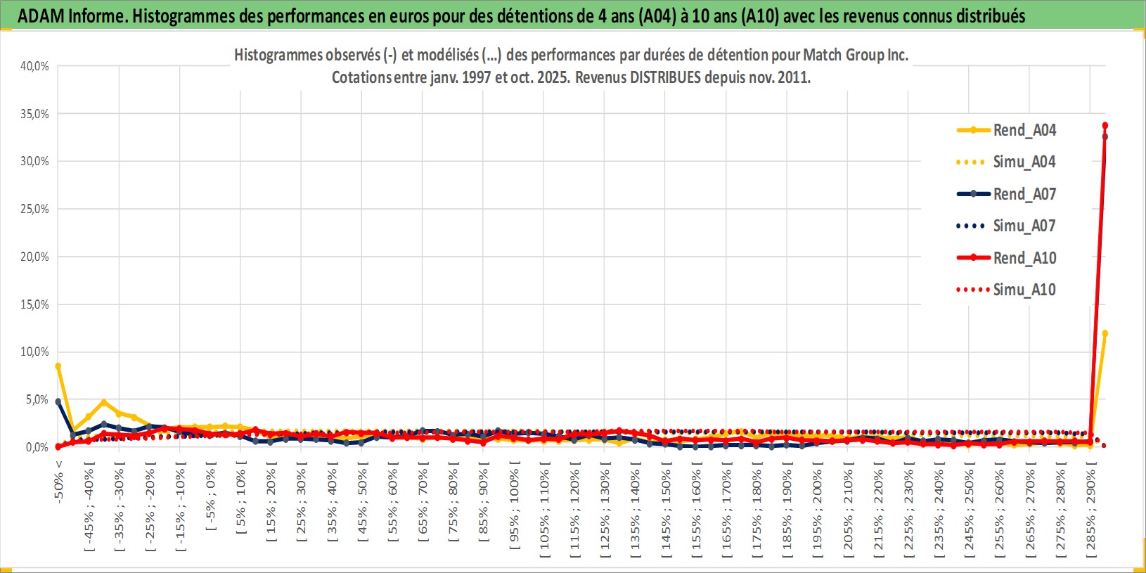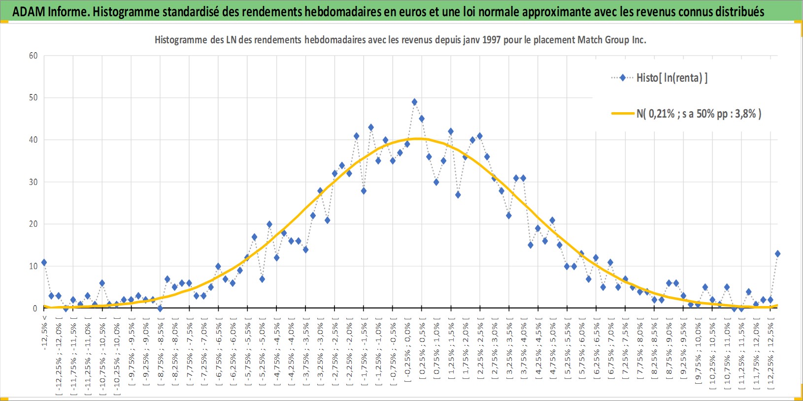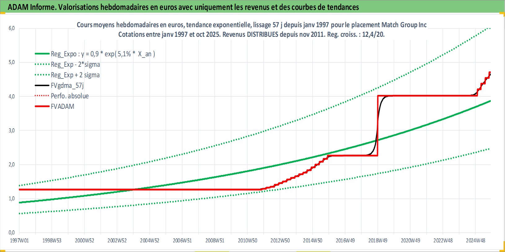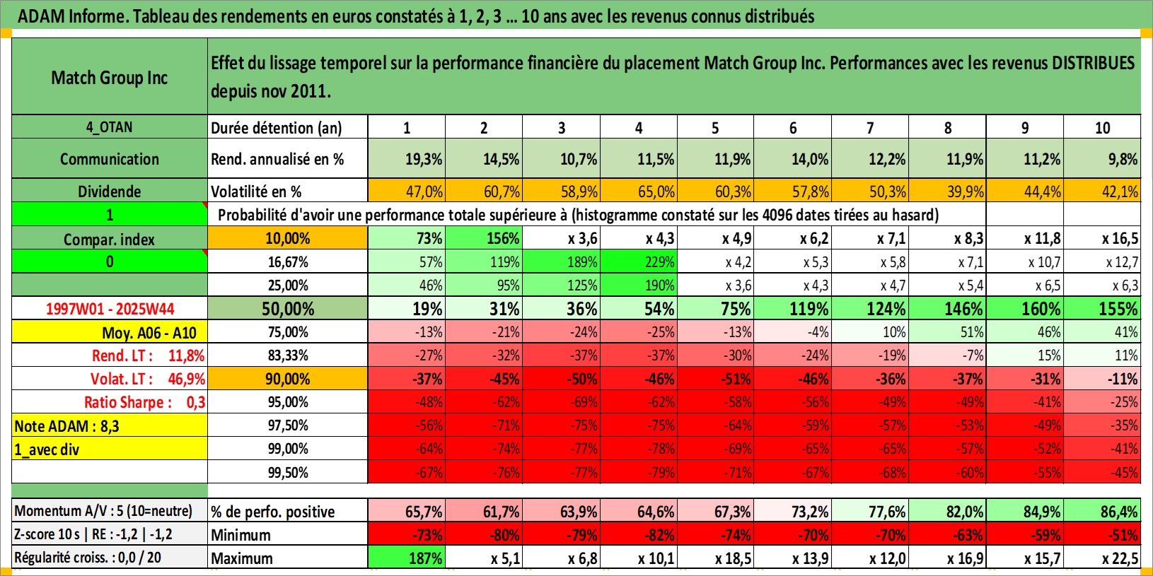 Site dédié aux investisseursPage dédiée sur site financeAnalyse des valorisations hebdomadaires de l'action Match Group Inc. Cet actif est cote en USD. Les valorisations sont en contrevaleur EURO et couvrent les semaines 1997W01 a 2025W44. Les revenus de cet actif financier sont pris en compte depuis la semaine 2011W45. La note ESG de cet actif n'est pas connue.