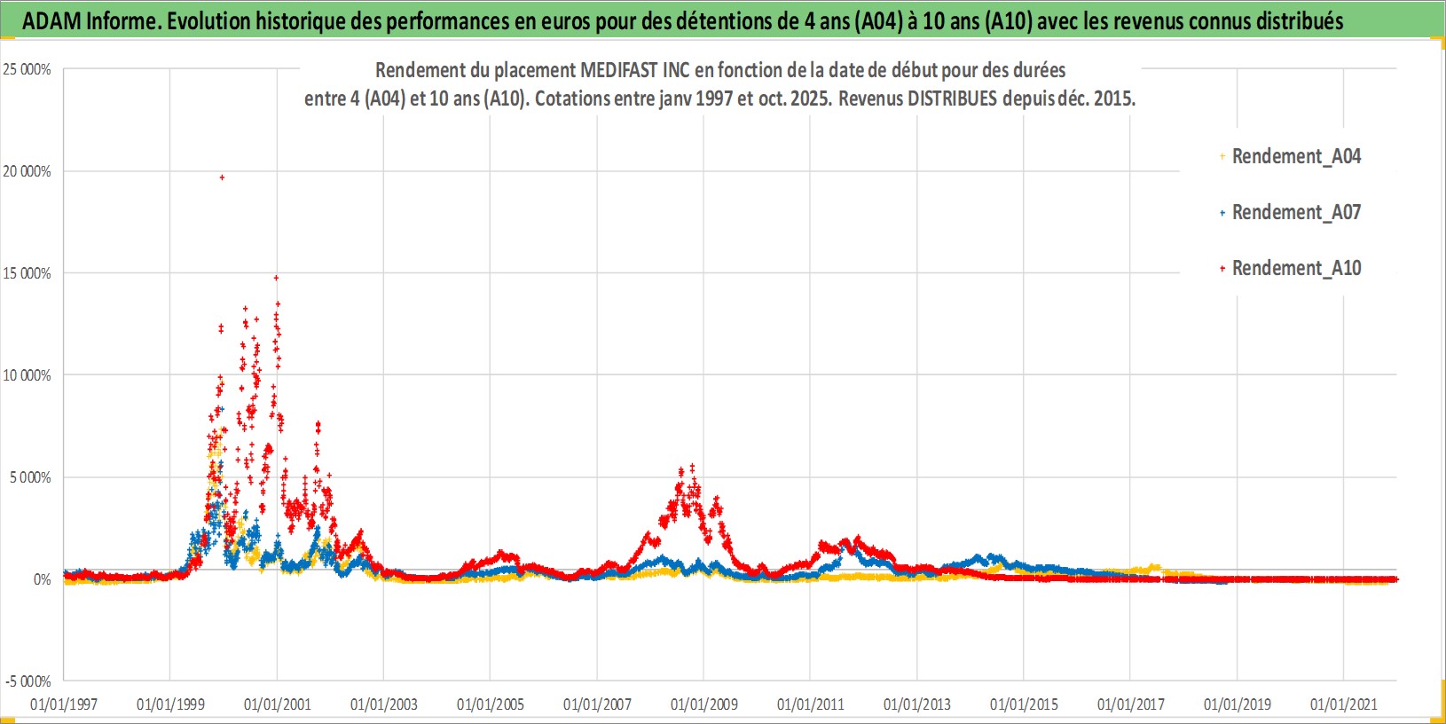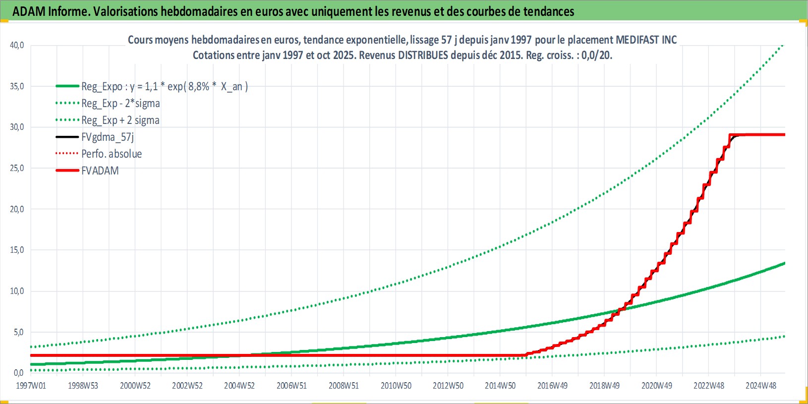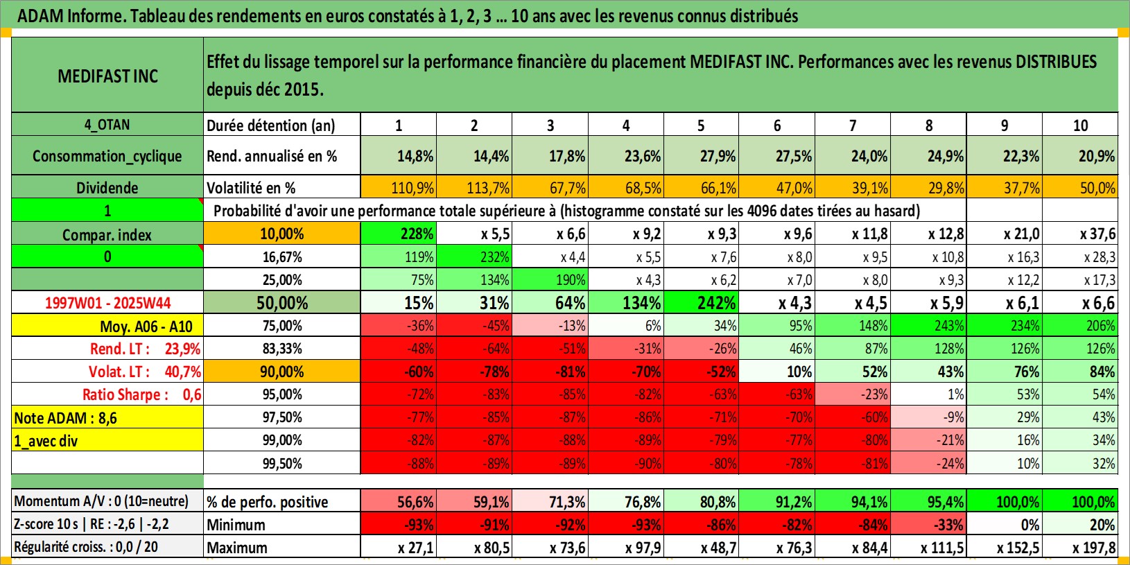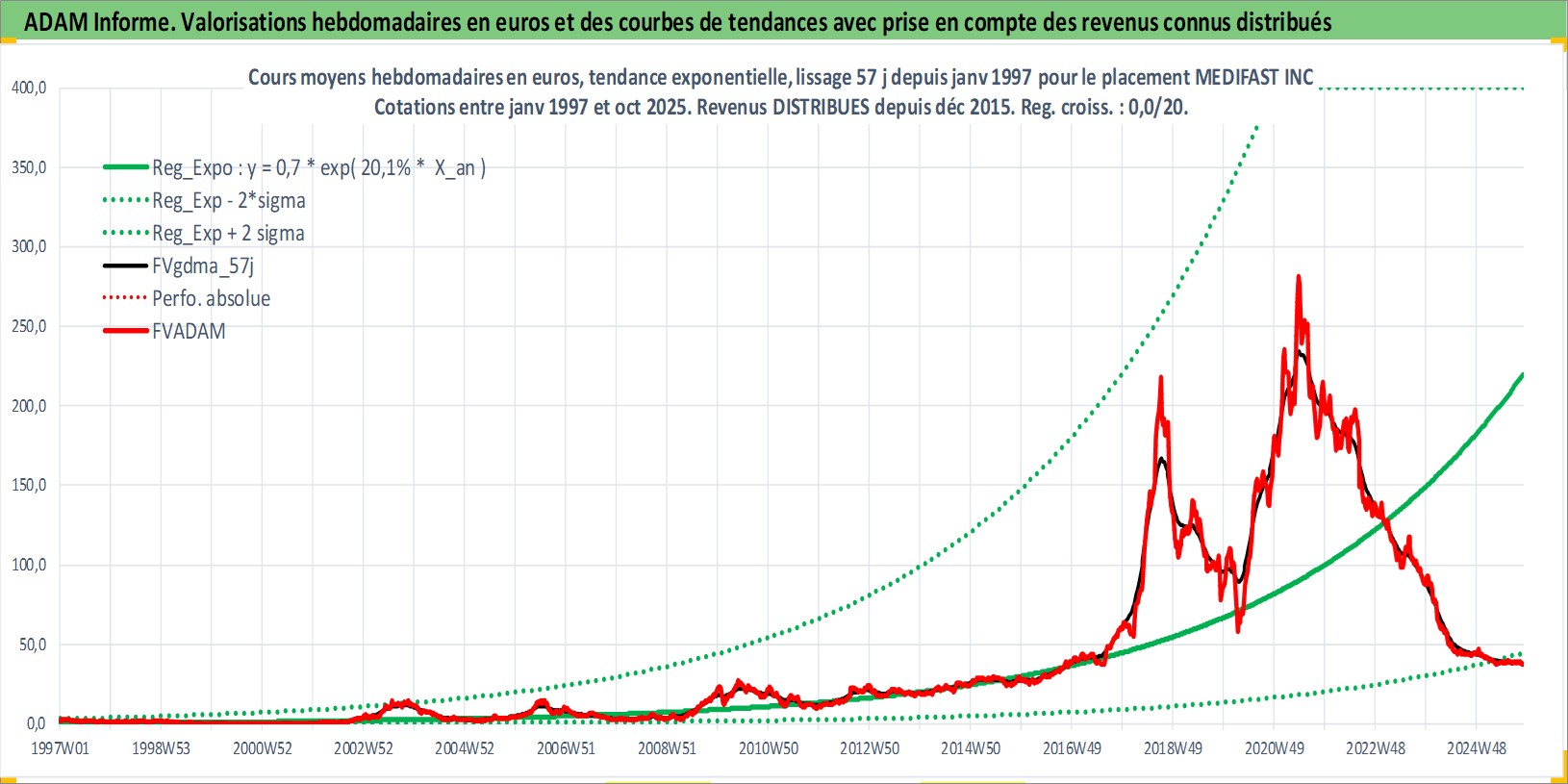 Site dédié aux investisseursPage dédiée sur site financeAnalyse des valorisations hebdomadaires de l'action MEDIFAST INC. Cet actif est cote en USD. Les valorisations sont en contrevaleur EURO et couvrent les semaines 1997W01 a 2025W44. Les revenus de cet actif financier sont pris en compte depuis la semaine 2015W52. La note ESG de cet actif n'est pas connue.