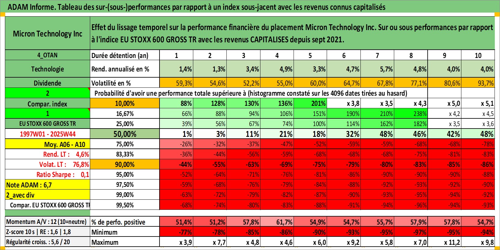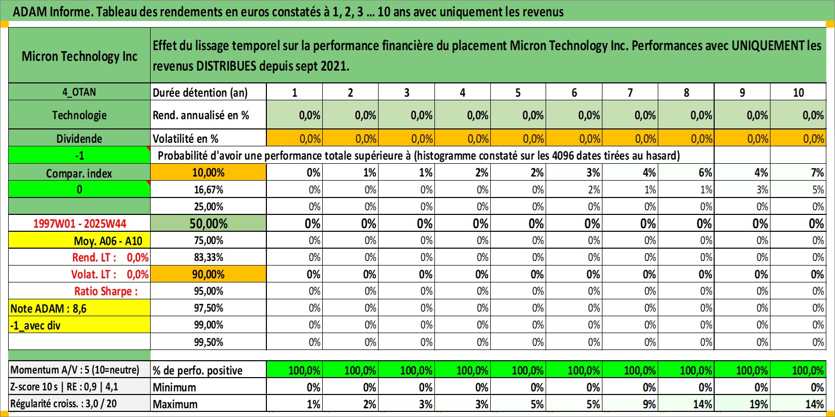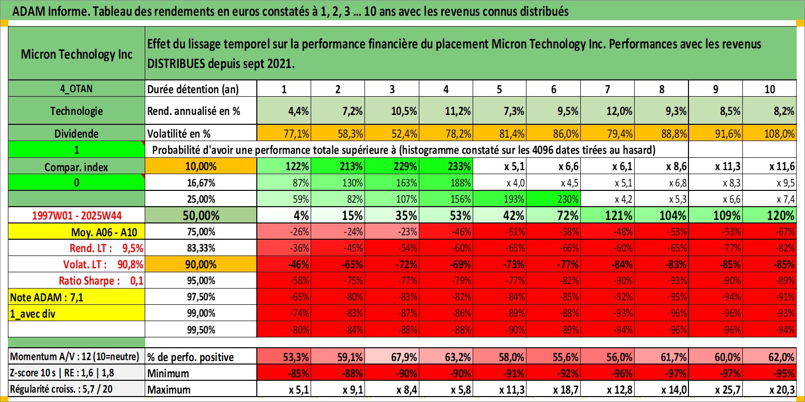 Site dédié aux investisseursPage dédiée sur site financeAnalyse des valorisations hebdomadaires de l'action Micron Technology Inc. Cet actif est cote en USD. Les valorisations sont en contrevaleur EURO et couvrent les semaines 1997W01 a 2025W44. Les revenus de cet actif financier sont pris en compte depuis la semaine 2021W39. La note globale ESG de cet actif est estimee a 12.0 (apres rebasage entre 0 et 20).