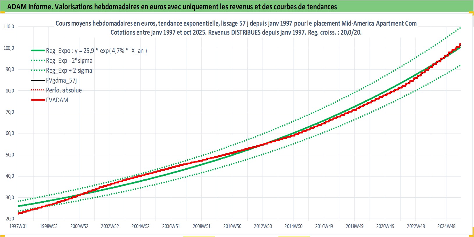 Site dédié aux investisseursPage dédiée sur site financeAnalyse des valorisations hebdomadaires de l'action Mid-America Apartment Communities Inc. Cet actif est cote en USD. Les valorisations sont en contrevaleur EURO et couvrent les semaines 1997W01 a 2025W44. Les revenus de cet actif financier sont pris en compte depuis la semaine 1997W04. La note globale ESG de cet actif est estimee a 13.0 (apres rebasage entre 0 et 20).