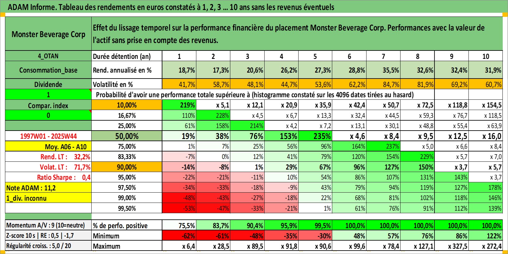Site dédié aux investisseursPage dédiée sur site financeAnalyse des valorisations hebdomadaires de l'action Monster Beverage Corp. Cet actif est cote en USD. Les valorisations sont en contrevaleur EURO et couvrent les semaines 1997W01 a 2025W44. Les revenus de cet actif financier ne sont pas connus car non existants ou non disponibles sur le site Yahoo Finance. La note globale ESG de cet actif est estimee a 6.0 (apres rebasage entre 0 et 20).