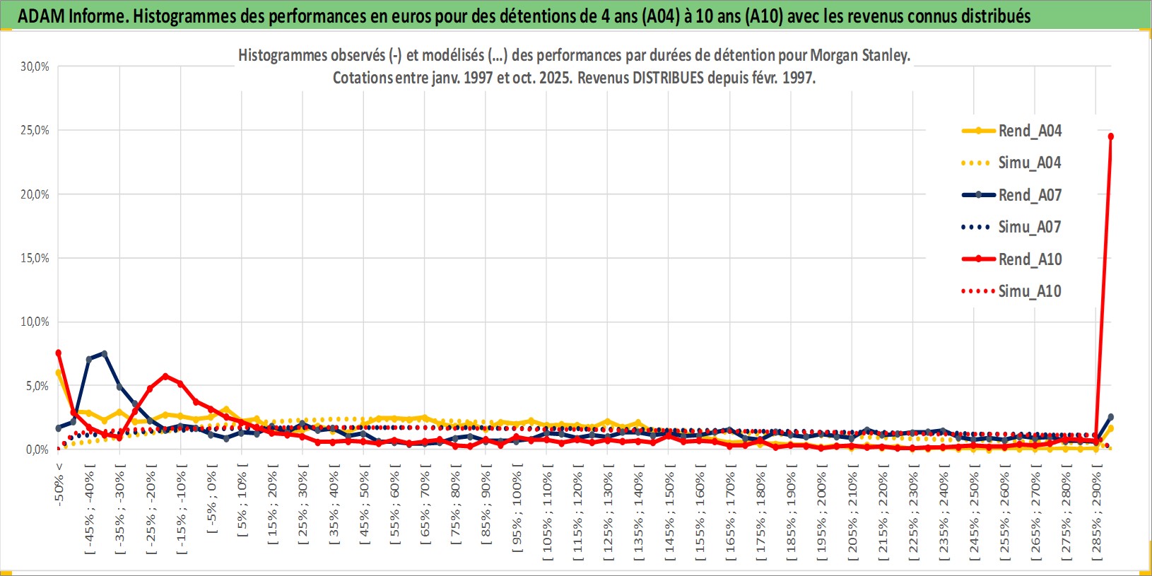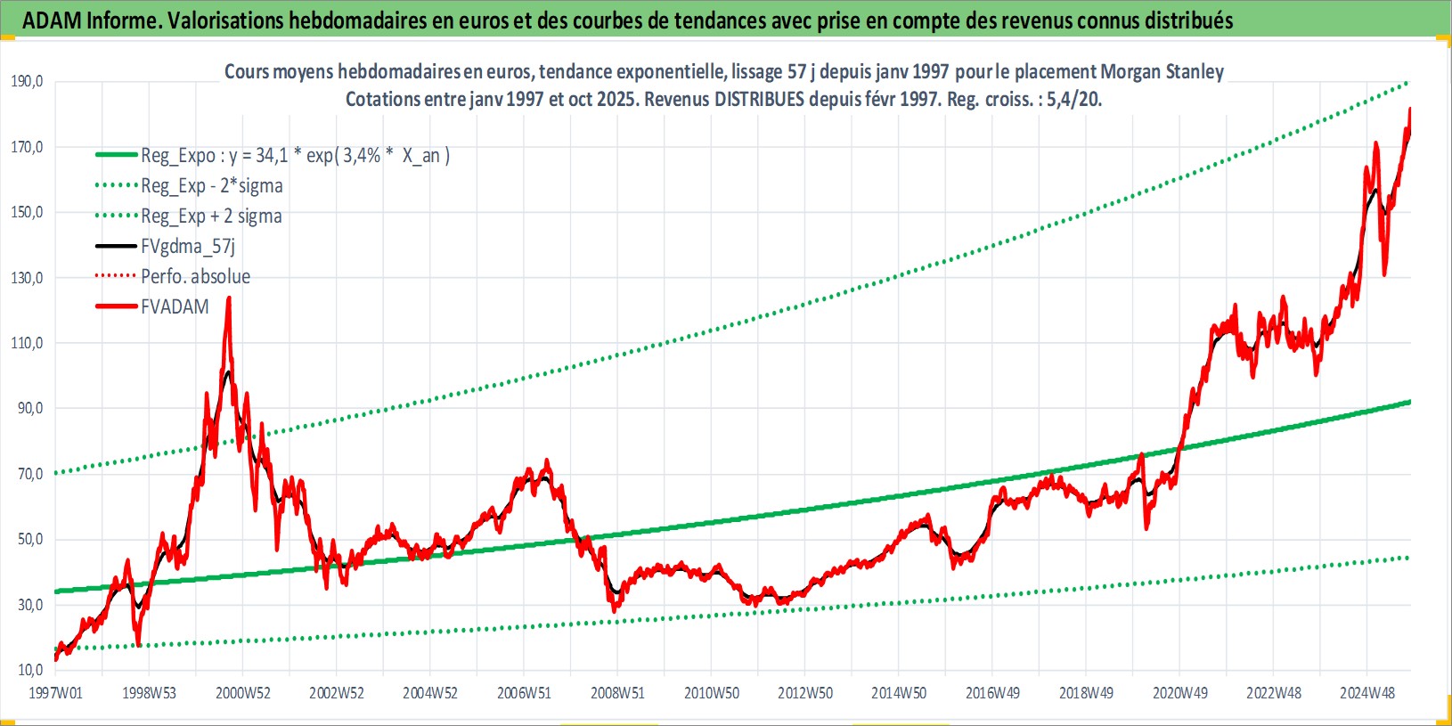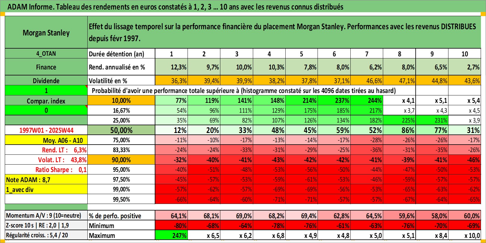 Site dédié aux investisseursPage dédiée sur site financeAnalyse des valorisations hebdomadaires de l'action Morgan Stanley. Cet actif est cote en USD. Les valorisations sont en contrevaleur EURO et couvrent les semaines 1997W01 a 2025W44. Les revenus de cet actif financier sont pris en compte depuis la semaine 1997W09. La note globale ESG de cet actif est estimee a 9.0 (apres rebasage entre 0 et 20).