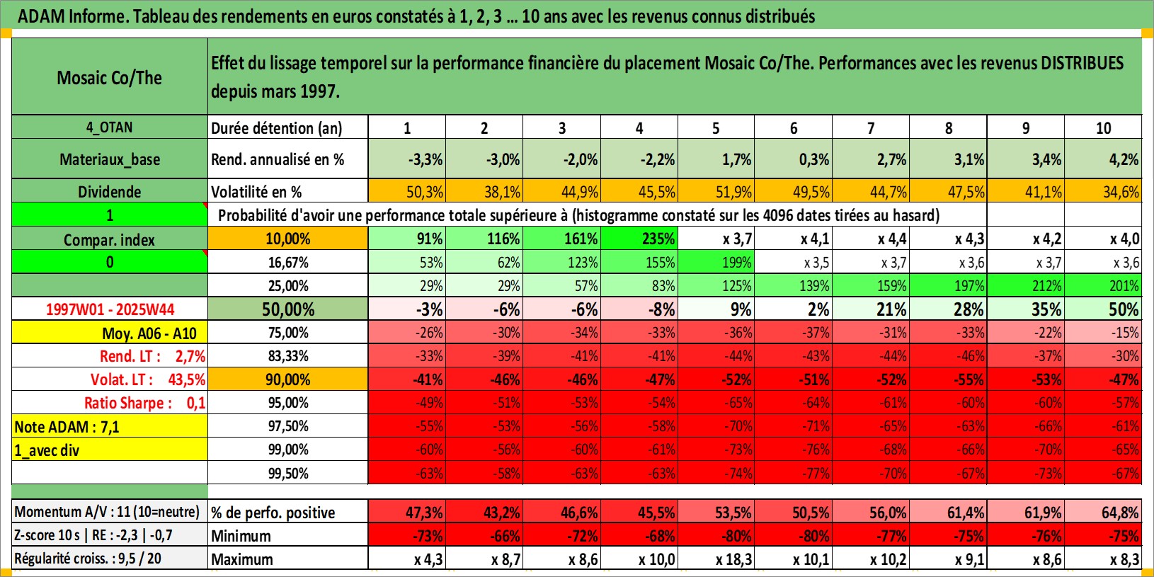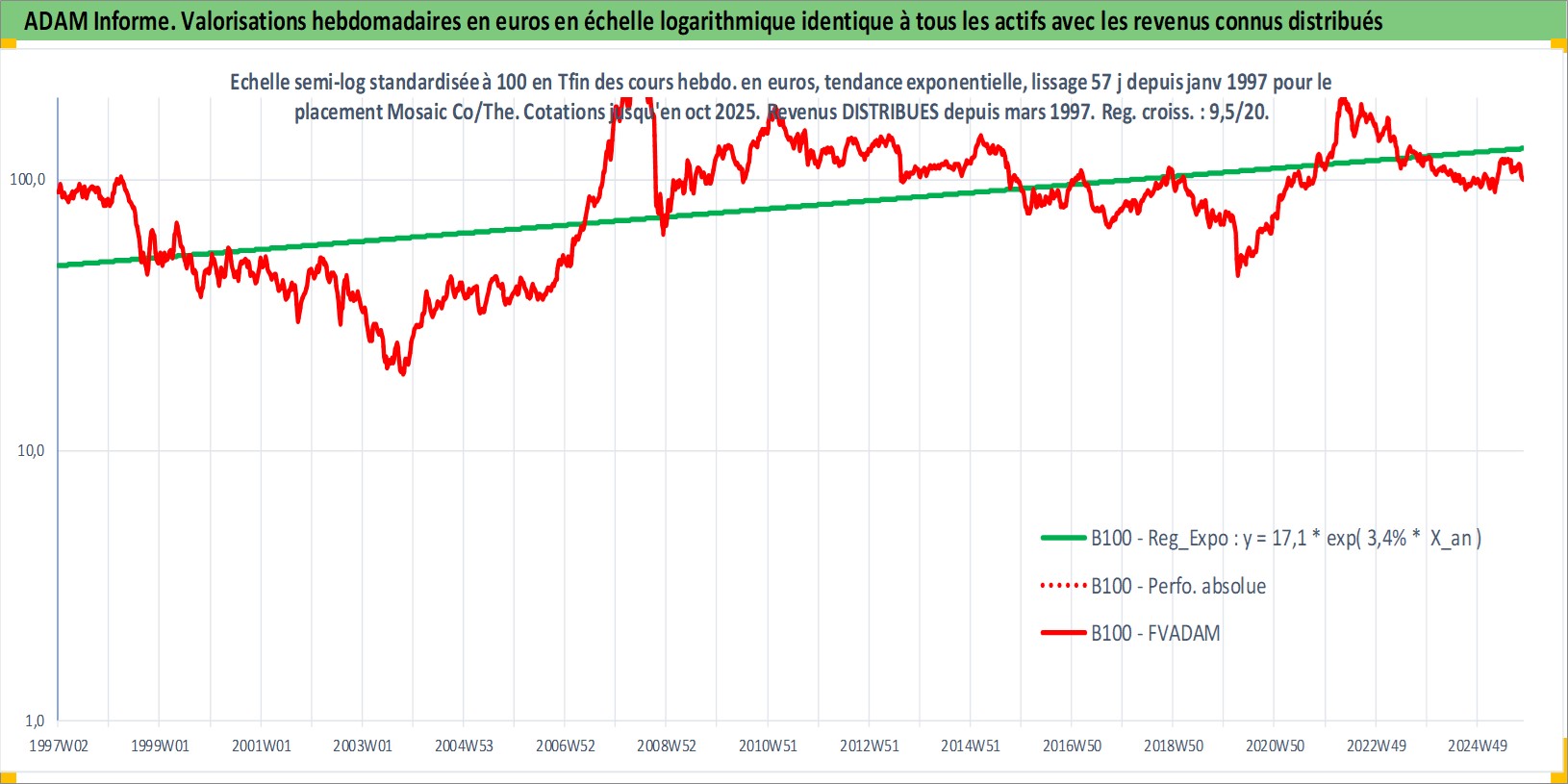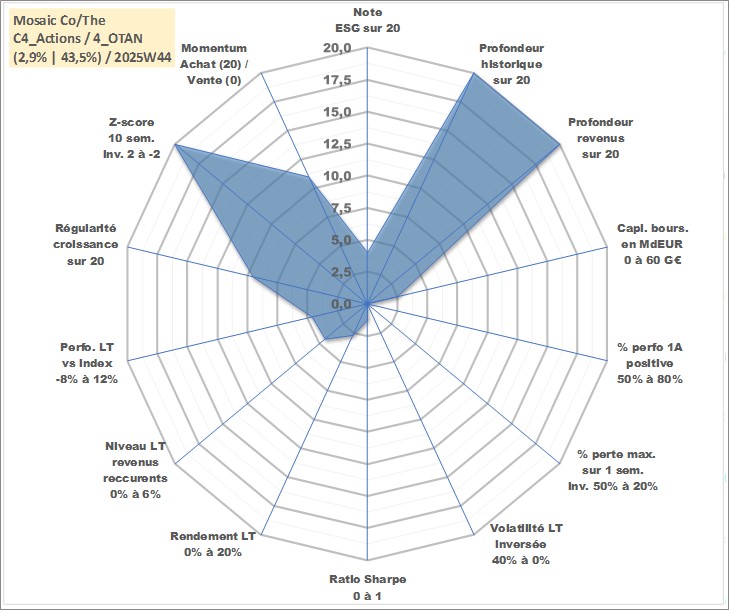 Site dédié aux investisseursPage dédiée sur site financeAnalyse des valorisations hebdomadaires de l'action Mosaic Co/The. Cet actif est cote en USD. Les valorisations sont en contrevaleur EURO et couvrent les semaines 1997W01 a 2025W44. Les revenus de cet actif financier sont pris en compte depuis la semaine 1997W11. La note globale ESG de cet actif est estimee a 4.0 (apres rebasage entre 0 et 20).