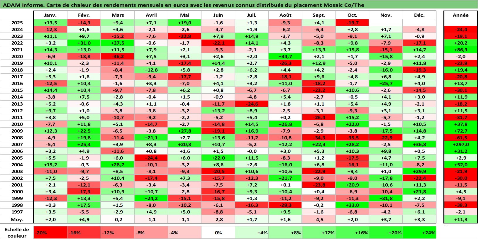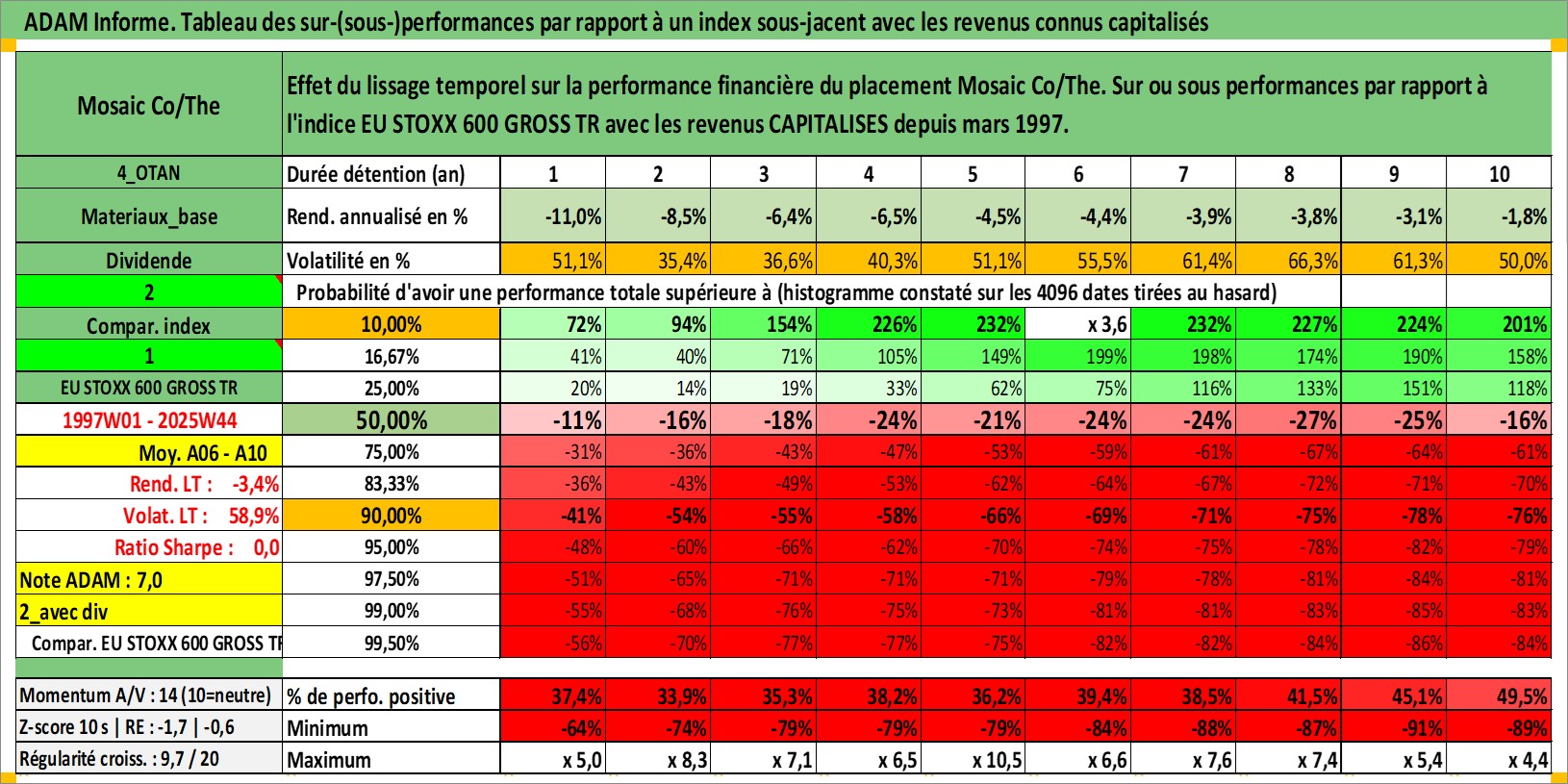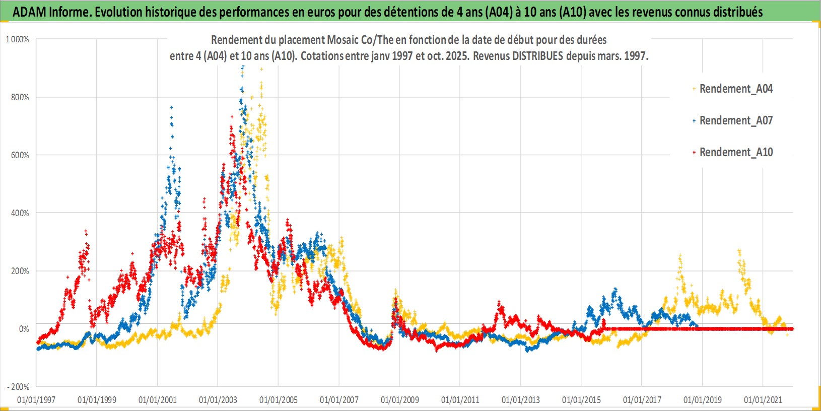 Site dédié aux investisseursPage dédiée sur site financeAnalyse des valorisations hebdomadaires de l'action Mosaic Co/The. Cet actif est cote en USD. Les valorisations sont en contrevaleur EURO et couvrent les semaines 1997W01 a 2025W44. Les revenus de cet actif financier sont pris en compte depuis la semaine 1997W11. La note globale ESG de cet actif est estimee a 4.0 (apres rebasage entre 0 et 20).