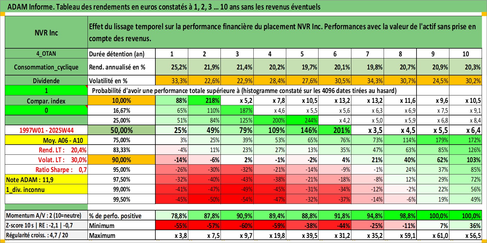 Site dédié aux investisseursPage dédiée sur site financeAnalyse des valorisations hebdomadaires de l'action NVR Inc. Cet actif est cote en USD. Les valorisations sont en contrevaleur EURO et couvrent les semaines 1997W01 a 2025W44. Les revenus de cet actif financier ne sont pas connus car non existants ou non disponibles sur le site Yahoo Finance. La note globale ESG de cet actif est estimee a 10.0 (apres rebasage entre 0 et 20).