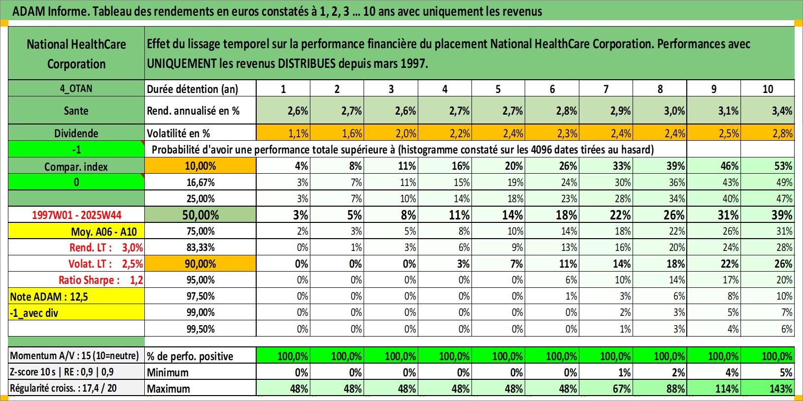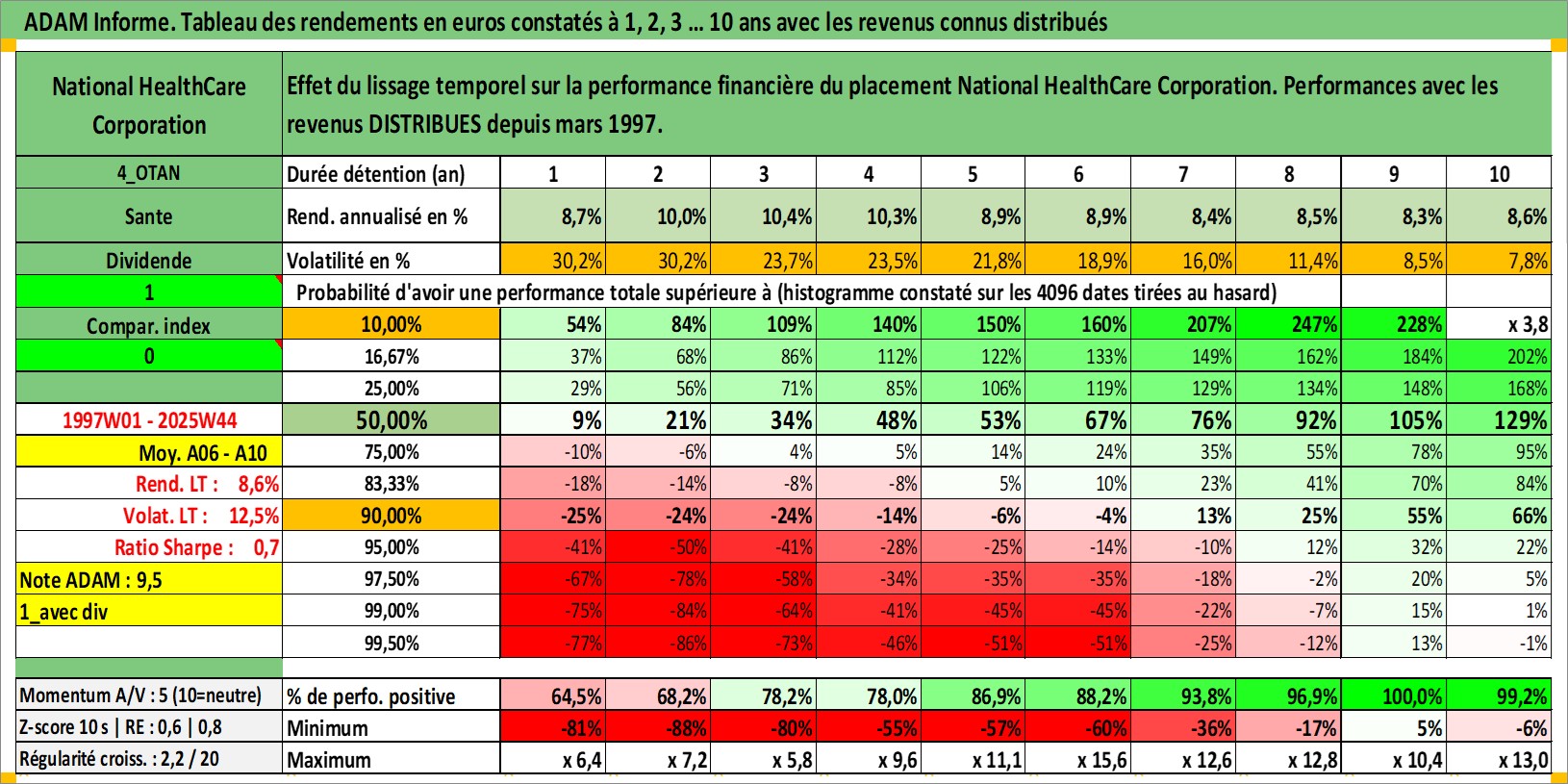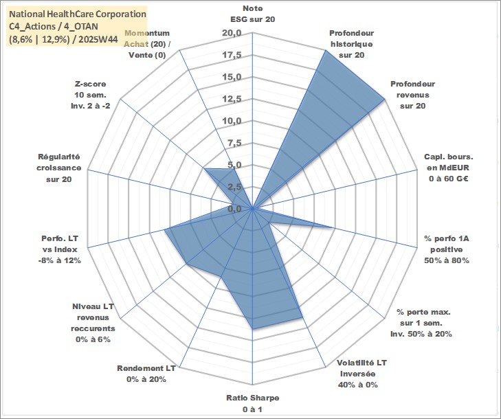 Site dédié aux investisseursPage dédiée sur site financeAnalyse des valorisations hebdomadaires de l'action National HealthCare Corporation. Cet actif est cote en USD. Les valorisations sont en contrevaleur EURO et couvrent les semaines 1997W01 a 2025W44. Les revenus de cet actif financier sont pris en compte depuis la semaine 1997W13. La note ESG de cet actif n'est pas connue.
