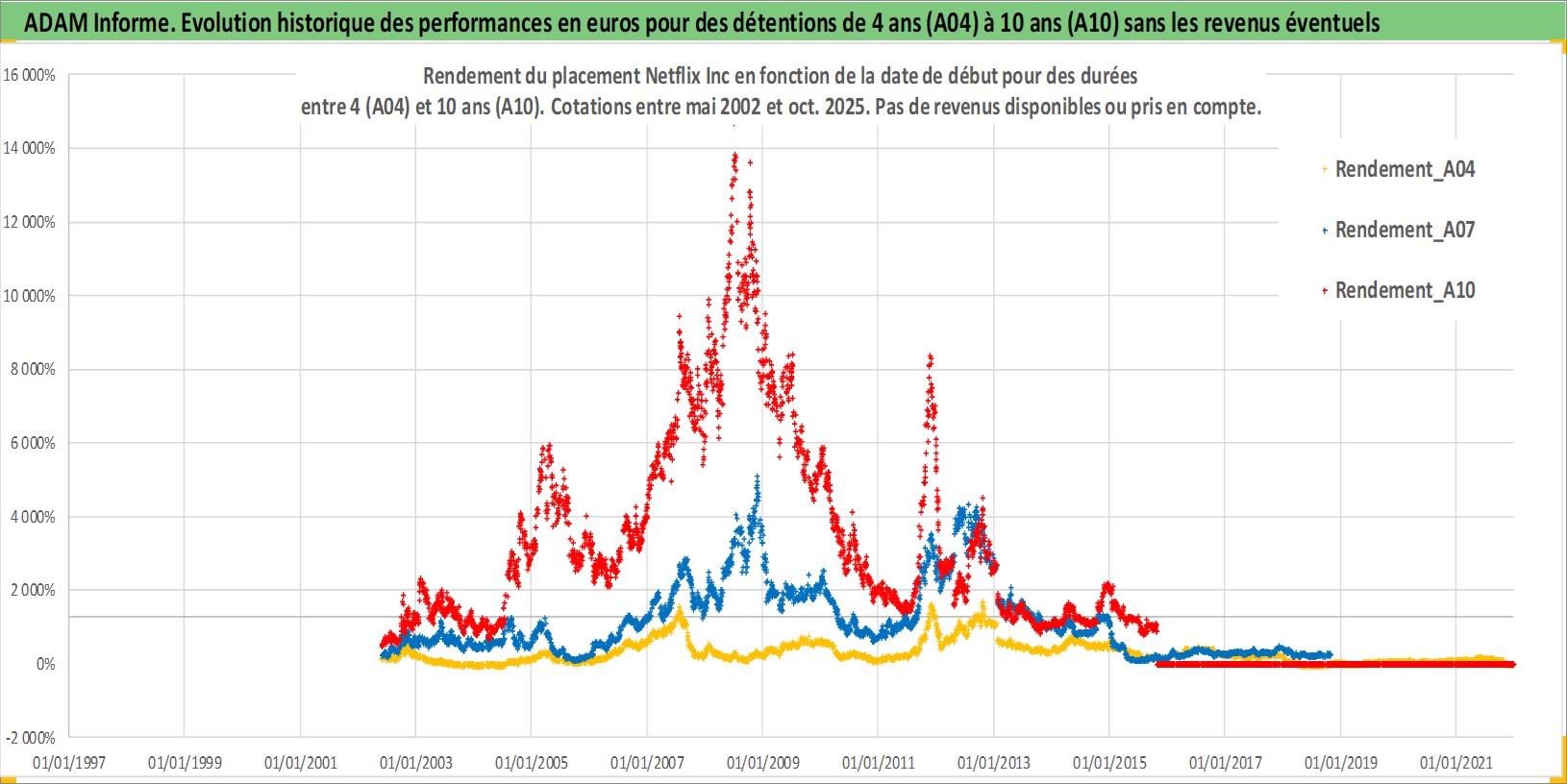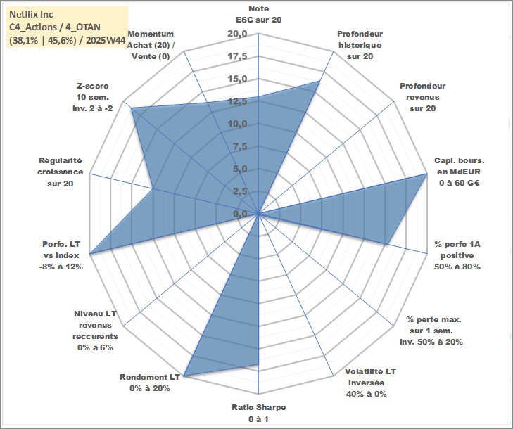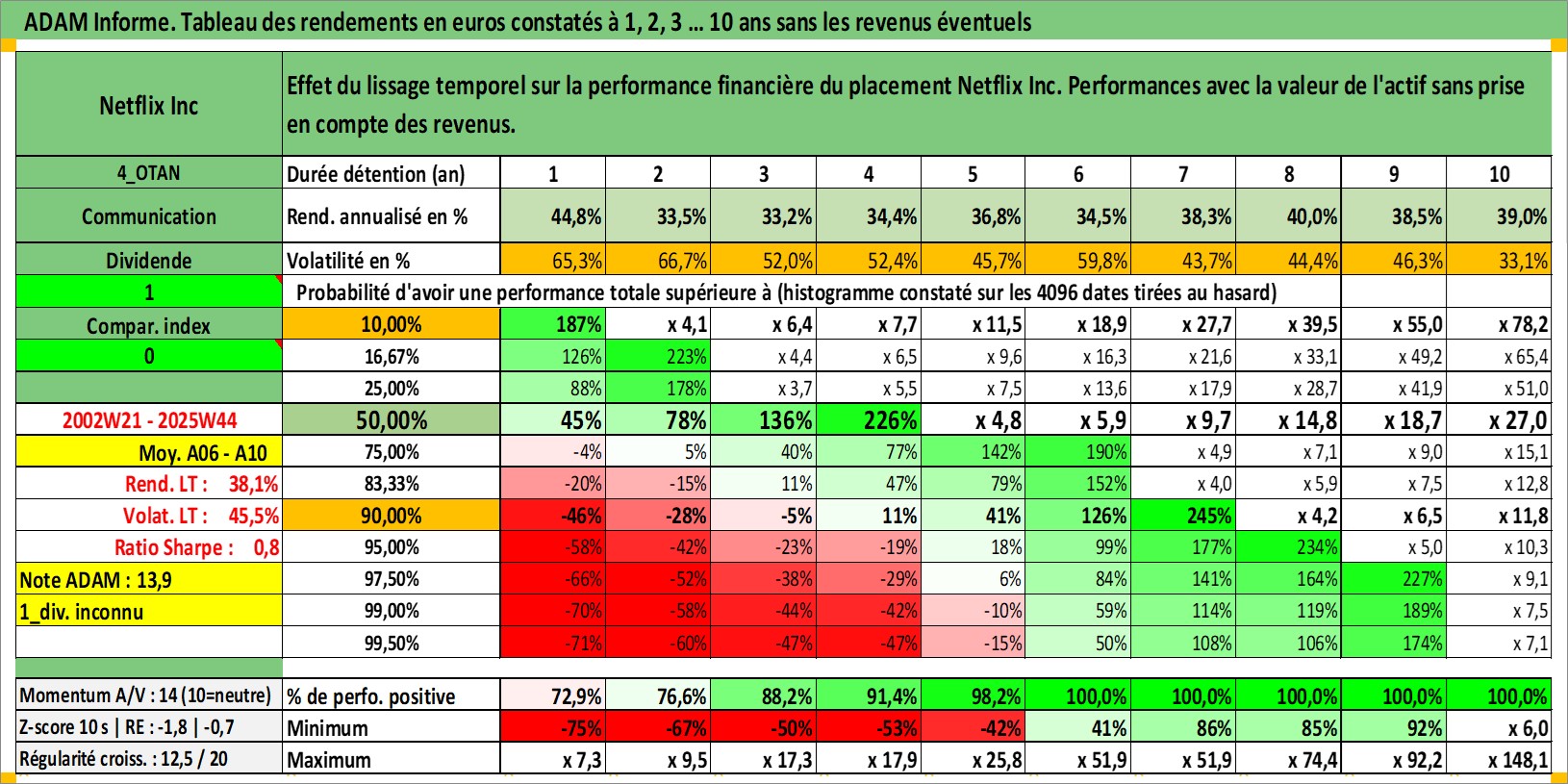 Site dédié aux investisseursPage dédiée sur site financeAnalyse des valorisations hebdomadaires de l'action Netflix Inc. Cet actif est cote en USD. Les valorisations sont en contrevaleur EURO et couvrent les semaines 2002W21 a 2025W44. Les revenus de cet actif financier ne sont pas connus car non existants ou non disponibles sur le site Yahoo Finance. La note globale ESG de cet actif est estimee a 13.0 (apres rebasage entre 0 et 20).