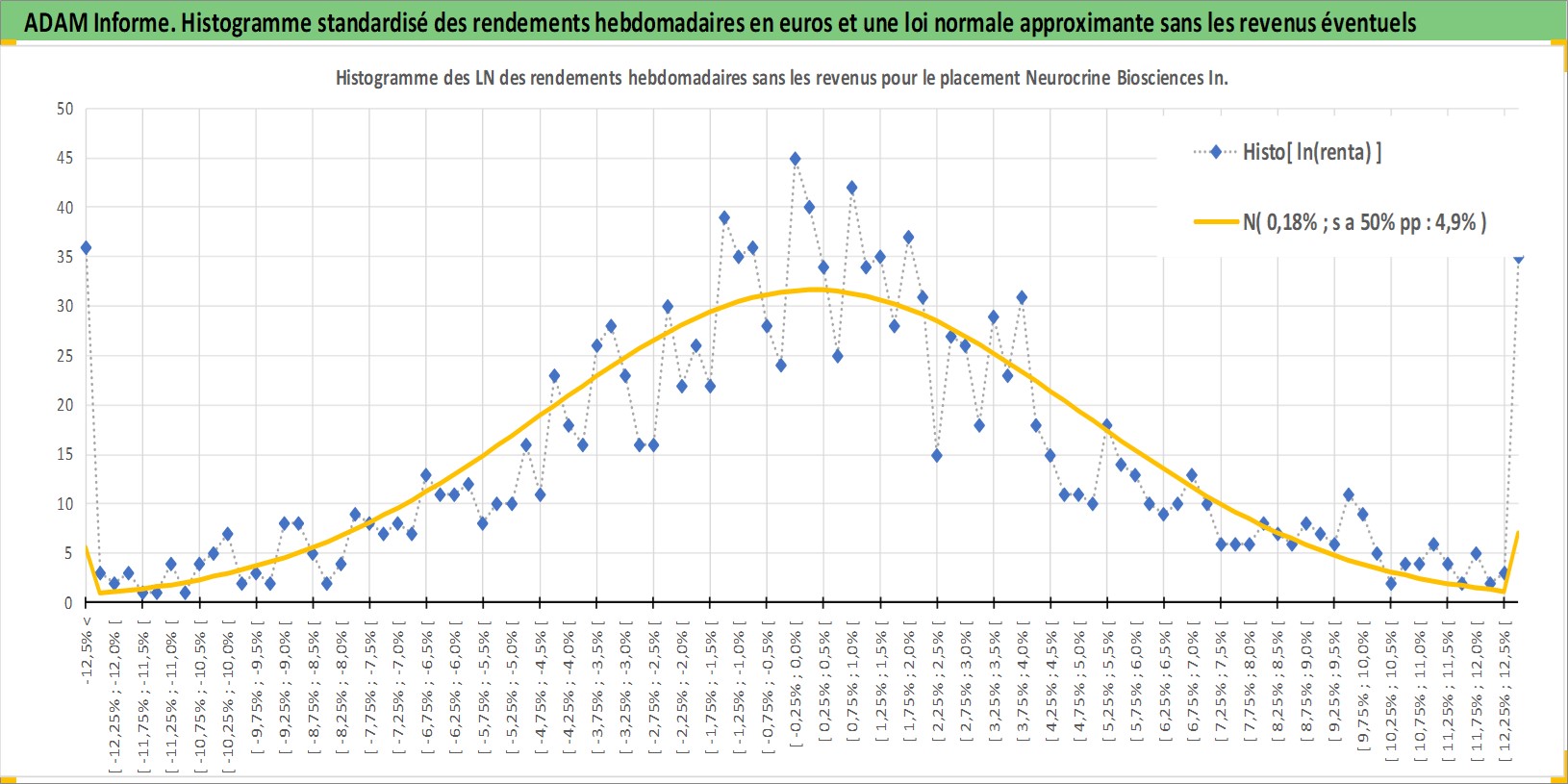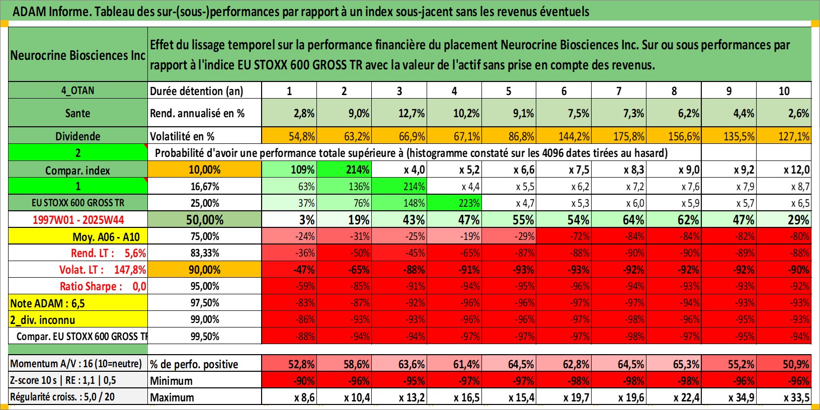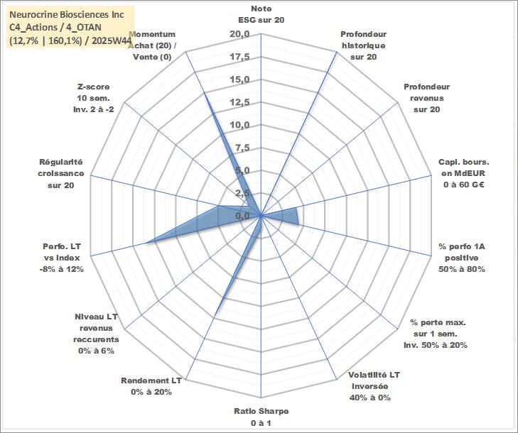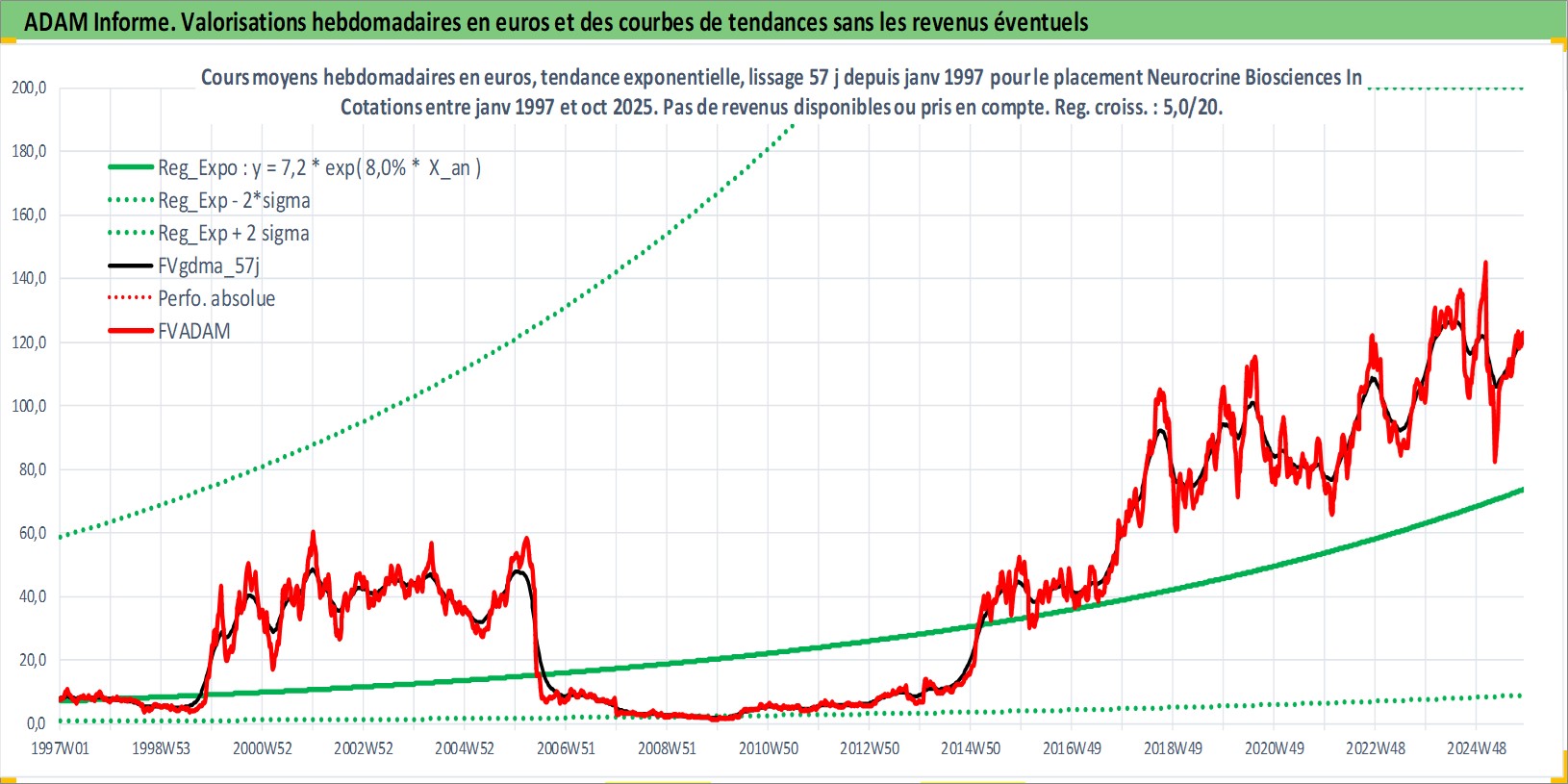 Site dédié aux investisseursPage dédiée sur site financeAnalyse des valorisations hebdomadaires de l'action Neurocrine Biosciences Inc. Cet actif est cote en USD. Les valorisations sont en contrevaleur EURO et couvrent les semaines 1997W01 a 2025W44. Les revenus de cet actif financier ne sont pas connus car non existants ou non disponibles sur le site Yahoo Finance. La note ESG de cet actif n'est pas connue.