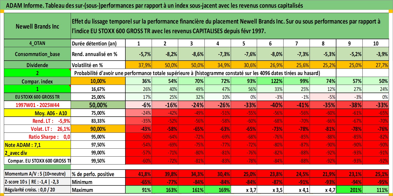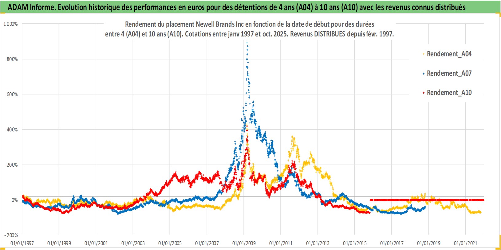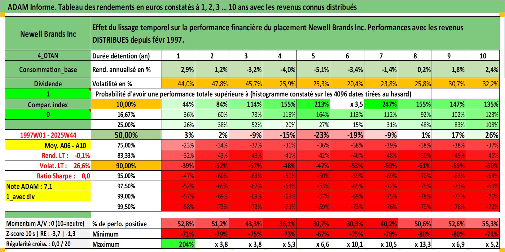 Site dédié aux investisseursPage dédiée sur site financeAnalyse des valorisations hebdomadaires de l'action Newell Brands Inc. Cet actif est cote en USD. Les valorisations sont en contrevaleur EURO et couvrent les semaines 1997W01 a 2025W44. Les revenus de cet actif financier sont pris en compte depuis la semaine 1997W08. La note globale ESG de cet actif est estimee a 14.0 (apres rebasage entre 0 et 20).